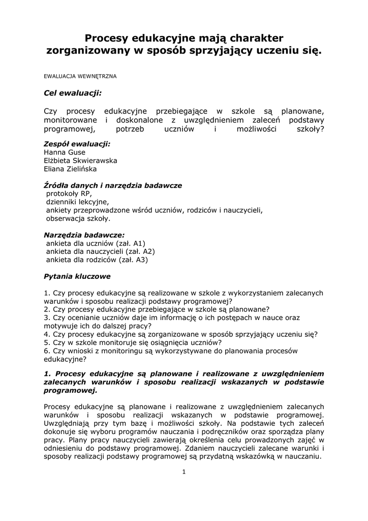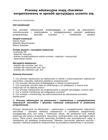 Procesy edukacyjne mają charakter zorganizowany w sposób sprzyjający uczeniu się. EWALUACJA WEWNĘTRZNA Cel ewaluacji: Czy procesy edukacyjne przebiegające w szkole są planowane, monitorowane i doskonalone z uwzględnieniem zaleceń podstawy programowej, potrzeb uczniów i możliwości szkoły? Zespół ewaluacji: Hanna Guse Elżbieta Skwierawska Eliana Zielińska Źródła danych i narzędzia badawcze protokoły RP, dzienniki lekcyjne, ankiety przeprowadzone wśród uczniów, rodziców i nauczycieli, obserwacja szkoły. Narzędzia badawcze: ankieta dla uczniów (zał. A1) ankieta dla nauczycieli (zał. A2) ankieta dla rodziców (zał. A3) Pytania kluczowe 1. Czy procesy edukacyjne są realizowane w szkole z wykorzystaniem zalecanych warunków i sposobu realizacji podstawy programowej? 2. Czy procesy edukacyjne przebiegające w szkole są planowane? 3. Czy ocenianie uczniów daje im informację o ich postępach w nauce oraz motywuje ich do dalszej pracy? 4. Czy procesy edukacyjne są zorganizowane w sposób sprzyjający uczeniu się? 5. Czy w szkole monitoruje się osiągnięcia uczniów? 6. Czy wnioski z monitoringu są wykorzystywane do planowania procesów edukacyjne? 1. Procesy edukacyjne są planowane i realizowane z uwzględnieniem zalecanych warunków i sposobu realizacji wskazanych w podstawie programowej. Procesy edukacyjne są planowane i realizowane z uwzględnieniem zalecanych warunków i sposobu realizacji wskazanych w podstawie programowej. Uwzględniają przy tym bazę i możliwości szkoły. Na podstawie tych zaleceń dokonuje się wyboru programów nauczania i podręczników oraz sporządza plany pracy. Plany pracy nauczycieli zawierają określenia celu prowadzonych zajęć w odniesieniu do podstawy programowej. Zdaniem nauczycieli zalecane warunki i sposoby realizacji podstawy programowej są przydatną wskazówką w nauczaniu. 1 2. Procesy edukacyjne przebiegające w szkole są planowane. Procesy edukacyjne przebiegające w szkole są planowane. Corocznie ustalane są i zatwierdzane do realizacji plany pracy. Zasadniczymi elementami planu procesów edukacyjnych szkoły są zajęcia dydaktyczne, zajęcia dodatkowe, koła zainteresowań, uroczystości i konkursy, uroczystości z udziałem rodziców, spotkania z rodzicami, wycieczki, przygotowanie uczniów do sprawdzianu trzecioklasisty, szóstoklasisty i egzaminów gimnazjalnych. Plany procesów edukacyjnych tworzy się na podstawie: programu wychowawczego, programu profilaktyki i programów nauczania wynikających z podstawy programowej. Są to plany działań wychowawczych i profilaktycznych oraz plany wynikowe zajęć edukacyjnych znajdujące swe odzwierciedlenie w planowanych do realizacji zagadnieniach. Programy nauczania z obowiązkowych zajęć edukacyjnych realizowane są w warunkach sprzyjającej i dobrze wyposażonej bazy lokalowej oraz pomocy dydaktycznych. Baza dydaktyczna uzupełniana jest przez nauczycieli, którzy samodzielnie przygotowują materiały dydaktyczne. Procesy edukacyjne są planowane również w opracowanych przez nauczycieli w planach zajęć dodatkowych. Plany te zawierają cele edukacyjne, treści programowe. Opracowany tygodniowy rozkład zajęć jest tak ułożony, ze sprzyja uczeniu się. Na początku każdego roku szkolnego ustalane są następujące plany pracy: - imprezy i uroczystości szkolne, - wycieczki szkolne, - przydział czynności dodatkowych dla wszystkich nauczycieli, - wnioski do pracy na dany rok szkolny; - plan wychowawczy i profilaktyki z celami edukacyjnymi, jakie szkoła sobie stawia w danym roku szkolnym. 3. Czy ocenianie uczniów daje im informację o ich postępach w nauce oraz motywuje ich do dalszej pracy. Ocenianie uczniów daje im informacje o ich postępach w nauce. Informacje zwrotne przekazywane przez nauczycieli zawierają: wskazanie błędów, sposób ich poprawy, punktację, kryteria oceniania, mocne i słabe strony pracy. Rodzice uważają, że informacja o wynikach dziecka, uzyskana od nauczycieli pomaga mu się uczyć. Na początku roku szkolnego przekazywana jest uczniom dokładna informacja o wymaganiach edukacyjnych niezbędnych do uzyskania poszczególnych ocen wynikających z realizowanego programu nauczania oraz o możliwości otrzymania wyższej oceny. Według nauczycieli zwiększa to aktywność uczniów oraz poczucie odpowiedzialności za proces uczenia się. Uczniowie wiedzą, co nauczyciele od nich wymagają, za co ich oceniają. Znają system nagród i kar. Rodzice są informowani, jakie postępy edukacyjne osiągają ich dzieci podczas zebrań, rozmów indywidualnych, wpisu do zeszytu lub kontaktu telefonicznego. Ocena zachowania uczniów odbywa się na bieżąco oraz semestralnie w odniesieniu do ustalonych pożądanych postaw społecznych na podstawie Szkolnego Systemu Oceniania. 4. Procesy edukacyjne są zorganizowane w sposób sprzyjający uczeniu się. 2 W szkole procesy edukacyjne są zorganizowane w sposób sprzyjający uczeniu się. Nauczyciele stosują różnorodne, często aktywizujące metody uczenia. Do dyspozycji nauczycieli i uczniów jest sprzęt audiowizualny stały i przenośny (odtwarzacze CD, DVD, telewizor, projektor z laptopem, tablica multimedialna), pracownie komputerowe z dostępem do Internetu. Wszystko to pozwala na takie zorganizowanie procesów edukacyjnych, które będzie sprzyjało zróżnicowaniu metod nauczania. W szkole są dostosowane plany wynikowe do podstawy programowej i zalecanych warunków jej realizacji, oferty zajęć wyrównawczych dla uczniów mających trudności w nauce oraz kół zainteresowań dla uczniów zdolnych i zainteresowanych poszerzaniem wiadomości. Dla młodzieży organizuje się wycieczki, zajęcia pozalekcyjne. Uczniowie mają możliwość skorzystania z pomocy nauczycieli, mogą uczestniczyć w kołach przedmiotowych i zajęciach wyrównawczych. Nauczyciele stosują zróżnicowanie metody wspierania i motywowania uczniów w procesie uczenia się, poprzez elastyczne wykorz