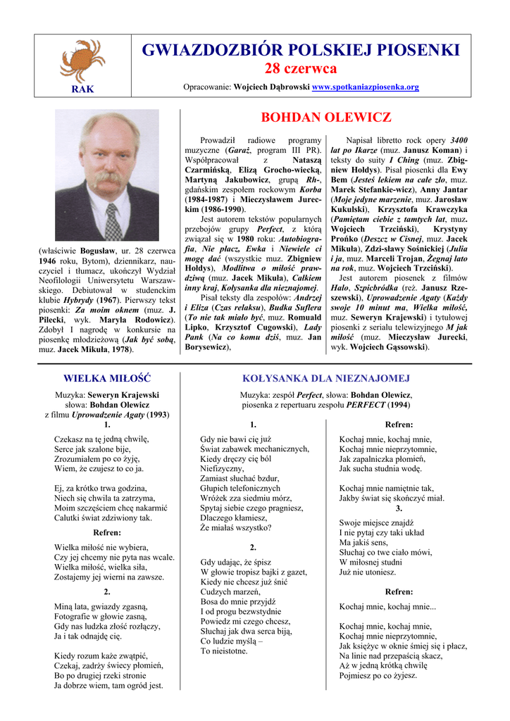 GWIAZDOZBIÓR POLSKIEJ PIOSENKI 28 czerwca Opracowanie: Wojciech Dąbrowski www.spotkaniazpiosenka.org RAK BOHDAN OLEWICZ (właściwie Bogusław, ur. 28 czerwca 1946 roku, Bytom), dziennikarz, nauczyciel i tłumacz, ukończył Wydział Neofilologii Uniwersytetu Warszawskiego. Debiutował w studenckim klubie Hybrydy (1967). Pierwszy tekst piosenki: Za moim oknem (muz. J. Pilecki, wyk. Maryla Rodowicz). Zdobył I nagrodę w konkursie na piosenkę młodzieżową (Jak być sobą, muz. Jacek Mikuła, 1978). Prowadził radiowe programy muzyczne (Garaż, program III PR). Współpracował z Nataszą Czarmińską, Elizą Grocho-wiecką, Martyną Jakubowicz, grupą Rh-, gdańskim zespołem rockowym Korba (1984-1987) i Mieczysławem Jureckim (1986-1990). Jest autorem tekstów popularnych przebojów grupy Perfect, z którą związał się w 1980 roku: Autobiografia, Nie płacz, Ewka i Niewiele ci mogę dać (wszystkie muz. Zbigniew Hołdys), Modlitwa o miłość prawdziwą (muz. Jacek Mikuła), Całkiem inny kraj, Kołysanka dla nieznajomej. Pisał teksty dla zespołów: Andrzej i Eliza (Czas relaksu), Budka Suflera (To nie tak miało być, muz. Romuald Lipko, Krzysztof Cugowski), Lady Pank (Na co komu dziś, muz. Jan Borysewicz), Napisał libretto rock opery 3400 lat po Ikarze (muz. Janusz Koman) i teksty do suity I Ching (muz. Zbigniew Hołdys). Pisał piosenki dla Ewy Bem (Jesteś lekiem na całe zło, muz. Marek Stefankie-wicz), Anny Jantar (Moje jedyne marzenie, muz. Jarosław Kukulski), Krzysztofa Krawczyka (Pamiętam ciebie z tamtych lat, muz. Wojciech Trzciński), Krystyny Prońko (Deszcz w Cisnej, muz. Jacek Mikuła), Zdzi-sławy Sośnickiej (Julia i ja, muz. Marceli Trojan, Żegnaj lato na rok, muz. Wojciech Trzciński). Jest autorem piosenek z filmów Halo, Szpicbródka (reż. Janusz Rzeszewski), Uprowadzenie Agaty (Każdy swoje 10 minut ma, Wielka miłość, muz. Seweryn Krajewski) i tytułowej piosenki z serialu telewizyjnego M jak miłość (muz. Mieczysław Jurecki, wyk. Wojciech Gąssowski). WIELKA MIŁOŚĆ KOŁYSANKA DLA NIEZNAJOMEJ Muzyka: Seweryn Krajewski słowa: Bohdan Olewicz z filmu Uprowadzenie Agaty (1993) 1. Muzyka: zespół Perfect, słowa: Bohdan Olewicz, piosenka z repertuaru zespołu PERFECT (1994) Czekasz na tę jedną chwilę, Serce jak szalone bije, Zrozumiałem po co żyję, Wiem, że czujesz to co ja. Ej, za krótko trwa godzina, Niech się chwila ta zatrzyma, Moim szczęściem chcę nakarmić Calutki świat zdziwiony tak. Refren: Wielka miłość nie wybiera, Czy jej chcemy nie pyta nas wcale. Wielka miłość, wielka siła, Zostajemy jej wierni na zawsze. 2. Miną lata, gwiazdy zgasną, Fotografie w głowie zasną, Gdy nas ludzka złość rozłączy, Ja i tak odnajdę cię. Kiedy rozum każe zwątpić, Czekaj, zadrży świecy płomień, Bo po drugiej rzeki stronie Ja dobrze wiem, tam ogród jest. 1. Gdy nie bawi cię już Świat zabawek mechanicznych, Kiedy dręczy cię ból Niefizyczny, Zamiast słuchać bzdur, Głupich telefonicznych Wróżek zza siedmiu mórz, Spytaj siebie czego pragniesz, Dlaczego kłamiesz, Że miałaś wszystko? 2. Gdy udając, że śpisz W głowie tropisz bajki z gazet, Kiedy nie chcesz już śnić Cudzych marzeń, Bosa do mnie przyjdź I od progu bezwstydnie Powiedz mi czego chcesz, Słuchaj jak dwa serca biją, Co ludzie myślą – To nieistotne. Refren: Kochaj mnie, kochaj mnie, Kochaj mnie nieprzytomnie, Jak zapalniczka płomień, Jak sucha studnia wodę. Kochaj mnie namiętnie tak, Jakby świat się skończyć miał. 3. Swoje miejsce znajdź I nie pytaj czy taki układ Ma jakiś sens, Słuchaj co twe ciało mówi, W miłosnej studni Już nie utoniesz. Refren: Kochaj mnie, kochaj mnie... Kochaj mnie, kochaj mnie, Kochaj mnie nieprzytomnie, Jak księżyc w oknie śmiej się i płacz, Na linie nad przepaścią skacz, Aż w jedną krótką chwilę Pojmiesz po co żyjesz.