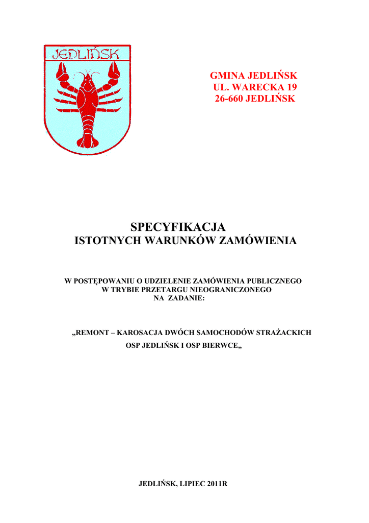 GMINA JEDLIŃSK UL. WARECKA 19 26-660 JEDLIŃSK SPECYFIKACJA ISTOTNYCH WARUNKÓW ZAMÓWIENIA W POSTĘPOWANIU O UDZIELENIE ZAMÓWIENIA PUBLICZNEGO W TRYBIE PRZETARGU NIEOGRANICZONEGO NA ZADANIE: „REMONT – KAROSACJA DWÓCH SAMOCHODÓW STRAŻACKICH OSP JEDLIŃSK I OSP BIERWCE„ JEDLIŃSK, LIPIEC 2011R I. Postanowienia ogólne 1.Informacja o Zamawiającym Zamawiającym jest Gmina Jedlińsk reprezentowana przez Wójta Gminy ul. Warecka 19, 26-660 Jedlińsk NIP 796-28-96-026 REGON 670223764 tel/fax (048)32 13 021 2.Osoby uprawnione do kontaktów z Wykonawcami Osobą upoważnioną do kontaktu z Wykonawcami w zakresie dotyczącym przedmiotu zamówienia oraz w zakresie dotyczącym zagadnień formalno-prawnych jest: Adam Zieliński tel. (048) 32 13 087 3.Tryb udzielenia zamówienia, podstawa prawna Postępowanie o udzielenie zamówienia publicznego prowadzone jest na podstawie przepisów ustawy z dnia 29 stycznia 2004r. – Prawo zamówień Publicznych /tekst jednolity Dz.U.z 2007r. nr 223 poz. 1655 z późn.zm/. Postępowania w trybie przetargu nieograniczonego prowadzone jest na podstawie art. 39 p.z.p. Zapytanie o cenę na usługę o wartości szacunkowej zamówienia mniejszej od kwot określonych w przepisach wydanych na podstawie art. 11 ust. 8 , zgodnie z ustawą Prawo zamówień publicznych. 4.Generalne zasady uczestnictwa w postępowaniu: Ofertę może złożyć osoba fizyczna, osoba prawna lub jednostka organizacyjna nie posiadająca osobowości prawnej o ile spełniają warunki określone w ustawie prawo zamówień publicznych oraz w niniejszej specyfikacji istotnych warunków zamówienia. Każdy Wykonawca może złożyć tylko jedną ofertę. 5.Oferty wariantowe i częściowe Zamawiający nie dopuszcza możliwości składania ofert wariantowych i częściowych. 6.Zamówienia uzupełniające Zamawiający nie przewiduje zamówień uzupełniających o których mowa w art. 67 ust.1 pkt 6 Prawo zamówień Publicznych /tekst jednolity Dz.U.z 2007r. nr 223 poz. 1655 z późn.zm/. 7.Pisemność postępowania Oświadczenia, wnioski, zawiadomienia oraz informacje zamawiający i wykonawcy przekazują w formie pisemnej. Wykonawca lub Zamawiający przekazując informację lub dokumenty, na żądanie drugiej strony potwierdzają fakt ich otrzymania. 8.Wyjaśnienia Wykonawca może zwrócić się do Zamawiającego o wyjaśnienie treści SIWZ. Zamawiający niezwłocznie udzieli pisemnych wyjaśnień, nie później jednak niż na 2 dni przed upływem terminu składania ofert, pod warunkiem że wniosek o wyjaśnienie treści SIWZ wpłynął do zamawiającego nie później niż do końca dnia, w którym upływa połowa wyznaczonego terminu składania ofert. 9.Rozliczenia między Zamawiającym a Wykonawcą Rozliczenia między Zamawiającym, a Wykonawcą prowadzone będą w PLN. II. Przedmiot zamówienia i termin realizacji Przedmiotem zamówienia jest wykonanie usługi polegającej remoncie – karosacji 2 szt. samochodów strażacki marki Star 224 - Wymiana kabiny, - Remont podwozia - Wykonanie nadbudowy pożarniczej - Wykonanie instalacji wodno – pianowej - Wykonanie instalacji elektrycznej 24v - Lakierowanie i konserwacja pojazdów 1. Kabina załogi: − Jednomodułowa, zespolona, czterodrzwiowa typu Star na 6 osób wykonana z oryginalnych elementów, dach podwyższony − Montaż nowych piór i ramion wycieraczek − Tapicerka w drzwiach zmywalna czarna − Na drzwiach wewnętrznych specjalna kieszeń na dokumenty (kierowca) − Drzwi do kabiny załogi z szybami opuszczanymi ręcznie − − Stopnie rurowe wejściowe wyłożone blachą aluminiową Założenie nowych „chlapaczy” przy kabinie − Wymiana dywaników na podłodze w kabinie (kierowca + dowódca) − Tapicerowane siedzenie kierowcy i dowódcy (obicie zmywalne) − − Ocieplenie ścian, sufitu, pokrowiec pokrywy silnika Wyłożenie wykładziną miękką, sufitu ścian (kolor szary) − Podłoga wyłożona blachą aluminiową łezkową − Siedzenie strażaków skrzynkowe, uchylne, tapicerowane z pomieszczeniem na drobne narzędzia − − − Montaż dodatkowego ogrzewania wodnego kabiny załogi Wieszaki na odzież W suficie uchwyty do trzymania − − Uchwyty zewnętrzne ułatwiające wsiadanie Barierka wewnętrzna rurowa, mocowana pomiędzy sekcją a przednimi siedzeniami niklowana − Wykonanie pod nadszybiem przednim pod dachem mocowania do montażu sterowania sygnałami uprzywilejowanymi itp. (radio, radiostacja i antena zamawiającego) z demontażu 2. − W środku kabiny zespolonej w suficie – wykonanie specjalnej półki na drobny sprzęt − Wymiana osłon przeciwsłonecznych − Oświetlenie kabiny oraz stopni wejściowych załączane automatycznie po otwarciu drzwi Prace uzupełniające przy podwoziu: − Mycie i czyszczenie podwozia − Remont resorów przedniej i tylnej osi, wzmocnienie resorów tylnej osi − − 3. Przegląd mostów napędowych Montaż w zderzaku króćca do podłączenia sprężarki zewnętrznej Nadbudowa pożarnicza: − Modernizacja konstrukcji nadwozia, zabezpieczona antykorozyjnie. Pokrycie zewnętrzne z materiału nierdzewnego (kompozyt aluminiowy) mocowane metodą klejenia − Nadkola z blachy aluminiowej − Balustrada ochronna wykonana jako jednolita nierozłączna część z nadbudową pożarniczą, wyłożoną od wewnątrz blachą aluminiową łezkową − 8 szt. żaluzji aluminiowych, z bocznymi uszczelkami, zamykanych 1 kluczem, żaluzje pyło- i wodoszczelne − Spody i ściany schowków oraz półki wyłożone blachą aluminiową łezkową, konstrukcja schowków zapewniająca odprowadzenie wody z ich wnętrza − W schowkach przeznaczonych na armaturę pożarniczą montaż stojaka na węże tłoczone Ø52 i − (na całą szerokość skrytki), wykonanie mocowań do pilarki do drewna , pilarki do stali i betonu, motopompy pływającej Niagara, agregatu prądotwórczego zamawiającego) z demontażu aparatów powietrznych 2 szt. prądownic Ø 52, Ø 75, dokładne rozmieszczenie sprzęt