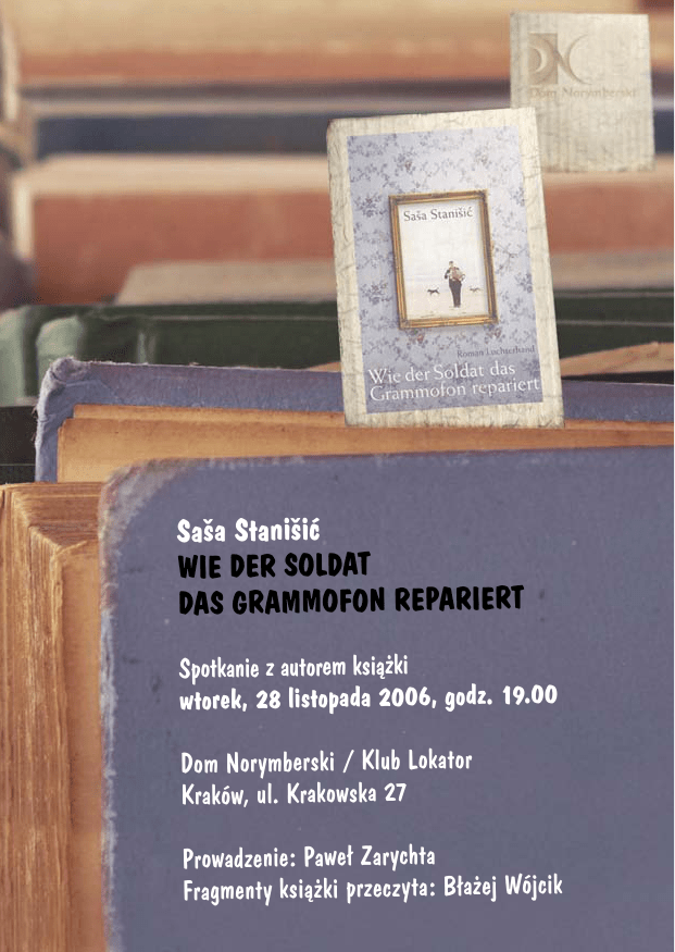 Saša Stanišić WIE DER SOLDAT DAS GRAMMOFON REPARIERT Spotkanie z autorem książki wtorek, 28 listopada 2006, godz. 19.00 Dom Norymberski / Klub Lokator Kraków, ul. Krakowska 27 Prowadzenie: Paweł Zarychta Fragmenty książki przeczyta: Błażej Wójcik Saša Stanišić napisał książkę o swoim dzieciństwie w Bośni, początkach wojny bałkańskiej, ucieczce do Niemiec i próbach zbudowania tam nowego życia. Autor znalazł dla swojej powieści niezwykłą formę, która nie jest historią opowiadaną ani z perspektywy dziecka, ani z dystansem dorosłego do wydarzeń z dzieciństwa. W książce Stanišicia jest wszystko to, co tak lubimy w literaturze czeskiej i w filmach Emira Kusturicy: humor, dosadność, przymrużenie oka, szczypta nostalgii i pełne temperamentu postacie. Saša Stanišić urodził się w 1978 roku w Bośni i Herzegowinie w miasteczku Višegrad. Jako nastolatek wyjechał z rodzicami do Niemiec, gdzie mieszka od 1992 roku. Studiował germanistykę i slawistykę na uniwersytecie w Heidelbergu oraz w Niemieckim Instytucie Literatury w Lipsku. W 2005 roku wziął udział w konkursie literackim im. Ingeborg Bachmann w Klagenfurcie, gdzie otrzymał nagrodę publiczności. W tym roku jego debiutancka książka Wie der Soldat das Grammofon repariert została nominowana do Niemieckiej Nagrody Książkowej. Organizatorzy: www.dom-norymberski.com INTYTUT FILOLOGII GERMAŃSKIEJ Partnerzy: