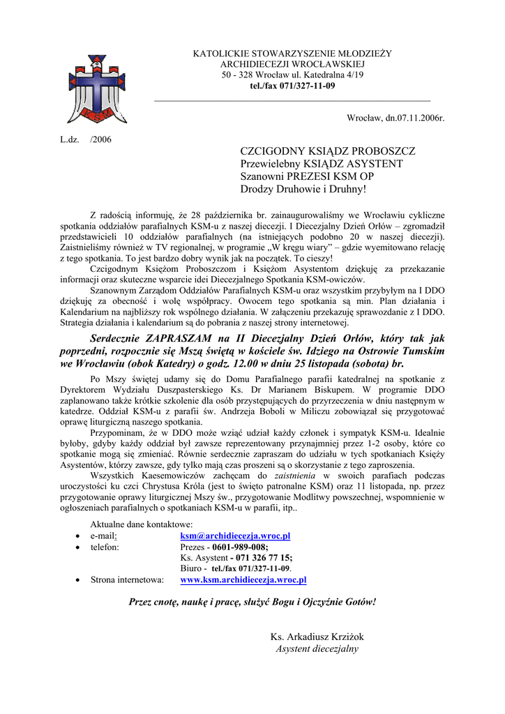 KATOLICKIE STOWARZYSZENIE MŁODZIEŻY ARCHIDIECEZJI WROCŁAWSKIEJ 50 - 328 Wrocław ul. Katedralna 4/19 tel./fax 071/327-11-09 ___________________________________________________________ Wrocław, dn.07.11.2006r. L.dz. /2006 CZCIGODNY KSIĄDZ PROBOSZCZ Przewielebny KSIĄDZ ASYSTENT Szanowni PREZESI KSM OP Drodzy Druhowie i Druhny! Z radością informuję, że 28 października br. zainaugurowaliśmy we Wrocławiu cykliczne spotkania oddziałów parafialnych KSM-u z naszej diecezji. I Diecezjalny Dzień Orłów – zgromadził przedstawicieli 10 oddziałów parafialnych (na istniejących podobno 20 w naszej diecezji). Zaistnieliśmy również w TV regionalnej, w programie „W kręgu wiary” – gdzie wyemitowano relację z tego spotkania. To jest bardzo dobry wynik jak na początek. To cieszy! Czcigodnym Księżom Proboszczom i Księżom Asystentom dziękuję za przekazanie informacji oraz skuteczne wsparcie idei Diecezjalnego Spotkania KSM-owiczów. Szanownym Zarządom Oddziałów Parafialnych KSM-u oraz wszystkim przybyłym na I DDO dziękuję za obecność i wolę współpracy. Owocem tego spotkania są min. Plan działania i Kalendarium na najbliższy rok wspólnego działania. W załączeniu przekazuję sprawozdanie z I DDO. Strategia działania i kalendarium są do pobrania z naszej strony internetowej. Serdecznie ZAPRASZAM na II Diecezjalny Dzień Orłów, który tak jak poprzedni, rozpocznie się Mszą świętą w kościele św. Idziego na Ostrowie Tumskim we Wrocławiu (obok Katedry) o godz. 12.00 w dniu 25 listopada (sobota) br. Po Mszy świętej udamy się do Domu Parafialnego parafii katedralnej na spotkanie z Dyrektorem Wydziału Duszpasterskiego Ks. Dr Marianem Biskupem. W programie DDO zaplanowano także krótkie szkolenie dla osób przystępujących do przyrzeczenia w dniu następnym w katedrze. Oddział KSM-u z parafii św. Andrzeja Boboli w Miliczu zobowiązał się przygotować oprawę liturgiczną naszego spotkania. Przypominam, że w DDO może wziąć udział każdy członek i sympatyk KSM-u. Idealnie byłoby, gdyby każdy oddział był zawsze reprezentowany przynajmniej przez 1-2 osoby, które co spotkanie mogą się zmieniać. Równie serdecznie zapraszam do udziału w tych spotkaniach Księży Asystentów, którzy zawsze, gdy tylko mają czas proszeni są o skorzystanie z tego zaproszenia. Wszystkich Kaesemowiczów zachęcam do zaistnienia w swoich parafiach podczas uroczystości ku czci Chrystusa Króla (jest to święto patronalne KSM) oraz 11 listopada, np. przez przygotowanie oprawy liturgicznej Mszy św., przygotowanie Modlitwy powszechnej, wspomnienie w ogłoszeniach parafialnych o spotkaniach KSM-u w parafii, itp.. • • • Aktualne dane kontaktowe: e-mail: [email protected] telefon: Prezes - 0601-989-008; Ks. Asystent - 071 326 77 15; Biuro - tel./fax 071/327-11-09. Strona internetowa: www.ksm.archidiecezja.wroc.pl Przez cnotę, naukę i pracę, służyć Bogu i Ojczyźnie Gotów! Ks. Arkadiusz Krziżok Asystent diecezjalny SPRAWOZDANIE z I DIECEZJALNEGO DNIA ORŁÓW Dnia 28 października 2006 r. Zarząd Diecezjalny Katolickiego Stowarzyszenia Młodzieży Archidiecezji Wrocławskiej zorganizował pierwszy „Diecezjalny Dzień Orłów”. W zjeździe udział wzięły następujące Oddziały: 1. Wrocław - Maślice - św. Agnieszki 2. Wrocław Pawłowice - Najśw. Serca P.Jezusa 3. Brzeg - Podw. Krzyża Św. 4. Góra Śląska - św. Katarzyny 5. Milicz - św. Andrzeja Boboli 6. Kuropatnik - Narodzenia NMP 7. Wrocław- Książe Małe - MB Wspomożenia Wiernych 8. Wrocław - św. Elżbiety Węgierskiej 9. Wrocław - Miłosierdzia Bożego 10. Gniechowice - św. Filomeny Spotkanie rozpoczęło się wspólną Eucharystią o godz. 12;00 w Kościele św. Idziego na Ostrowie Tumskim, której przewodniczył Asystent Diecezjalny ks. Arkadiusz Krziżok. Podczas homilii Ks. Asystent podkreślił ogromną rolę modlitwy a w szczególności wspólnej comiesięcznej Eucharystii jako „elementów” wspólnototwórczych. Zauważył, że Katolickiemu Stowarzyszeniu Młodzieży w naszej diecezji potrzeba dziś stworzenia silnych więzi między poszczególnymi oddziałami parafialnymi oraz oddziałami parafialnymi a zarządem diecezjalnym. Ks. Arkadiusz zwrócił wszystkim uwagę, że KSM w diecezji powołuje do istnienia Biskup Ordynariusz i to on wskazuje kierunek rozwoju Stowarzyszenia w diecezji. Dlatego też budowanie więzi między oddziałami parafialnymi a zarządem diecezjalnym jest wyrazem troski poszczególnych oddziałów o łączność z Biskupem - Pasterzem Diecezji. Po Mszy św. udaliśmy się do domu katechetycznego parafii katedralnej w celu zapoznania nowego Zarządu Diecezjalnego oraz poznania planu działania KSM-u w roku szkolno-katechetycznym 2006/2007. Cały plan został zamieszczony na naszej stronie internetowej. Spotkaniu przewodniczył ks. Arkadiusz Krziżok, który po przedstawieniu nowego zarządu na czele z Prezesem, przedstawił przybyłym oddziałom roczny program pracy. Głównym celem Nowego Zarządu w pierwszym roku działalności jest formacja, gdyż to ona stanowi ważną rolę w życiu każdego KSM-owicza, dlatego też pragniemy, aby tzw. Diecezjalne Dni Orłów odbywały się, co miesiąc, dzięki czemu zarząd jak i oddziały będą mogły nawiązać ze sobą bliższą więź. Ustalono również, że zarząd ma być koordynatorem, a działania powinny być podejmowane przez oddziały. Cele statutowe Zarząd Diecezjalny będzie realizował poprzez wizyty w oddziałach a także aktywny udział w inicjatywach poszczególnych oddziałów. Na zakończenie spotkania został wspomniany wyjazd letni do Dusznik organizowany przez KSM AW. Zebrani uczestnicy wyjazdu otrzymali pamiątkowe płyty z obozu. Spotkanie zakończyło się wspólną modlitwą i błogosławieństwem ks. Asystenta. Po spotkaniu miała miejsce sesja Zarządu KSM AW. Dorota Stępień wiceprezes KSM AW