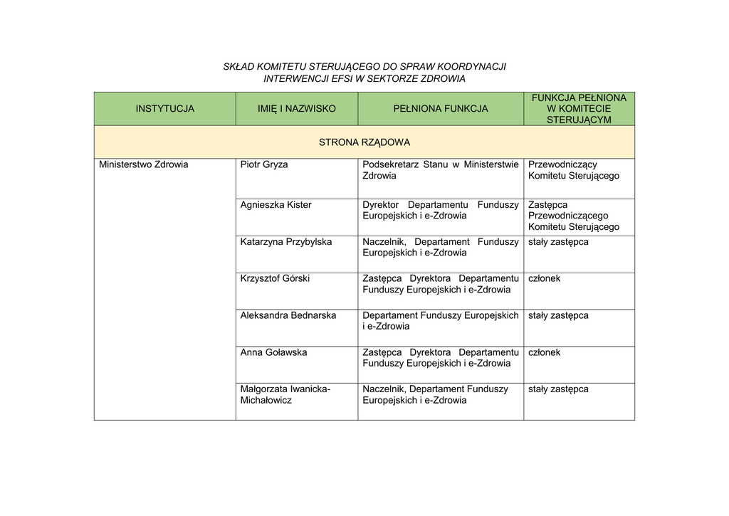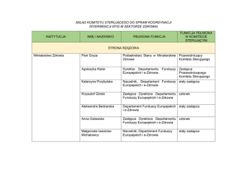 SKŁAD KOMITETU STERUJĄCEGO DO SPRAW KOORDYNACJI INTERWENCJI EFSI W SEKTORZE ZDROWIA INSTYTUCJA IMIĘ I NAZWISKO PEŁNIONA FUNKCJA FUNKCJA PEŁNIONA W KOMITECIE STERUJĄCYM STRONA RZĄDOWA Ministerstwo Zdrowia Piotr Gryza Podsekretarz Stanu w Ministerstwie Przewodniczący Zdrowia Komitetu Sterującego Agnieszka Kister Dyrektor Departamentu Funduszy Zastępca Europejskich i e-Zdrowia Przewodniczącego Komitetu Sterującego Katarzyna Przybylska Naczelnik, Departament Funduszy stały zastępca Europejskich i e-Zdrowia Krzysztof Górski Zastępca Dyrektora Departamentu członek Funduszy Europejskich i e-Zdrowia Aleksandra Bednarska Departament Funduszy Europejskich stały zastępca i e-Zdrowia Anna Goławska Zastępca Dyrektora Departamentu członek Funduszy Europejskich i e-Zdrowia Małgorzata IwanickaMichałowicz Naczelnik, Departament Funduszy Europejskich i e-Zdrowia stały zastępca Sylwia Lis Dyrektor Departamentu Ubezpieczenia Zdrowotnego członek Anatol Gołąb Zastępca Dyrektora Departamentu Ubezpieczenia Zdrowotnego stały zastępca Jerzy Bójko Zastępca Dyrektora Departamentu Budżetu, Finansów i Inwestycji członek Ewa Kossakowska Naczelnik, Departament Budżetu, Finansów i Inwestycji stały zastępca Barbara Więckowska Dyrektor Departamentu Analiz i Strategii członek Jakub Adamski Zastępca Dyrektora Departamentu Analiz i Strategii stały zastępca Beata Rorant Dyrektor Departamentu Organizacji Ochrony Zdrowia członek Wojciech Marciszko Departament Organizacji Ochrony Zdrowia stały zastępca Joanna Kilkowska Dyrektor Departamentu Polityki Zdrowotnej członek Magdalena Klimek Naczelnik, Departament Polityki Zdrowotnej stały zastępca Ministerstwo Rozwoju Jarosław Orliński Dyrektor Departamentu Programów Infrastrukturalnych członek Barbara Baka Zastępca Dyrektora Departamentu Programów Infrastrukturalnych stały zastępca Dorota Bortnowska Zastępca Dyrektora Departamentu Europejskiego Funduszu Społecznego członek Paweł Zdun Naczelnik, Departament Europejskiego Funduszu Społecznego stały zastępca Aleksandra Kwiatkowska Zastępca Dyrektora Departamentu Rozwoju Cyfrowego członek Magdalena Piotrowska Departament Rozwoju Cyfrowego stały zastępca Tomasz Złakowski Departament Strategii Rozwoju członek Ewa Bieniek Departament Strategii Rozwoju stały zastępca Justyna Grucelska-Zenc Departament Koordynacji Wdrażania Funduszy Unii Europejskiej członek Stefan Jarecki Departament Koordynacji Wdrażania Funduszy Unii Europejskiej stały zastępca Ministerstwo Rodziny, Pracy i Polityki Społecznej Ministerstwo Cyfryzacji Renata Szczęch Podsekretarz Stanu członek Marek Stodolny Zastępca Dyrektora Departamentu Wdrażania EFS stały zastępca Ewa Graniewska Dyrektor Departamentu Koordynacji Funduszy Europejskich członek Piotr Sielecki Zastępca Dyrektora Departamentu Koordynacji Funduszy Europejskich stały zastępca STRONA SAMORZĄDOWA Instytucja Zarządzająca Regionalnym Programem Operacyjnym WOJEWÓDZTWA DOLNOŚLĄSKIEGO Jarosław Maroszek Dyrektor Departamentu Zdrowia i Promocji Województwa Urzędu Marszałkowskiego Województwa Dolnośląskiego członek Jerzy Sypuła Dyrektor Wydziału Zdrowia w Departamencie Zdrowia i Promocji Województwa Urzędu Marszałkowskiego Województwa Dolnośląskiego stały zastępca Instytucja Zarządzająca Regionalnym Programem Operacyjnym WOJEWÓDZTWA KUJAWSKO-POMORSKIEGO Instytucja Zarządzająca Regionalnym Programem Operacyjnym WOJEWÓDZTWA LUBELSKIEGO Instytucja Zarządzająca Regionalnym Programem Operacyjnym WOJEWÓDZTWA LUBUSKIEGO Piotr Całbecki Marszałek Województwa Kujawsko-Pomorskiego członek Barbara Jesionowska Zastępca Dyrektora Departamentu Rozwoju Regionalnego Urzędu Marszałkowskiego Województwa Kujawsko-Pomorskiego stały zastępca Arkadiusz Bratkowski Członek Zarządu Urzędu Marszałkowskiego Województwa Lubelskiego członek Ryszard Staśczak Dyrektor Departamentu Zdrowia i Polityki Społecznej Urzędu Marszałkowskiego Województwa Lubelskiego stały zastępca Elżbieta Anna Polak Marszałek Województwa Lubuskiego członek Mirosława Dulat Departament Ochrony Zdrowia Urzędu Marszałkowskiego Województwa Lubuskiego stały zastępca Instytucja Zarządzająca Regionalnym Programem Operacyjnym WOJEWÓDZTWA ŁÓDZKIEGO Instytucja Zarządzająca Regionalnym Programem Operacyjnym WOJEWÓDZTWA MAŁOPOLSKIEGO Instytucja Zarządzająca Regionalnym Programem Operacyjnym WOJEWÓDZTWA MAZOWIECKIEGO Dominik Patora Dyrektor Departamentu Polityki Regionalnej Urzędu Marszałkowskiego Województwa Łódzkiego członek Magdalena Amrozik Zastępca Dyrektora Departamentu Polityki Zdrowotnej Urzędu Marszałkowskiego Województwa Łódzkiego stały zastępca Wojciech Kozak Wicemarszałek Województwa Małopolskiego członek Sylwia Grzesiak-Ambroży Dyrektor Departamentu Zdrowia i Polityki Społecznej, Urząd Marszałkowski Województwa Małopolskiego stały zastępca Elżbieta Lanc Członek Zarządu Województwa Mazowieckiego członek Agnieszka Gonczaryk Dyrektor Departamentu Polityki Społecznej i Zdrowotnej Urzędu Marszałkowskiego Województwa Mazowieckiego stały zastępca Instytucja Zarządzająca Regionalnym Programem Operacyjnym WOJEWÓDZTWA OPOLSKIEGO Instytucja Zarządzająca Regionalnym Programem Operacyjnym WOJEWÓDZTWA PODKARPACKIEGO Instytucja Zarządzająca Regionalnym Programem Operacyjnym WOJEWÓDZTWA PODLASKIEGO Roman Kolek Wicemarszałek Województwa Opolskiego członek Irena Barczyk Zastępca Dyrektora Departamentu Zdrowia i Polityki Społecznej Urzędu Marszałkowskiego Województwa Opolskiego stały zastępca Władysław Ortyl Marszałek Województwa Podkarpackiego członek Stanisław Kruczek Członek Zarządu Województwa Podkarpackiego stały zastępca Bogdan Dyjuk Członek Zarządu Województwa Podlaskiego członek Katarzyna Zajkowska Dyrektor Departamentu Zdrowia Urzędu Marszałkowskiego Województwa Podlaskiego stały zastępca Instytucja Zarządzająca Regionalnym Programem Operacyjnym