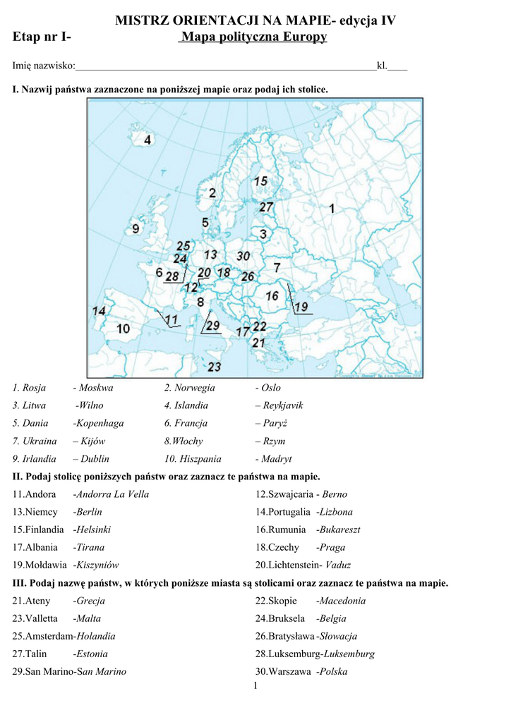MISTRZ ORIENTACJI NA MAPIE- edycja IV Mapa polityczna Europy Etap nr IImię nazwisko: kl. I. Nazwij państwa zaznaczone na poniższej mapie oraz podaj ich stolice. 1. Rosja - Moskwa 2. Norwegia - Oslo 3. Litwa -Wilno 4. Islandia – Reykjavik 5. Dania -Kopenhaga 6. Francja – Paryż 7. Ukraina – Kijów 8.Włochy – Rzym 9. Irlandia – Dublin 10. Hiszpania - Madryt II. Podaj stolicę poniższych państw oraz zaznacz te państwa na mapie. 11.Andora -Andorra La Vella 12.Szwajcaria - Berno 13.Niemcy -Berlin 14.Portugalia -Lizbona 15.Finlandia -Helsinki 16.Rumunia -Bukareszt 17.Albania 18.Czechy -Tirana 19.Mołdawia -Kiszyniów -Praga 20.Lichtenstein- Vaduz III. Podaj nazwę państw, w których poniższe miasta są stolicami oraz zaznacz te państwa na mapie. 21.Ateny -Grecja 22.Skopie -Macedonia 23.Valletta -Malta 24.Bruksela -Belgia 25.Amsterdam-Holandia 26.Bratysława -Słowacja 27.Talin 28.Luksemburg-Luksemburg -Estonia 29.San Marino-San Marino 30.Warszawa -Polska 1 BONUS- Wyspy Ziemi Na mapie zaznacz podane poniżej wyspy. 1. Borneo 6. Kuba 2. Grenlandia 7. Nowa Funlandia 3. Madagaskar 8. Wyspa Wiktorii 2 4. Sumatra 9. Sachalin 5. Islandia 10. Nowa Gwinea