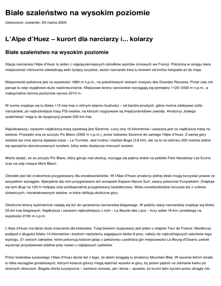 Białe szaleństwo na wysokim poziomie Utworzono: czwartek, 03 marca 2005 L’Alpe d’Huez – kurort dla narciarzy i... kolarzy Białe szaleństwo na wysokim poziomie Stacja narciarska l’Alpe d’Huez to jeden z najpopularniejszych ośrodków sportów zimowych we Francji. Położoną w okręgu Isere miejscowość rokrocznie odwiedzają setki tysięcy turystów, sezon narciarski trwa tu bowiem od końca listopada aż do maja. Miejscowość położona jest na wysokości 1860 m n.p.m., na południowych stokach masywu des Grandes Rousses. Przez cały rok panuje tu więc wyjątkowo duże nasłonecznienie. Miejscowe tereny narciarskie rozciągają się pomiędzy 1120–3330 m n.p.m., a maksymalna różnica poziomów wynosi 2210 m. W sumie znajduje się tu blisko 110 tras tras o różnym stopniu trudności – od bardzo prostych, gdzie można zdobywać szlify narciarskie, po najtrudniejsze trasy FIS-owskie, na których rozgrywane są międzynarodowe zawody. Amatorzy „białego szaleństwa” mają tu do dyspozycji prawie 230 km tras. Najciekawszą i zarazem najdłuższą trasą zjazdową jest Sarenne. Liczy ona 16 kilometrów i uważana jest za najdłuższa trasę na świecie. Prowadzi ona ze szczytu Pic Blanc (3350 m n.p.m.), przez lodowiec Sarenne do samego l’Alpe d’Huez. Z samej góry wiedzie też inna słynna alpejska trasa – La Tunnele. Jest trudna i niezbyt długa (3,8 km), ale za to na odcinku 200 metrów jedzie się specjalnie skonstruowanym tunelem, który wielu dostarcza mocnych wrażeń. Warto dodać, że ze szczytu Pic Blanc, który góruje nad okolicą, rozciąga się piękny widok na pobliski Park Narodowy Les Ecrins oraz na cały masyw Mont Blanc. Ośrodek jest też znakomicie przygotowany dla snowboardzistów. W l’Alpe d’Huez amatorzy jednej deski mogą korzystać prawie ze wszystkich wyciągów. Specjalnie dla nich przygotowano też snowpark Espace Nature Surf, zwany potocznie Funparkiem. Znajduje się tam długi na 120 m halfpipe oraz profesjonalnie przygotowany boardercross. Wielu snowbordzistów korzysta też z uroków dziewiczych, nieratrakowanych stoków, w które obfitują okoliczne góry. Okoliczne tereny wyśmienicie nadają się też do uprawiania narciarstwa biegowego. W pobliżu stacji narciarskiej znajduje się blisko 55 km tras biegowych. Najdłuższa i zarazem najtrudniejsza z nich – La Boucle des Lacs – liczy sobie 16 km i przebiega na wysokości 2100 m n.p.m. L’Alpe d’Huez ma także duże znaczenie dla kolarstwa. Tutaj bowiem rozgrywany jest jeden z etapów Tour de France. Morderczy podjazd o długości blisko 14 kilometrów i średnim nachyleniu sięgającym blisko 8 proc. należy do najtrudniejszych odcinków tego wyścigu. 21 ostrych zakrętów, które pokonują kolarze jadąc z położonej u podnóża gór miejscowości Le Bourg-d’Oisans, potrafi wycisnąć przysłowiowe siódme poty nawet u najlepszych cyklistów. Prócz kolarstwa szosowego l’Alpe d’Huez słynie też z tego, że latem ściągają tu amatorzy Mountain Bike. W sezonie letnim działa tu kilka wyciągów gondolowych, którymi kolarze górscy mogą wjechać wysoko w góry, by potem pędzić na złamanie karku po stromych zboczach. Bogata oferta turystyczna – zarówno zimowa, jak i letnia – sprawia, że kurort tętni życiem przez okrągły rok. Jt Warto wiedzieć Większość kwater w l’Alpe d’Huez znajduje się tuż przy wyciągach. Umożliwia to jazdę praktycznie bez odpinania nart i bez marnowania czasu na dojazdy skibusami. W miejscowości mieszczą się liczne bary, restauracje, dyskoteki i sklepy. Jest też znakomite centrum sportowe z kortami, basenem i lodowiskiem. Większość turystów przyjeżdża tu zorganizowanych grupach. Koszt tygodniowego wyjazdu (przejazd plus zakwaterowanie bez wyżywienia) to około 1,3 tys. zł. Na rozpoczęcie i zakończenie sezonu często można znaleźć oferty, które w tej cenie zawierają też 6-dniowy skipas. W sezonie trzeba za niego zapłacić dodatkowo od 150 do 230 euro w zależności od miesiąca. Turyści niezorganizowani bez problemu znajdą tu kwatery. Cena za dobę od osoby to ok. 20–25 euro. Nie ma też żadnego problemu z dojazdem do miejscowości. Kursują tu regularne połączenia autobusowe z pobliskiego Grenoble (64 km), gdzie znajduje się też najbliższe międzynarodowe lotnisko.