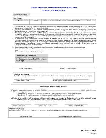 OŚWIADCZENIE WOLI O WYSTĄPIENIU Z UMOWY UBEZPIECZENIA PROGRAM OCHRONNY NA ŻYCIE Nr Deklaracji zgody Dane Klienta: Imię i nazwisko PESEL Adres do korespondencji: kod, miasto, ulica, nr domu Telefon 1. Oświadczam, że występuję z Umowy Grupowego Ubezpieczenia nr UB/03/2015/BA zawartej pomiędzy AXA Życie Towarzystwo Ubezpieczeń Spółka Akcyjna a ProEkspert Sp. z o.o. 2. Przyjmuję do wiadomości, że ochrona ubezpieczeniowa wygasa z upływem dnia złożenia niniejszego oświadczenia Ubezpieczającemu, Agentowi lub Ubezpieczycielowi. 3. Jeżeli w ramach jednej Umowy kredytu objętych ochroną ubezpieczeniową jest dwóch Klientów, to oświadczenie woli o wystąpieniu z Umowy ubezpieczenia złożone przez jednego z Ubezpieczonych powoduje zakończenie ochrony wyłącznie w stosunku do tego Ubezpieczonego, który złożył oświadczenie. W takiej sytuacji drugi Ubezpieczony pozostaje objęty ochroną na dotychczasowych warunkach. 4. W przypadku, gdy oświadczenie zostało złożone w terminie do 30 dni od Dnia objęcia ochroną ubezpieczeniową, Ubezpieczonemu przysługuje zwrot środków za objęcie ochroną w pełnej wysokości. W sytuacji, gdy oświadczenie zostało złożone w terminie po upływie 30 dni od Dnia objęcia ochroną ubezpieczeniową, Ubezpieczonemu przysługuje zwrot środków za niewykorzystany okres ochrony. Zwrotu kosztów ubezpieczenia w pełnej wysokości lub za niewykorzystany okres ochrony Ubezpieczonemu dokona Ubezpieczający. 5. Jednocześnie proszę o zwrot środków za objęcie ochroną za niewykorzystany okres ochrony ubezpieczeniowej: na rachunek Umowy kredytu albo na poniższy numer rachunku bankowego Numer rachunku bankowego Imię i nazwisko/ nazwa właściciela rachunku bankowego (data, miejscowość) (podpis Ubezpieczonego) Wypełnia przyjmujący Stwierdza się zgodność danych z okazanym dokumentem tożsamości oraz potwierdza własnoręczność złożonego podpisu. ___________________________ Miejscowość i data _____________________________________________ Podpis przyjmującego Oświadczenie ----------------------------------------------------------------------------------------------------------------------------------------------------------------------Oświadczenie dla Getin Noble Bank S.A. W związku z powstałą nadpłatą na Umowie Kredytu nr…………………………………………………………… proszę o zarachowanie nadpłaconej kwoty poprzez: zmniejszenie wysokości pozostałych do spłaty rat i zachowanie pierwotnego okresu kredytowania, skrócenie okresu kredytowania i pozostawienie wysokości rat na tym samym poziomie. UWAGA! W przypadku, gdy składający niniejszą dyspozycję jest jednym z Kredytobiorców, w celu realizacji zwrotu nadpłaconej kwoty, oświadczenie powinno być podpisane przez wszystkich Kredytobiorców. _________________________ Miejscowość i data _____________________________ Podpis Kredytobiorcy 1 _____________________________ Podpis Kredytobiorcy 2 Wypełnia przyjmujący Stwierdza się zgodność danych z okazanym dokumentem tożsamości oraz potwierdza własnoręczność złożonego podpisu. ______________________________ Miejscowość i data ___________________________________________________ Podpis przyjmującego oświadczenie REZ_UBEZP_GRUP 2016-08-01