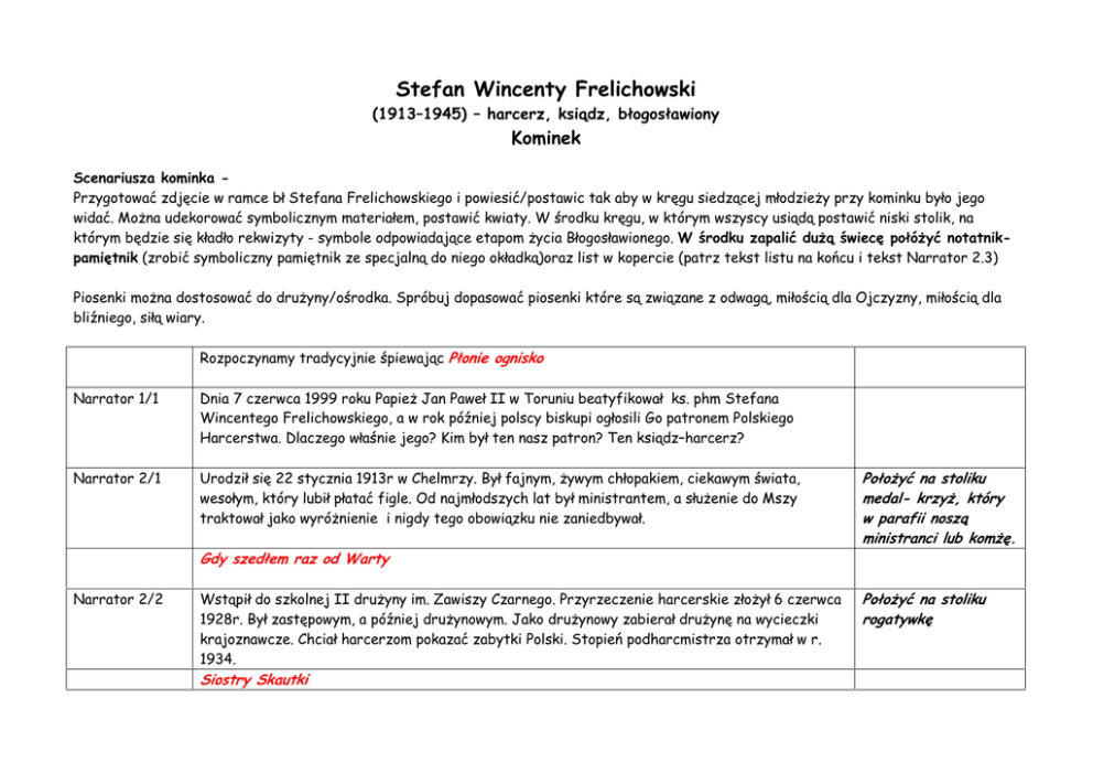 Stefan Wincenty Frelichowski (1913–1945) – harcerz, ksiądz, błogosławiony Kominek Scenariusza kominka Przygotować zdjęcie w ramce bł Stefana Frelichowskiego i powiesić/postawic tak aby w kręgu siedzącej młodzieży przy kominku było jego widać. Można udekorować symbolicznym materiałem, postawić kwiaty. W środku kręgu, w którym wszyscy usiądą postawić niski stolik, na którym będzie się kładło rekwizyty - symbole odpowiadające etapom życia Błogosławionego. W środku zapalić dużą świecę połóżyć notatnikpamiętnik (zrobić symboliczny pamiętnik ze specjalną do niego okładką)oraz list w kopercie (patrz tekst listu na końcu i tekst Narrator 2.3) Piosenki można dostosować do drużyny/ośrodka. Spróbuj dopasować piosenki które są związane z odwagą, miłością dla Ojczyzny, miłością dla bliźniego, siłą wiary. Rozpoczynamy tradycyjnie śpiewając Płonie ognisko Narrator 1/1 Dnia 7 czerwca 1999 roku Papież Jan Paweł II w Toruniu beatyfikował ks. phm Stefana Wincentego Frelichowskiego, a w rok później polscy biskupi ogłosili Go patronem Polskiego Harcerstwa. Dlaczego właśnie jego? Kim był ten nasz patron? Ten ksiądz–harcerz? Narrator 2/1 Urodził się 22 stycznia 1913r w Chelmrzy. Był fajnym, żywym chłopakiem, ciekawym świata, wesołym, który lubił płatać figle. Od najmłodszych lat był ministrantem, a służenie do Mszy traktował jako wyróżnienie i nigdy tego obowiązku nie zaniedbywał. Położyć na stoliku medal- krzyż, który w parafii noszą ministranci lub komżę. Gdy szedłem raz od Warty Narrator 2/2 Wstąpił do szkolnej II drużyny im. Zawiszy Czarnego. Przyrzeczenie harcerskie złożył 6 czerwca 1928r. Był zastępowym, a później drużynowym. Jako drużynowy zabierał drużynę na wycieczki krajoznawcze. Chciał harcerzom pokazać zabytki Polski. Stopień podharcmistrza otrzymał w r. 1934. Siostry Skautki Położyć na stoliku rogatywkę Narrator 3/1 Podnosi ze stolika Pamiętnik i czyta ‘ ja sam wierzę mocno, że państwo, którego wszyscy Czyta z pamiętnika obywatele byliby harcerzami, byłoby najpotężnieszym ze wszystkich. Harcerstwo, bowiem, a polskie szczególnie, ma takie środki, pomoce, że, kto przejdzie przez jego szkołę to jest typem człowieka, jakiego nam teraz potrzeba. A już najdziwniejszą, ale najpiękniejszą jest idea harcerstwa: wychowanie młodzieży przez młodzież. I ja sam, jak długo tylko będę mógł, co daj Boże, aby zawsze było, będę harcerzem i nigdy dla niego pracować i go popierać nie przestanę. Czuwaj!’ Dym z jałowca Narrator 4/1 Szukając swego miejsca w życiu dorosłym, zastanawiając się nad tym, kim ma być, wybrał kapłaństwo. Ale nie była to dla niego łatwa decyzja. Żal mu było zostawiać przyjaciół … drużynę… Jak dobrze nam Narrator 5/1 Podnosi ze stolika Pamiętnik i czyta: ‘Jak cudownie i pięknie nęci mnie świat…Przyszłość Czyta z pamiętnika uśmiechała się do mnie promieniami tęczy, a prócz tego świat dał mi jeszcze poznać, czym jest miłość. Miłość pierwsza, młodzieńcza. Nie miłość ciał, ale przyjaźń duchowa. I smutno mi było, smutno Agnieszce. Serce się we mnie krajało, gdy z płaczem mnie żegnała. Nie namawiała mnie do zostania, uszanowała moją wolę. I ja jej nigdy nie zapomnę. ‘ Pieśń kościelna – Radośnie żyć na świecie, bo Pan Bóg kocha nas Narrator 1/2 W seminarium w Pelplinie nie stracił kontaktu z harcerstwem, prowadząc klerycki krąg instruktorski. Zawsze starał się dobrym przykładem zachęcać kolegów do pracy nad sobą, w zwalczaniu wad. Po sześcioletnich studiach 14 marca 1937 roku został wyświecony na kapłana. Pieśń kościelna – Barka – Pan kiedyś stanął nad brzegiem Narrator 2/3 Po otrzymaniu święceń zostaje sekretarzem biskupa Okoniewskiego, a od lipca 1939r pracuje jako wikary w Parafii Najświętszej Marii Panny w Toruniu. Jego proboszcz tak o nim napisał. Położyć na stoliku stułę - symbol kapłaństwa Wyjąc z koperty leżący na stole list i przeczytać ‘Jego wzrok miał coś odmiennego, nieprzeciętnego. Usposobienia był radosnego, szczery i wesoły w rozmowie, a delikatny w wyrażaniu się i wydawaniu oceny. Będąc harcerzem, miał też piękny, życzliwy stosunek do otoczenia, wyrażający się w uczynności. ‘ Wyjąc z koperty leżący na stole list i przeczytać Pieśń - Zamieszkaj Druhu znów pod namiotem Narrator 3/2 Ludzie wręcz lgnęli do księdza Frelichowskiego. Jako harcerz miał szczególne podejście do dzieci i młodzieży, organizował biwaki, podchody, wycieczki. Był księdzem bliskim, nie tylko stojącym przy ołtarzu. Świadczył o Bogu całym swoim życiem. Z miejsca na miejsce Narrator 3/3 O tym jak przeżywał swoje kapłaństwo świadczą jego słowa napisane w pamiętniku w drugą rocznicę święceń kapłańskich. Narrator 4/2 Podnosi ze stolika Pamiętnik i czyta: ‘Dziś druga rocznica mych prymicji. Dzięki Ci Panie, za to, co doznałem przez te dwa lata. Dzięki Ci nawet za błędy … w głębokiej pokorze klękam przed Tobą i proszę, daj mi szczerze prowadzić życie, daj mi odwagę życia według wskazań twoich. Klękam niżej niż zwykle… Panie, Tobie daję me życie… Boże chcę być naprawdę kapłanem.’ Jak długo w sercach naszych Narrator 5/2 Po wybuchu II wojny światowej i wkroczeniu wojsk niemieckich do Polski, 7 września 1939r zostaje aresztowany jako szczególnie niebezpieczny dla okupanta, za swoją harcerską działalność. Od razu stara się nieść pomoc i pociechę współwięźniom, szczególnie chorym i słabym. Hej! Chłopcy bagnet na broń Narrator 1/3 Po wybuchu II wojny światowej i wkroczeniu wojsk niemieckich do Polski, 7 września 1939r Czyta z pamiętnika zostaje aresztowany jako szczególnie niebezpieczny dla okupanta, za swoją harcerską działalność. Od razu stara się nieść pomoc i pociechę współwięźniom, szczególnie chorym i