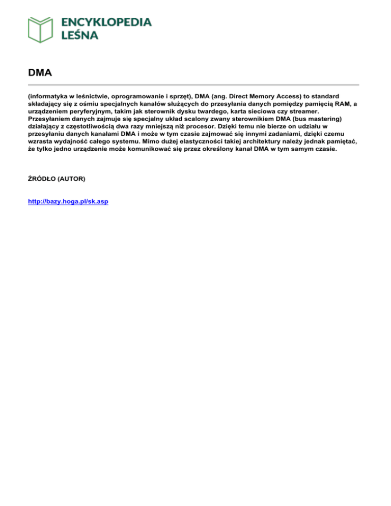 DMA (informatyka w leśnictwie, oprogramowanie i sprzęt), DMA (ang. Direct Memory Access) to standard składający się z ośmiu specjalnych kanałów służących do przesyłania danych pomiędzy pamięcią RAM, a urządzeniem peryferyjnym, takim jak sterownik dysku twardego, karta sieciowa czy streamer. Przesyłaniem danych zajmuje się specjalny układ scalony zwany sterownikiem DMA (bus mastering) działający z częstotliwością dwa razy mniejszą niż procesor. Dzięki temu nie bierze on udziału w przesyłaniu danych kanałami DMA i może w tym czasie zajmować się innymi zadaniami, dzięki czemu wzrasta wydajność całego systemu. Mimo dużej elastyczności takiej architektury należy jednak pamiętać, że tylko jedno urządzenie może komunikować się przez określony kanał DMA w tym samym czasie. ŹRÓDŁO (AUTOR) http://bazy.hoga.pl/sk.asp