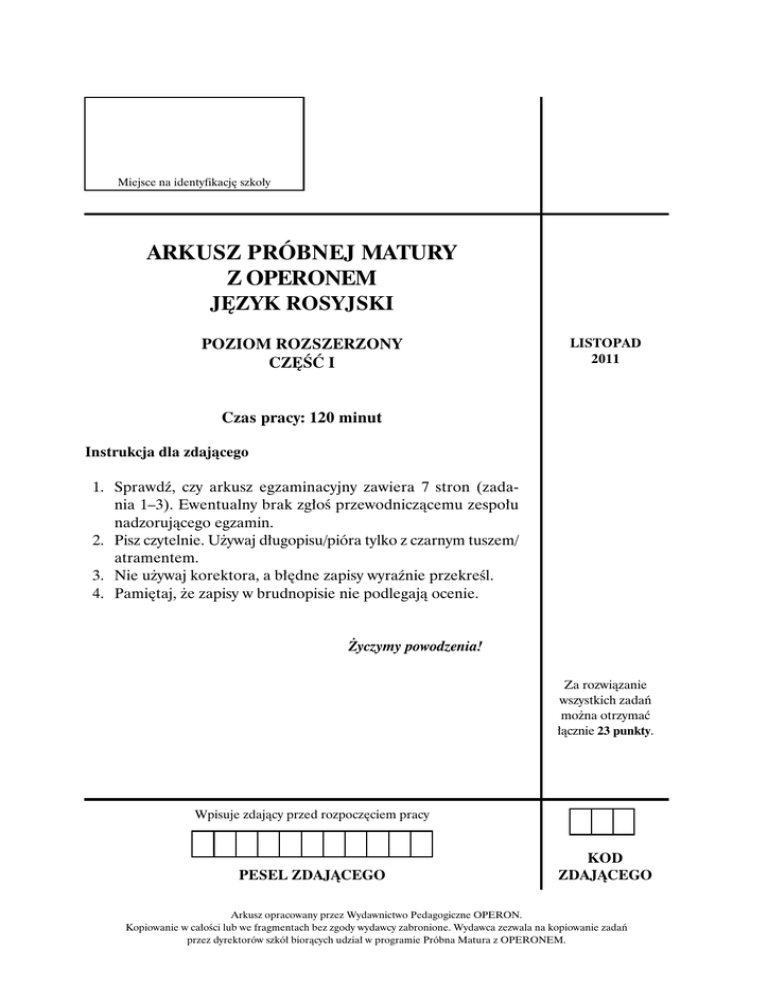 Miejsce na identyfikację szkoły ARKUSZ PRÓBNEJ MATURY Z OPERONEM JĘZYK ROSYJSKI POZIOM ROZSZERZONY CZĘŚĆ I LISTOPAD 2011 Czas pracy: 120 minut Instrukcja dla zdającego 1. Sprawdź, czy arkusz egzaminacyjny zawiera 7 stron (zadania 1–3). Ewentualny brak zgłoś przewodniczącemu zespołu nadzorującego egzamin. 2. Pisz czytelnie. Używaj długopisu/pióra tylko z czarnym tuszem/ atramentem. 3. Nie używaj korektora, a błędne zapisy wyraźnie przekreśl. 4. Pamiętaj, że zapisy w brudnopisie nie podlegają ocenie. Życzymy powodzenia! Za rozwiązanie wszystkich zadań można otrzymać łącznie 23 punkty. Wpisuje zdający przed rozpoczęciem pracy PESEL ZDAJĄCEGO KOD ZDAJĄCEGO Arkusz opracowany przez Wydawnictwo Pedagogiczne OPERON. Kopiowanie w całości lub we fragmentach bez zgody wydawcy zabronione. Wydawca zezwala na kopiowanie zadań przez dyrektorów szkół biorących udział w programie Próbna Matura z OPERONEM. Język rosyjski. Poziom rozszerzony Próbna Matura z OPERONEM i „Gazetą Wyborczą” – CZĘŚĆ I STOSOWANIE STRUKTUR LEKSYKALNO-GRAMATYCZNYCH Zadanie 1. (3 pkt) Przeczytaj tekst i uzupełnij go podanymi wyrazami. Zmień ich formę, tak aby tekst stanowił logiczną i spójną całość. Wpisz rozwiązania do tabeli. Wymagana jest pełna poprawność gramatyczna i ortograficzna wpisywanych wyrazów. Uwaga: zestaw zawiera dwa zbędne wyrazy. Za każde poprawne rozwiązanie otrzymasz 0,5 punktu. ì ËÌ‚‡Îˉӂ ÒÚ‡ÌÂÚ ·Óθ¯Â ‚ÓÁÏÓÊÌÓÒÚÂÈ ÂÁ‰ËÚ¸ ̇ ÔÓÂÁ‰‡ı Ò 1.1. _______________________ . Ç ÒÔˆˇÎËÁËÓ‚‡ÌÌ˚ı ÍÛÔ Ô‰ÛÒÏÓÚÂÌÓ ‚Òfi, ˜ÚÓ·˚ ӷ΄˜ËÚ¸ ÔÛÚ¯ÂÒÚ‚Ë ‰Îfl β‰ÂÈ, 1.2. _____________________ ÔÓ·ÎÂÏ˚ ÒÓ Á‰ÓÓ‚¸ÂÏ. ÇıÓ‰ ‚ ‚‡„ÓÌ ‰Îfl ËÌ‚‡Îˉӂ Ó·ÓÛ‰Ó‚‡Ì ÔÓ‰˙fiÏÌËÍÓÏ, Ò 1.3. __________________________ ÍÓÚÓÓ„Ó Ô‡ÒÒ‡ÊË, Ì ÔÓÍˉ‡fl ËÌ‚‡ÎˉÌÓÈ ÍÓÎflÒÍË, ÏÓÊÂÚ ÔÓÔ‡ÒÚ¸ ‚ÌÛÚ¸ Í‡Í Ò ‚˚ÒÓÍÓÈ, Ú‡Í Ë Ò ÌËÁÍÓÈ Ô·ÚÙÓÏ˚. áÓ̇ ‰ÓÒÚÛÔÌÓÒÚË ‰Îfl Ô‡ÒÒ‡Êˇ-ËÌ‚‡Îˉ‡ ‚ ‚‡„ÓÌ ‚Íβ˜‡ÂÚ Ú‡Ï·Û, ÍÓË‰Ó Ë ÚÛ‡ÎÂÚ ÒÓ ÒÚÓÓÌ˚ ̇·Ó˜Â„Ó Ú‡Ï·Û‡, ÍÛÔ ‰Îfl ËÌ‚‡Îˉ‡. áÓ̇ ‡ÁÏ¢ÂÌËfl ËÌ‚‡Îˉ‡ ÔÓÁ‚ÓÎflÂÚ Ô‰‚Ë„‡Ú¸Òfl ËÌ‚‡ÎË‰Û ‚ ÒÓ·ÒÚ‚ÂÌÌÓÈ 1.4. __________________________ ÍÓÎflÒÍÂ. LJ„ÓÌ˚ ‰Îfl β‰ÂÈ Ò Ó„‡Ì˘ÂÌÌ˚ÏË ‚ÓÁÏÓÊÌÓÒÚflÏË ËÏÂ˛Ú 6 Ó·˚˜Ì˚ı ÍÛÔÂ Ë ‰‚ÛıÏÂÒÚÌÓ ÍÛÔÂ Ò ‚ÂÚË͇θÌ˚Ï ‡ÒÔÓÎÓÊÂÌËÂÏ ÔÓÎÓÍ, ‡ÒÒ˜ËÚ‡ÌÌÓ ̇ ËÌ‚‡Îˉ‡, Ô‰‚Ë„‡˛˘Â„ÓÒfl ̇ ÍÓÎflÒÍÂ, Ë ÒÓÔÓ‚Óʉ‡˛˘Â„Ó. Ç ÌÓ‚˚ı ‚‡„Ó̇ı, ÍÛÔ ‰Îfl β‰ÂÈ Ò Ó„‡Ì˘ÂÌÌ˚ÏË ‚ÓÁÏÓÊÌÓÒÚflÏË Ó·ÓÛ‰Ó‚‡ÌÓ ÒÔˆˇθÌ˚Ï ÏÂÒÚÓÏ ‰Îfl ‡ÁÏ¢ÂÌËfl ÍÂÒ·-ÍÓÎflÒÍË, ÒˉÂ̸ÂÏ, ·‡„‡ÊÌÓÈ Ì˯ÂÈ, ÎÂÒÚÌˈÂÈ ‰Îfl ÔÓ‰˙fiχ ̇ ‚ÂıÌ ÒԇθÌÓ ÏÂÒÚÓ Ë ÒÔˆˇθÌ˚ÏË ÔÓÛ˜ÌflÏË, 1.5. __________________________ ÔÂÂÏ¢ÂÌËÂ. Ç˚Íβ˜‡ÚÂÎË, ÓÁÂÚÍË Ë ÍÌÓÔÍË ‚˚ÁÓ‚‡ ÔÓ‚Ó‰ÌË͇ ‡ÒÔÓÎÓÊÂÌ˚ ÌËÁÍÓ, ‚ ÁÓÌ ‰ÓÒÚÛÔ‡ ÛÍ Òˉfl˘Â„Ó ˜ÂÎÓ‚Â͇. í‡ÍÊ ÓÌË Ò̇·ÊÂÌ˚ Ú‡·Î˘͇ÏË Ò ÂθÂÙÌ˚Ï ÚÂÍÒÚÓÏ ‰Îfl ˜ÚÂÌËfl ԇθˆ‡ÏË Ë ÒÔˆˇθÌ˚Ï 1.6. ________________________ ÛÒÚÓÈÒÚ‚ÓÏ, ÒÓÓ·˘‡˛˘ËÏ ÌÂÓ·ıÓ‰ËÏÛ˛ ËÌÙÓχˆË˛. no: http://www.ampgirl.su/?p=3460 ëÎÓ‚‡ ‰Îfl ‚ÒÚ‡‚ÍË: ÍÓÎflÒ͇, ËÌ‚‡ÎˉÌ˚È, ËÏÂÚ¸, ӷ΄˜‡Ú¸, ÔÓÏÓ˜¸, ÍÓÏÙÓÚ, Á‚ÛÍÓ‚ÓÈ, ÔÓÏÓ˘¸ 1.1. 1.2. 1.3. 1.4. 1.5. 1.6. 2 Język rosyjski. Poziom rozszerzony Próbna Matura z OPERONEM i „Gazetą Wyborczą” – CZĘŚĆ I Zadanie 2. (2 pkt) Dokonaj transformacji poniższych zdań, tak aby drugie zdanie w parze miało takie samo znaczenie, jak zdanie pierwsze. Wymagana jest pełna poprawność ortograficzna i gramatyczna zdań. Za każde poprawne rozwiązanie otrzymasz 0,5 punktu. 2.1. äÓ„‰‡ fl ˜Ëڇ· „‡ÁÂÚÛ, fl Ó·‡ÚË· ‚ÌËχÌË ̇ ËÌÚÂÂÒÌÓ ӷ˙fl‚ÎÂÌËÂ. _________________________ „‡ÁÂÚÛ, fl Ó·‡ÚË· ‚ÌËχÌË ̇ ËÌÚÂÂÒÌÓ ӷ˙fl‚ÎÂÌËÂ. 2.2. åÓfl β·Ëχfl Ô‰‡˜‡ ̇˜Ë̇ÂÚÒfl ·ÂÁ ÔflÚ̇‰ˆ‡ÚË ˜ÂÚ˚Â. åÓfl β·Ëχfl Ô‰‡˜‡ ̇˜Ë̇ÂÚÒfl ·ÂÁ _________________________ ˜ÂÚ˚Â. 2.3. ä‡Ê ‰˚È ‰Â̸ fl ÒÎÛ¯‡˛ ÓÍ-ÏÛÁ˚ÍÛ. _________________________ fl ÒÎÛ¯‡˛ ÓÍ-ÏÛÁ˚ÍÛ. 2.4. í˚ ‰ÓÎÊ̇ ÔÓ˜ËÚ‡Ú¸ ˝ÚÛ ÍÌË„Û. _________________________ ˝ÚÛ ÍÌË„Û. 3 Język rosyjski. Poziom rozszerzony Próbna Matura z OPERONEM i „Gazetą Wyborczą” – CZĘŚĆ I WYPOWIEDŹ PISEMNA Zadanie 3. (18 pkt) Wypowiedz się na jeden z trzech poniższych tematów. Wypowiedź powinna zawierać od 200 do 250 słów i spełniać wszystkie wymogi typowe dla formy wskazanej w poleceniu. Zaznacz temat, który wybrałeś/wybrałaś, zakreślając jego numer. 1. Młode małżeństwa czasem mieszkają z rodzicami. Napisz rozprawkę, w której przedstawisz pozytywne i negatywne strony takich sytuacji. 2. Byłeś/byłaś na koncercie zespołu muzycznego światowej sławy. Napisz recenzję tego wydarzenia. 3. „ÑÓχ Ë ÒÚÂÌ˚ ÔÓÏÓ„‡˛Ú” – rozwiń myśl w formie opowiadania. Uwaga: jeśli praca będzie zawierać więcej niż 300 słów, otrzymasz za jej kompozycję 0 punktów. CZYSTOPIS 4 Język rosyjski. Poziom rozszerzony Próbna Matura z OPERONEM i „Gazetą Wyborczą” – CZĘŚĆ I 5 Język rosyjski. Po