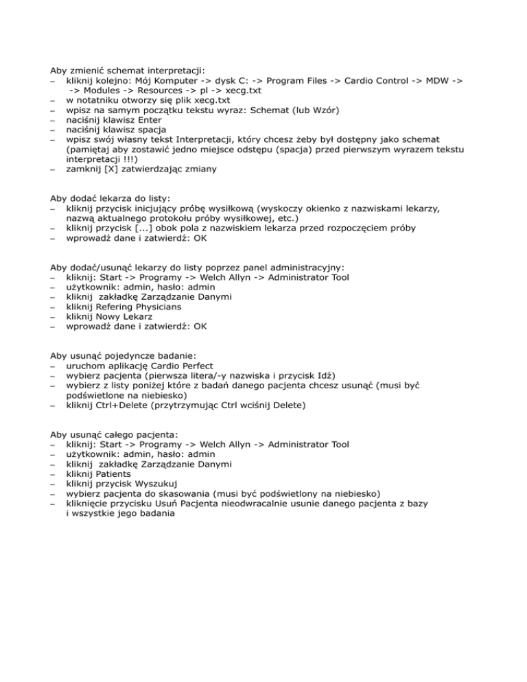 Aby zmienić schemat interpretacji: – kliknij kolejno: Mój Komputer -> dysk C: -> Program Files -> Cardio Control -> MDW -> -> Modules -> Resources -> pl -> xecg.txt – w notatniku otworzy się plik xecg.txt – wpisz na samym początku tekstu wyraz: Schemat (lub Wzór) – naciśnij klawisz Enter – naciśnij klawisz spacja – wpisz swój własny tekst Interpretacji, który chcesz żeby był dostępny jako schemat (pamiętaj aby zostawić jedno miejsce odstępu (spacja) przed pierwszym wyrazem tekstu interpretacji !!!) – zamknij [X] zatwierdzając zmiany Aby dodać lekarza do listy: – kliknij przycisk inicjujący próbę wysiłkową (wyskoczy okienko z nazwiskami lekarzy, nazwą aktualnego protokołu próby wysiłkowej, etc.) – kliknij przycisk [...] obok pola z nazwiskiem lekarza przed rozpoczęciem próby – wprowadź dane i zatwierdź: OK Aby dodać/usunąć lekarzy do listy poprzez panel administracyjny: – kliknij: Start -> Programy -> Welch Allyn -> Administrator Tool – użytkownik: admin, hasło: admin – kliknij zakładkę Zarządzanie Danymi – kliknij Refering Physicians – kliknij Nowy Lekarz – wprowadź dane i zatwierdź: OK Aby usunąć pojedyncze badanie: – uruchom aplikację Cardio Perfect – wybierz pacjenta (pierwsza litera/-y nazwiska i przycisk Idź) – wybierz z listy poniżej które z badań danego pacjenta chcesz usunąć (musi być podświetlone na niebiesko) – kliknij Ctrl+Delete (przytrzymując Ctrl wciśnij Delete) Aby usunąć całego pacjenta: – kliknij: Start -> Programy -> Welch Allyn -> Administrator Tool – użytkownik: admin, hasło: admin – kliknij zakładkę Zarządzanie Danymi – kliknij Patients – kliknij przycisk Wyszukuj – wybierz pacjenta do skasowania (musi być podświetlony na niebiesko) – kliknięcie przycisku Usuń Pacjenta nieodwracalnie usunie danego pacjenta z bazy i wszystkie jego badania