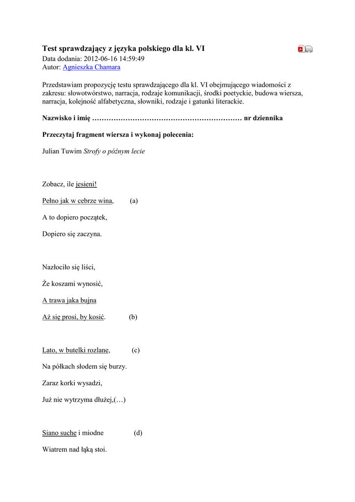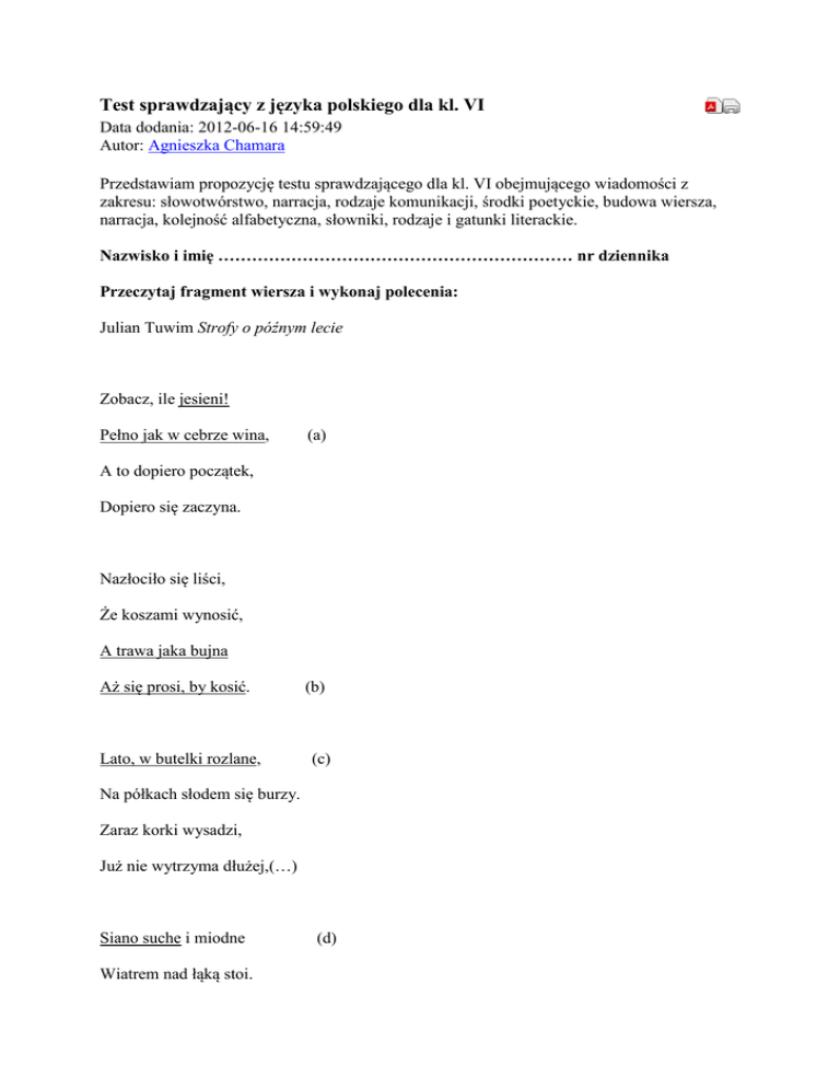 Test sprawdzający z języka polskiego dla kl. VI Data dodania: 2012-06-16 14:59:49 Autor: Agnieszka Chamara Przedstawiam propozycję testu sprawdzającego dla kl. VI obejmującego wiadomości z zakresu: słowotwórstwo, narracja, rodzaje komunikacji, środki poetyckie, budowa wiersza, narracja, kolejność alfabetyczna, słowniki, rodzaje i gatunki literackie. Nazwisko i imię ……………………………………………………… nr dziennika Przeczytaj fragment wiersza i wykonaj polecenia: Julian Tuwim Strofy o późnym lecie Zobacz, ile jesieni! Pełno jak w cebrze wina, (a) A to dopiero początek, Dopiero się zaczyna. Nazłociło się liści, Że koszami wynosić, A trawa jaka bujna Aż się prosi, by kosić. Lato, w butelki rozlane, (b) (c) Na półkach słodem się burzy. Zaraz korki wysadzi, Już nie wytrzyma dłużej,(…) Siano suche i miodne Wiatrem nad łąką stoi. (d) Westchnie, wonią powieje I znowu się uspokoi. Obłoki leżą w stawie, Jak płatki w szklance wody. (e) Laską pluskam ostrożnie, Aby nie zmącić pogody. Wiersz składa się z …… zwrotek, w każdej zwrotce są cztery ………………. 1. 2. Nazwij podkreślone środki stylistyczne: a) ……………………………………. b) ……………………………………. c) ……………………………………. d) ……………………………………. e) ……………………………………. 3. Odpowiedz jednym zdaniem: do jakiego rodzaju literackiego należy utwór Strofy o późnym lecie? ……………………………………………………………………………………………… 4. Ułóż rodzinę wyrazów do rzeczownika woda (musisz podać przynajmniej 2 wyrazy) ……………………………………………………………………………………………… 5. Dopisz po jednym wyrazie bliskoznacznym do podanych słów: pełno – bujna – woń – obłoki – 6. Podane wyrazy wpisz w odpowiednie miejsce w tabeli: dom, szkolić, ogród, cukiernik, przydomowy, szkoła, ogrodnik, cukier Wyraz podstawowy Wyraz pochodny 7. Podane wyrazy uporządkuj w dwóch rodzinach wyrazów, zaznacz rdzeń i formanty, nazwij je. Szkoła, uczyć, przedszkolanka, szkolić, nauczanie, nauczyciel, pozaszkolne, nauczyć 8. Jaki to rodzaj komunikacji? gest machania ręką …………………………… RMFfm – najlepsza muzyka……………………………. 9. Jaki to rodzaj narracji? « Za rządów księcia Popiela, nieopodal Kruszwicy mieszkał kmieć zwany Piastem. Uprawiał ziemię, hodował pszczoły, a oprócz tego trudnił się kołodziejstwem – wyrabiał wozy. Wraz z żoną Rzepichą żyli zgodnie i spokojnie, wychowując dzieci» M. Grądzka, Legendy polskie ……………………………………………………… «Pani powiedziała nam, że dyrektor szkoły odchodzi na emeryturę. Żeby to uczcić, przygotowuje się niezwykłe rzeczy (…) Aktorami jak zawsze będziemy my, uczniowie. Każda klasa coś przygotowuje (…) Pani powiedziała nam, że odegramy sztukę. Sztukę taką jak w teatrach i w telewizorze Kleofasa, bo mój tata ciągle jeszcze nie chce kupić telewizora» Sempe, Gościnny, Mikołajek ……………………………………………………………… «Bartek nie namyślał się ani sekundy. Z trudem, kalecząc kolana i ręce, wspiął się po stromej ścianie i już po chwili znalazł się w otworze. Musiał się spieszyć. Zza zakrętu dobiegał gwar hałaśliwych głosów.» D. Terakowska, Władca Lewawu ……………………………………………………………… «Ulegając namowom autentycznego myśliwego, przybyłem na to miejsce, by sprawdzić, czy wszystko istotnie jest tak, jak to przedstawia on w swoich gorących słowach, czy też jest to produkt jego rozgorączkowanej, wybujałej wyobraźni» T. Goździkiewicz, Opowieści krajobrazu ……………………………………………………………. 10. Do jakiego rodzaju literackiego należą fragmenty tekstów z zadania 9.? ……………………………………………………………… 11. W swojej biblioteczce układasz książki według kolejności alfabetycznej tytułów, zapisz książki wymienione w zad. 9. w takiej kolejności, w jakiej stałyby u Ciebie na półce. ……………………………………………………….. ……………………………………………………….. ……………………………………………………….. ……………………………………………………….. 12. Żeby sprawdzić poprawny zapis wyrazu hałaśliwy, skorzystasz ze ………………………………………………………………….. 13. Żeby sprawdzić znaczenie wyrazu kinomaniak, skorzystasz ze …………………………………………………………………… 14. Podkreśl właściwe wyrazy. Pisząc własną ocenę postępowania bohatera, wypowiem się w sposób subiektywny/obiektywny, ponieważ wyrażam w niej bezstronność/osobiste uczucia i emocje. 15. Wymień przynajmniej trzy cechy charakterystyczne fraszki. 16. W podanym fragmencie wiersza podkreśl rymy, nazwij ich rodzaj. a) Jakiż to chłopiec piękny i młody? Jaka to obok dziewica? Brzegami sinej Świtezi wody Idą przy świetle księżyca. …………………………………………………. O tej swojej przyjaźni raz w cieniu dąbrowy Kiedy gadali, łącząc swojo czułe mowy Do kukań zozul i krakań gawronich, Alić ryknęło raptem coś koło nich. ……………………………………………….... Trafia na ciało, maca: jak trup leży; Wącha: a z tego zapachu, Który mógł być skutkiem strachu. Wnosi, że to nieboszczyk i że już nieświeży. …………………………………………… Agnieszka Chamara