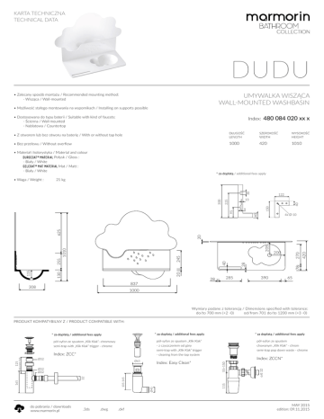 KARTA TECHNICZNA TECHNICAL DATA DUDU UMYWALKA WISZĄCA WALL-MOUNTED WASHBASIN • Zalecany sposób montażu / Recommended mounting method: - Wisząca / Wall-mounted • Możliwość stałego montowania na wspornikach / Installing on supports possible • Dostosowana do typu baterii / Suitable with kind of faucets: - Ścienna / Wall mounted - Nablatowa / Countertop Index: • Z otworem lub bez otworu na baterię / With or without tap hole • Bez przelewu / Without overflow • Materiał i kolorystyka / Material and colour Połysk / Gloss : - Biały / White Mat / Matt : - Biały / White DŁUGOŚĆ LENGTH SZEROKOŚĆ WIDTH WYSOKOŚĆ HEIGHT 1000 420 1010 * za dopłatą / additional fees apply 21 kg 225 40 150 9 40 4x Ø 10 420 270 78 40 245 20 308 285 28 837 200 28 205 20 625 1010 255 130 115 122 13 95 300 30 • Waga / Weight : 480 084 020 xx x 390 65 1000 Wymiary podane z tolerancją / Dimensions specified with tolerance: do/to 700 mm (+2 -0) od/from 701 do/to 1200 mm (+3 -0) PRODUKT KOMPATYBILNY Z / PRODUCT COMPATIBLE WITH: * za dopłatą / additional fees apply Index: Easy Clean* .3ds .dwg .dxf Ø40 165 105-145 32 Ø32 Ø32 Index: ZCCN* 55>150 Ø63 125 Adjustable Stalk Index: ZCC* Ø32 pół-syfon ze spustem chowanym „Klik Klak” - chrom semi-trap pop down waste - chrome 115 pół-syfon ze spustem „Klik Klak”- chromowy semi-trap with „Klik Klak” trigger - chrome do pobrania / downloads www.marmorin.pl * za dopłatą / additional fees apply pół-syfon ze spustem „Klik Klak” - z czyszczeniem od góry semi-trap with „Klik Klak” trigger - cleaning from the top system o/d 32 * za dopłatą / additional fees apply MAY 2015 edition: 09.11.2015
