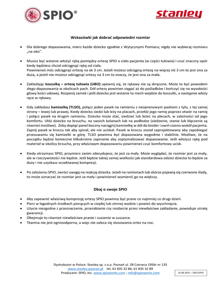 Wskazówki jak dobrać odpowiedni rozmiar Dla dobrego dopasowania, mierz każde dziecko zgodnie z Wytycznymi Pomiaru; nigdy nie wybieraj rozmiaru „na oko”. Musisz być wstanie włożyć rękę pomiędzy ortezę SPIO a ciało pacjenta (w części tułowia) i czuć znaczny opór kiedy będziesz chciał odciągnąć rękę od ciała. Powinieneś móc odciągnąć ortezę na ok 3 cm. Jeżeli możesz odciągną ortezę na więcej niż 3 cm to jest ona za duża, a jeżeli nie możesz odciągnąć ortezy na 3 cm to znaczy, że jest ona za mała. Zakładając koszulkę – ortezę tułowia (UBO) upewnij się, że rękawy nie są skręcone. Może to być powodem złego dopasowania w okolicach pach. Dół ortezy powinien sięgać aż do pośladków i kończyć się na wysokości głowy kości udowej. Rozpenij zamek i jeśli dziecko jest wstanie to niech wejdzie do koszulki, a następnie włoży ręce w rękawy. Gdy zakładasz kamizelkę (TLSO), połącz jeden pasek na ramieniu z neoprenowym paskiem z tyłu, z tej samej strony – lewej lub prawej. Kiedy dziecko siedzi lub leży na placach, przełóż jego ramię poprzez otwór na ramię i połącz pasek na drugim ramieniu. Dziecko może stać, siedzieć lub leżeć na plecach, w zależności od jego komfortu. Ułóż dziecko na brzuchu, na swoich kolanach lub na podłodze (siedzenie, stanie lub klęczenie są również możliwe). Żeby dopiąć panel boczny naciągnij kamizelkę w dół do bioder i owiń ciasno wokół pacjenta. Zapnij pasek w kroczu tak aby spinał, ale nie uciskał. Pasek w kroczu został zaprojektowany aby zapobiegać przesuwaniu się kamizelki w górę. TLSO powinna być dopasowana wygodnie i stabilnie. Możliwe, że na początku będzie konieczne kilkukrotne zapinanie aby zoptymalizować dopasowanie. Jeśli włożysz rękę pod materiał w okolicy brzucha, przy właściwym dopasowaniu powinieneś czuć komfortowy ucisk. Kiedy otrzymasz SPIO, przymierz zanim zdecydujesz, że jest za mały. Może wyglądać, że rozmiar jest za mały, ale w rzeczywistości nie będzie. Jeśli będzie takiej samej wielkości jak standardowa odzież dziecka to będzie za duży i nie uzyskasz oczekiwanej kompresji. Po założeniu SPIO, zwróci uwagę na reakcję dziecka. Jeżeli na ramionach lub skórze pojawią się czerwone ślady, to może oznaczać że rozmiar jest za mały i powinieneś wymienić go na większy. Dbaj o swoje SPIO Aby zapewnić właściwą kompresję ortezy SPIO powinny być prane co najmniej co drugi dzień. Pierz w łagodnych środkach piorących w ciepłej lub zimnej wodzie i powieś do wyschnięcia. Użycie niezgodne z przeznaczenie, przerabianie czy rozdarcie przez niewłaściwe zakładanie, powoduje utratę gwarancji. Obejmuje to również niewłaściwe pranie i suszenie w suszarce. Tkanina nie jest ognioodporna, a więc nie zaleca się stosowania ortez na noc. Dystrybutor w Polsce: Stanley sp. z o.o. Poznań ul. 28 Czerwca 1956r nr 135 www.stanley.poznan.pl tel. 61 835 32 86; 61 835 32 89 Producent: SPIO, Inc. www.spioworks.com ; [email protected] 25.08.2015 – 1001/SPIO