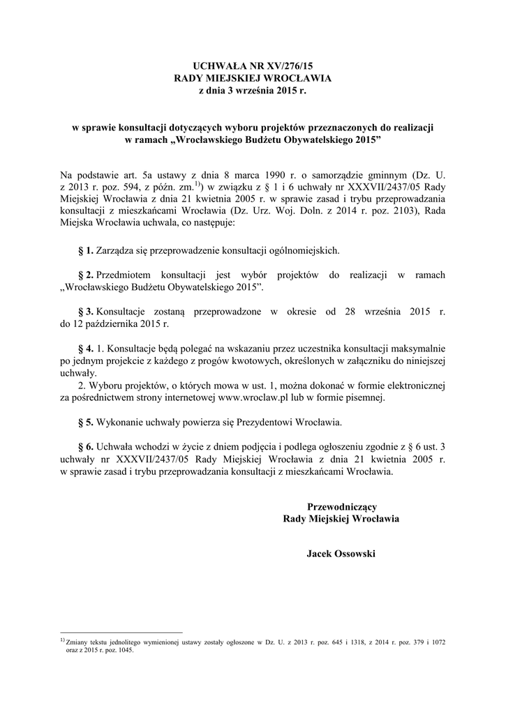 UCHWAŁA NR XV/276/15 RADY MIEJSKIEJ WROCŁAWIA z dnia 3 września 2015 r. w sprawie konsultacji dotyczących wyboru projektów przeznaczonych do realizacji w ramach „Wrocławskiego Budżetu Obywatelskiego 2015” Na podstawie art. 5a ustawy z dnia 8 marca 1990 r. o samorządzie gminnym (Dz. U. z 2013 r. poz. 594, z późn. zm.1)) w związku z § 1 i 6 uchwały nr XXXVII/2437/05 Rady Miejskiej Wrocławia z dnia 21 kwietnia 2005 r. w sprawie zasad i trybu przeprowadzania konsultacji z mieszkańcami Wrocławia (Dz. Urz. Woj. Doln. z 2014 r. poz. 2103), Rada Miejska Wrocławia uchwala, co następuje: § 1. Zarządza się przeprowadzenie konsultacji ogólnomiejskich. § 2. Przedmiotem konsultacji jest wybór „Wrocławskiego Budżetu Obywatelskiego 2015”. projektów do realizacji w ramach § 3. Konsultacje zostaną przeprowadzone w okresie od 28 września 2015 r. do 12 października 2015 r. § 4. 1. Konsultacje będą polegać na wskazaniu przez uczestnika konsultacji maksymalnie po jednym projekcie z każdego z progów kwotowych, określonych w załączniku do niniejszej uchwały. 2. Wyboru projektów, o których mowa w ust. 1, można dokonać w formie elektronicznej za pośrednictwem strony internetowej www.wroclaw.pl lub w formie pisemnej. § 5. Wykonanie uchwały powierza się Prezydentowi Wrocławia. § 6. Uchwała wchodzi w życie z dniem podjęcia i podlega ogłoszeniu zgodnie z § 6 ust. 3 uchwały nr XXXVII/2437/05 Rady Miejskiej Wrocławia z dnia 21 kwietnia 2005 r. w sprawie zasad i trybu przeprowadzania konsultacji z mieszkańcami Wrocławia. Przewodniczący Rady Miejskiej Wrocławia Jacek Ossowski 1) Zmiany tekstu jednolitego wymienionej ustawy zostały ogłoszone w Dz. U. z 2013 r. poz. 645 i 1318, z 2014 r. poz. 379 i 1072 oraz z 2015 r. poz. 1045. Załącznik do uchwały nr XV/276/15 Rady Miejskiej Wrocławia z dnia 3 września 2015 r. WROCŁAWSKI BUDŻET OBYWATELSKI 2015 L.p. Nr projektu Lokalizacja projektu Nazwa projektu Kwota 1 1 Centrum Wrocławia Rowerowy Wrocław II - bezpiecznie z osiedla do centrum 2 2 Działka nr 78/3, obręb Karłowice, arkusz mapy 9 Park Karłowice, plac zabaw i siłownia w parku przy Wyższej Szkole Oficerskiej przy 500 000,00 zł ul. Czajkowskiego we Wrocławiu –podejście trzecie, prosimy o głos w słusznej sprawie :-) 3 3 ul. Skarbowców 52, Działka nr 40/84, AM-5, obręb Krzyki Wyspa Skarbów – zagospodarowanie terenu zrujnowanego fortu przy ul. Skarbowców na Miejskie Centrum Rekreacji 2 000 000,00 zł 4 4 Obszar osiedla Borek ograniczony obwodnicą kolejową (wschód/południe), aleją Hallera/ulicą Wiśniową (północ) oraz ulicą Ślężną (zachód). Ratujmy drzewa na Borku - Usunięcie jemioły nowoczesną metodą ze 100 starych drzew. 50 000,00 zł 5 6 Legnicka/ Nabycińska Budowa przejścia dla pieszych na Legnickiej/ Nabycińskiej 1 200 000,00 zł 6 7 Działki między ulicami Tymiankową, Cynamonową i Anyżową (obręb Lipa Piotrowska: AR_5, 3/8 i AR_5, 3/7) Kompleks sportowo-rekreacyjny przy ul. Tymiankowej dla mieszkańców Lipy Piotrowskiej, Widawy i Świniar 2 000 000,00 zł 7 9 Nowy Świat/ Cieszyńskiego Bezpieczne przejście przy Arsenale 800 000,00 zł 8 11 okolice placu Pereca, Wrocław Bezpieczny plac Pereca 300 000,00 zł 9 12 19, 20 - Psie Pole Oświetlenie na nowym chodniku przy ulicy Gorlickiej. 100 000,00 zł 10 15 16/3,16/1,15/3 - Psie Pole Aranżacja skrzyżowania Litewska / Gorlicka / Tarasa Szewczenki 140 000,00 zł 11 17 Zajezdnia tramwajowa nr IV ul. Powstańców Śląskich 209 Renowacja autobusu Jelcz RTO - Fredruś 420 000,00 zł 12 21 Most Grunwaldzki (od strony placu Społecznego) Przejście dla pieszych przy M. Grunwaldzkim 500 000,00 zł 13 22 Ulica Cybulskiego od placu Maksa Borna do Drobnera Nowe Nadodrze - Skwer Cybulskiego 150 000,00 zł 14 23 Własność Gminy Wrocław, Nazwa Obrębu Plac Grunwaldzki, Numer arkusza mapy 13, Numer działki 34 Stojaki na rowery przy Gimnazjum nr 15 150 000,00 zł 15 25 Wrocław, ul. Pełczyńska 33, obszar mapy: Lipa Piotrowska, Arkusz mapy Nr 10 - działka 21 oraz Arkusz Mapy Nr 12 działka 3 Organizacja działań wystawienniczo-szkoleniowych w Społecznym, Mobilnym Muzeum Militarnym we Wrocławiu im. Jakuba M. Łaciaka (w organizacji) 860 000,00 zł 16 26 Trójkąt ulic: Piękna, Jesionowa, Otmuchowska; działki nr 68 i 69/2, arkusz mapy 29, obręb Południe Zróbmy piękny skwer. Rewitalizacja skweru położonego w trójkacie ulic: Piękna, Jesionowa, Otmuchowska 150 000,00 zł 2 000 000,00 zł 1 Załącznik do uchwały nr XV/276/15 Rady Miejskiej Wrocławia z dnia 3 września 2015 r. 17 27 Chodniki u zbiegu ulic Pięknej i Bardzkiej w pobliżu Kościoła PW Ducha Św. We Wrocławiu; Gaj, AR_5, 2/9 i 2/39 Chodniki przy kościele pw. Ducha Świętego.Piękna-Bardzka 18 30 ul. Lwowska 32-42 / Zaporoska 25-31a / Lubuska 54-60; Grabiszyn, AR_13, 19/28 i 21/8 Zagospodarowanie wnętrza międzyblokowego Lwowska 32-42 / Zaporoska 25-31a 150 000,00 zł / Lubuska 54-60 19 32 teren między ulicami : Barlickiego 11-25 - Nowowiejska 39-47 bł. Edyty Stein - Kluczborska 30-34 Projekt Obywatelski odnowy podwórka "Podwórze: Nowowiejska - Stein Barlickiego - Kluczborska" 500 000,00 zł 20 37 ul. Modlińskiej na odcinku od ul. Sokolej do ul. Racławickiej po stronie zachodniej (numery parzyste) Remont chodnika na ul. Modlińskiej na odcinku od ul. Sokolej do ul. Racławickiej po stronie zachodniej (numery parzyste) 180 000,00 zł 21 39 ul. Dobrzyńska 21-23, Południe, AR_1, parking w I lokalizacji: 15/2, 16/4, 24/3, parking w II lokalizacji: 21 Utworzenie przy ul. Dobrzyńskiej parkingu dla mieszkańców Wrocławia, w szczególności pacjentów Centrum Medycznego "Dobrzyńska" oraz wiernych Parafii p.w. Św. Maurycego 650 000,00 zł 22 41 Działka między ulicami Tymiankową i Cynamonową (obręb Lipa Międzypokoleniowe Centrum Rekreacji – Tymiankowa (II etap) Piotrowska: AR_5, 3/8 i AR_5, 3/7) 150 000,00 zł 23 43 ul. Gazowa 16, Kamieniecka 72 (kościół św. Stefa