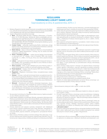 Duma Przedsiębiorcy 1/2 Regulamin terminowej lokaty BABIE LATO (wprowadzony w dniu 8 października 2015 r. ) §1 1. Niniejszy Regulamin określa zasady otwierania i prowadzenia przez Idea Bank S.A. rachunku terminowej lokaty oszczędnościowej pod nazwą Lokata BABIE LATO zakładanej dla osób fizycznych będących konsumentami. 2. Użyte w Regulaminie określenia oznaczają: a) Bank – Idea Bank Spółkę Akcyjną z siedzibą w Warszawie, ul. Przyokopowa 33, 01-208 Warszawa, wpisaną do rejestru przedsiębiorców prowadzonego przez Sąd Rejonowy dla m.st. Warszawy, XII Wydział Gospodarczy Krajowego Rejestru Sądowego, pod numerem KRS 0000026052, NIP 5260307560, REGON 011063638, której kapitał zakładowy wynosi 156 803 962 PLN (w pełni opłacony). b) Contact Center – jednostkę organizacyjną Banku świadczącą usługę telefonicznej obsługi aktualnych oraz potencjalnych Klientów w zakresie informacyjnym, sprzedażowym oraz transakcyjnym. c) Dzień roboczy − dzień, w którym Bank jest otwarty w celu prowadzenia działalności objętej Regulaminem i Umową, inny niż sobota lub dzień ustawowo wolny od pracy. d) Klient / Posiadacz rachunku – osobę fizyczną będącą konsumentem w rozumieniu art. 22¹ Ustawy z dnia 23 kwietnia 1964 roku Kodeks cywilny (Dz. U. z 1964 r. Nr 16, poz. 93 ze zm.), która zawarła Umowę z Bankiem. e) Lokata − rachunek terminowej lokaty oszczędnościowej pod nazwą Lokata BABIE LATO, prowadzony przez Bank na rzecz Klienta na warunkach określonych w Regulaminie. f) Okres umowny – okres, na jaki zakładana jest przez Klienta Lokata, liczony od dnia wpływu środków na rachunek wskazany przez Bank. g) Prawo bankowe – Ustawę z dnia 29 sierpnia 1997 roku Prawo bankowe (DzU z 2012 r., poz. 1376 ze zm.). h) Regulamin –Regulamin terminowej lokaty oszczędnościowej Lokata BABIE LATO. i) Umowa – Umowę o rachunek terminowej lokaty oszczędnościowej (Lokaty) zawieraną pomiędzy Bankiem a Klientem za pośrednictwem strony internetowej Banku www.ideabank.pl, przy użyciu Bankowości Internetowej, lub za pośrednictwem Contact Center, przy użyciu Bankowości Telefonicznej, lub w Placówce Banku. j) Wniosek – oświadczenie woli Klienta, stanowiące dyspozycję otwarcia Lokaty, zawierające dane niezbędne do zawarcia Umowy, składane za pośrednictwem strony internetowej Banku www.ideabank.pl, przy użyciu Bankowości Internetowej, lub za pośrednictwem Contact Center, przy użyciu Bankowości Telefonicznej, lub w Placówce Banku. §2 1. Na warunkach określonych w Regulaminie Bank otworzy i będzie prowadzić na rzecz Klienta rachunek Lokaty. 2. Lokata będzie zakładana na podstawie Wniosku, poprawnie złożonego przez Klienta za pośrednictwem strony internetowej Banku www.ideabank.pl, przy użyciu Bankowości Internetowej, lub za pośrednictwem Contact Center, przy użyciu Bankowości Telefonicznej, lub w Placówce Banku. We Wniosku Klient wskaże Bankowi adres e-mail do odbioru kierowanej do Klienta korespondencji dotyczącej Lokaty. 3. Umowa zawierana jest poprzez wymianę oświadczeń woli składanych przez Klienta, poprzez wypełnienie przez niego Wniosku i akceptację niniejszego Regulaminu wraz z regulaminem, o którym mowa w § 6 ust. 2, oraz przez Bank, poprzez założenie, udostępnienie i prowadzenie Klientowi Lokaty. 4. Bank otworzy Klientowi Lokatę w terminie jednego Dnia roboczego, licząc od dnia złożenia przez Klienta poprawnie wypełnionego Wniosku oraz dokonania przez niego przelewu środków pieniężnych na wskazany przez Bank 5. 6. 7. 8. rachunek bankowy. Przelew musi być dokonany z rachunku bankowego prowadzonego przez bank z siedzibą na terytorium Rzeczypospolitej Polskiej. Lokata służy do przechowywania (gromadzenia) środków pieniężnych przez okres ustalony z Bankiem. Rachunek Lokaty nie może być wykorzystywany do prowadzenia rozliczeń pieniężnych. Środki pieniężne zgromadzone na Lokacie objęte są obowiązkowym systemem gwarantowania na zasadach określonych w ustawie z dnia 14 grudnia 1994 r. o Bankowym Funduszu Gwarancyjnym (t.j. Dz.U. z 2009 r., Nr 84, poz. 711 ze zm.). Bank zapewnia zachowanie tajemnicy o posiadaniu i stanie Lokaty na zasadach określonych w Prawie bankowym. Bank nie prowadzi Lokaty wspólnej dla dwóch lub większej liczby Klientów. §3 1. Lokata zakładana jest przez Bank na podstawie poprawnie wypełnionego Wniosku oraz po otrzymaniu przez Bank środków przeznaczonych na założenie Lokaty. 2. Z Lokaty może skorzystać Klient, który w okresie ważności oferty złoży poprawnie wypełniony Wniosek. Oferta Lokaty na warunkach wprowadzonych niniejszym Regulaminem obowiązuje od dnia 8 października 2015 r. do odwołania, jednak nie krócej niż do dnia 9 października 2015 r. 3. Bank zastrzega sobie prawo do wprowadzania oferty Lokaty w formie krótkich edycji, o czym poinformuje za pośrednictwem witryny internetowej www.ideabank.pl. 4. Okres umowny Lokaty wynosi 4 miesiące. Po upływie Okresu umownego Lokata, zgodnie z Wnioskiem, może być odnowiona na kolejny umówiony okres 4 miesiące na warunkach określonych w Tabeli Oprocentowania dla Lokaty STANDARDOWEJ o Okresie umownym 3 miesiące, zgodnie z obowiązującą w dniu rozpoczęcia kolejnego Okresu umownego Tabelą Oprocentowania dostępną na stronie internetowej www.ideabank.pl. 5. Minimalna kwota Lokaty wynosi 1000 PLN. 6. Maksymalna kwota Lokaty wynosi 1 000 000 PLN. 7. Środki na Lokatę przyjmowane są w polskich złotych (PLN). 8. Odsetki od Lokaty będą kapitalizowane na koniec Okresu umownego i powiększą kwotę kapitału o kwotę należnych odsetek. §4 Oprocentowanie Lokaty jest stałe i wynosi w skali roku 2,85%. §5 1. W Okresie umownym nie można dokonywać dopłat do Lokaty ani częściowych wypłat z Lokaty. 2. Za dzień rozpoczęcia Okresu umownego uważa się późniejszą z następujących dat: uzgodnioną z Klientem datę rozpoczęcia Lokaty lub – jeśli środki pieniężne nie wpłyn