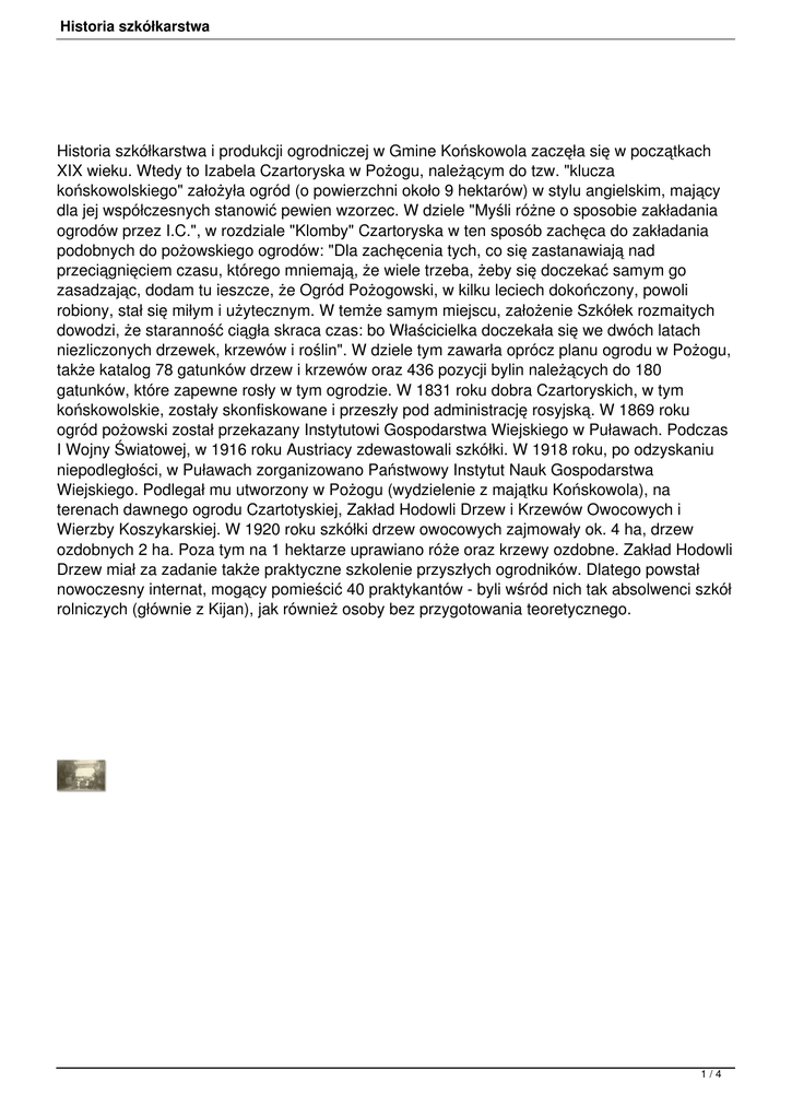 Historia szkółkarstwa Historia szkółkarstwa i produkcji ogrodniczej w Gmine Końskowola zaczęła się w początkach XIX wieku. Wtedy to Izabela Czartoryska w Pożogu, należącym do tzw. "klucza końskowolskiego" założyła ogród (o powierzchni około 9 hektarów) w stylu angielskim, mający dla jej współczesnych stanowić pewien wzorzec. W dziele "Myśli różne o sposobie zakładania ogrodów przez I.C.", w rozdziale "Klomby" Czartoryska w ten sposób zachęca do zakładania podobnych do pożowskiego ogrodów: "Dla zachęcenia tych, co się zastanawiają nad przeciągnięciem czasu, którego mniemają, że wiele trzeba, żeby się doczekać samym go zasadzając, dodam tu ieszcze, że Ogród Pożogowski, w kilku leciech dokończony, powoli robiony, stał się miłym i użytecznym. W temże samym miejscu, założenie Szkółek rozmaitych dowodzi, że staranność ciągła skraca czas: bo Właścicielka doczekała się we dwóch latach niezliczonych drzewek, krzewów i roślin". W dziele tym zawarła oprócz planu ogrodu w Pożogu, także katalog 78 gatunków drzew i krzewów oraz 436 pozycji bylin należących do 180 gatunków, które zapewne rosły w tym ogrodzie. W 1831 roku dobra Czartoryskich, w tym końskowolskie, zostały skonfiskowane i przeszły pod administrację rosyjską. W 1869 roku ogród pożowski został przekazany Instytutowi Gospodarstwa Wiejskiego w Puławach. Podczas I Wojny Światowej, w 1916 roku Austriacy zdewastowali szkółki. W 1918 roku, po odzyskaniu niepodległości, w Puławach zorganizowano Państwowy Instytut Nauk Gospodarstwa Wiejskiego. Podlegał mu utworzony w Pożogu (wydzielenie z majątku Końskowola), na terenach dawnego ogrodu Czartotyskiej, Zakład Hodowli Drzew i Krzewów Owocowych i Wierzby Koszykarskiej. W 1920 roku szkółki drzew owocowych zajmowały ok. 4 ha, drzew ozdobnych 2 ha. Poza tym na 1 hektarze uprawiano róże oraz krzewy ozdobne. Zakład Hodowli Drzew miał za zadanie także praktyczne szkolenie przyszłych ogrodników. Dlatego powstał nowoczesny internat, mogący pomieścić 40 praktykantów - byli wśród nich tak absolwenci szkół rolniczych (głównie z Kijan), jak również osoby bez przygotowania teoretycznego. 1/4 Historia szkółkarstwa Pracownicy ZHD w Pożogu przed Bramą wjazdową do zakładu Wybudowano także pakownię drzewek z magazynem, "pracownię" do szczepień zimowych, a w 1935 szklarnię. W przybliżeniu produkcja ZHD w Pożogu wynosiła 250 tysięcy drzewek owocowych i 50 tysięcy drzew i krzewów ozdobnych rocznie. W okresie międzywojennym Zakład uzyskał wiele nagród na ogólnopolskich wystawach ogrodniczych - we Lwowie (1923), Poznaniu (1926, 1929) czy Toruniu (1928). Docenieniem jego pracy była propozycja utworzenia w Pożogu centralnego zakładu do prowadzenia badań w sadownictwie i szkółkarstwie. Sukcesy Zakładu nie byłyby możliwe bez jego wspaniałych prcowników, wśród których należy wymienić inż. Stanisława Różyczko, Bronisława Szmigla, Tadeusza Marca - odpowiedzialnego za dział sadowniczy, Franciszka Gryniewicza, Władysława i Jana Sułków, czy pracującego już po II Wojnie Bronisława Kowalika. ZHD Pożóg, lata 30-te XX w. Zdjęcie przed internatem dla praktykantów 2/4 Historia szkółkarstwa II Wojna Światowa osłabiła gospodarstwo w Pożogu. W czasie wojny nie było popytu na produkty szkółkarstwa, w związku z tym wyzwolenie zastało szkółki z materiałem starym, trudnym do sprzedania.W 1948 ustalono dla Pożoga zakres czynności, obejmujący doświadczalnictwo szkółkarskie i prace produkcyjne. W 1951 roku ZHD w Pożogu został przejęty przez Instytut Sadownictwa. Zmienił się profil działalności gospodarstwa - zamiast drzew owocowych i ozdobnych, miało zakładać szkółki roślin jagodowych, w praktyce głównie porzeczek. Tymczasem utrzymywano tam wiele różnorodnych drzew i krzewów, oraz kolekcję kilkuset odmian dalii. Kolejna reorganizacja (maj 1956 roku) przekazała gospodarstwo w Pożogu do Rolniczego Rejonowego Zakładu Doświadczalnego w Końskowoli. Dzięki temu, obok dalszego rozwoju nasadzeń krzewów jagodowych, rośnie znowu liczba produkowanych drzewek owocowych. Wkrótce powstają pierwsze, nieliczne, gospodarstwa produkujące uprawy ogrodnicze, których nauczono się pracując w Zakładzie. Gmina Końskowola staje się powoli zagłębiem produkcji szkółkarskiej. W latach 60-tych następuje w Polsce dynamiczny rozwój szkółkarstwa róż. Do najlepszych firm, głównie z okolic Kutna i Warszawy dołącza pan Lucjan Kurowski z Końskowoli, wieloletni wiceprzewodniczący Polskiego Towarzystwa Przyjaciół Róż, Przewodniczący Sekcji Producentów Róż przy PTMR. W tym czasie w okolicach Końskowoli powstają kolejne liczne szkółki róż, których materiał (rosa multiflora), odmienny od produkowanego gdzie indziej w Polsce, pochodził z pożowskiego gospodarstwa RRZD Końskowola. Zmieniały się także metody i technologia produkcji, głównie dzięki pomysłowości producentów. Najbardziej znane innowacje były autorstwa B. Wituszyńskiego oraz Lucjana Kurowskiego. Pod koniec lat 70-tych rozpoczęła się w Polsce towarowa produkcja materiału szkółkarskiego w pojemnikach. W 1975 roku przy CNOS w Ożarowie Mazowieckim powstała Sekcja Producentów Szkółkarskiego Materiału Ozdobnego. Tu również zaznaczył się rejon Końskowoli jako zagłębie takiego szkółkarstwa - przewodniczącym został pan Lucjan Kurowski, zaś do najbardziej aktywnych członków należał pan Mieczysław Dębski z Młynek, który po odejściu z pracy w Zakładzie w Pożogu założył własne gospodarstwo. W latach osiemdziesiątych dołączyli do niego synowie, zakładając własne gospodarstwa. Obecnie szkółki Braci Dębskich gospodarują na obszarze ponad 120 ha. W latach 80-tych wraz ze spadkiem opłacalności produkcji róż, wielu szkółkarzy zmieniło profil produkcji, ale Końskowola ciągle jest zagłębiem szkółek tych kwiatów 