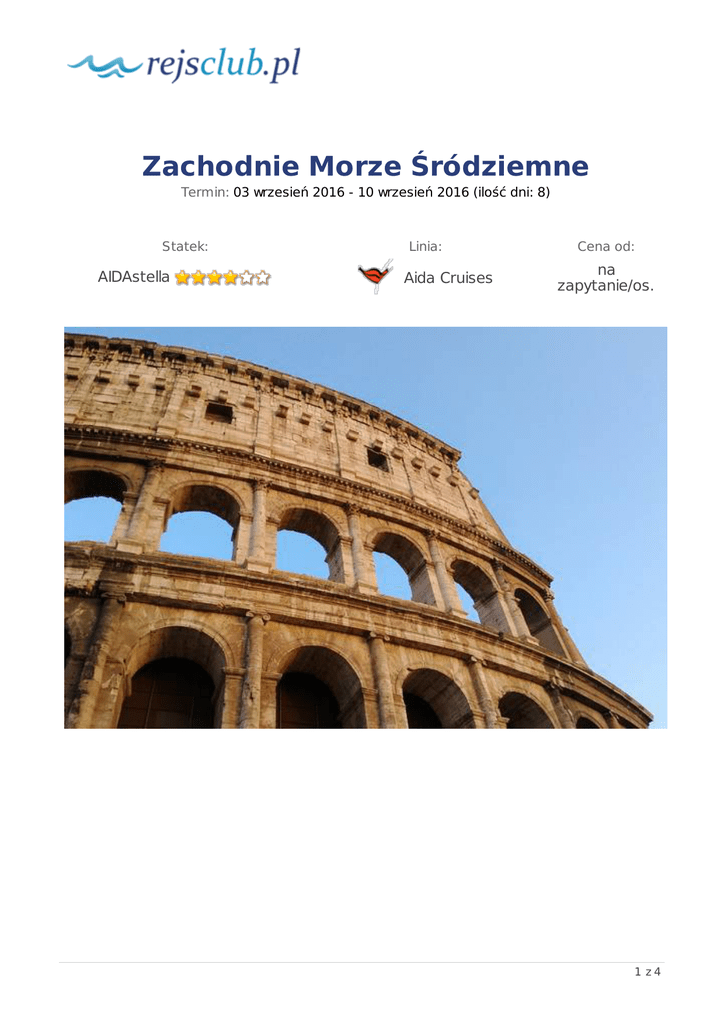 Zachodnie Morze Śródziemne Termin: 03 wrzesień 2016 - 10 wrzesień 2016 (ilość dni: 8) Statek: AIDAstella Linia: Aida Cruises Cena od: na zapytanie/os. 1 z4 TRASA REJSU Data Port Wpłynięcie Wypłynięcie Legenda dzień 1 sobota 03.09.2016 Palma de Mallorca, Majorka Hiszpania --:-- 22:00 dzień 2 niedziela 04.09.2016 Dzień na morzu --:-- --:-- dzień 3 poniedziałek 05.09.2016 Villefranche-sur-Mer, Nicea Francja 07:30 20:00 dzień 4 wtorek 06.09.2016 La Spezia Włochy 09:00 19:30 dzień 5 środa 07.09.2016 Civitavecchia, Rzym Włochy 08:00 22:00 dzień 6 czwartek 08.09.2016 Olbia, Sardynia Włochy 08:00 19:00 dzień 7 piątek 09.09.2016 Dzień na morzu --:-- --:-- dzień 8 sobota 10.09.2016 Palma de Mallorca, Majorka Hiszpania 06:00 --:-- 2 z4 CENNIK Cena katalogowa Kabina wewnętrzna od €1 045.00 Kabina zewnętrzna z oknem od €1 360.00 Kabina zewnętrzna z balkonem od €1 465.00 Suite (apartament) od €2 060.00 Kabina jednoosobowa na zapytanie 3 i 4 osoba dorosła w kabinie na zapytanie młodzież od 16 do 24 lat na zapytanie dziecko od 2 do 15 lat jako 3 i 4 osoba w kabinie na zapytanie Opłaty portowe Cena promocyjna w cenie Uwaga! Ceny za osobę w kabinie dwuosobowej. Ważna informacja: Armator niemieckojęzyczny. Cena zawiera: zakwaterowanie w kabinie wybranej kategorii; wyżywienie - 3 główne posiłki oraz napoje serwowane podczas posiłków; serwis bagażowy podczas wejścia i zejścia ze statku; serwis kabinowy; napiwki dla obsługi statku; korzystanie ze wszystkich urządzeń sportowo rekreacyjnych znajdujących się na pokładzie statku (basen, jacuzzi, sala fitness, itp.); udział we wszystkich imprezach organizowanych na statku (przedstawienia w teatrze, koncerty, programy animacyjne itp.). Cena nie zawiera: kosztów dojazdu do portu (na życzenie możliwość rezerwacji przelotu z niemieckich lotnisk w atrakcyjnej cenie); ewentualnych noclegów w hotelu przed/po rejsie i transferów; wycieczek fakultatywnych w trakcie rejsu; korzystania z barów, mini baru w kabinie oraz napojów zamawianych poza porami posiłków; korzystania z punktów usługowych (fryzjer, pralnia, fotograf, salon piękności i odnowy biologicznej, internet) i wydatków osobistych; ubezpieczenia KL, NNW i bagaż (około €1 - €1,5 osoba/dzień), kosztów wiz (tam gdzie wymagane). Pakiety napojów: 3 z4 AIDA Light: idealna oferta dla dzieci i nastolatków oraz osób, które chcą spędzić wolny czas bez alkoholu. W tym pakiecie zawarte są wszystkie napoje puszkowane oraz koktajle bezalkoholowe. Cena €9,90/osoba/dzień AIDA Comfort: pakiet zawiera napoje z pakietu Light oraz dodatkowo bezalkoholowe kawy i herbaty, gorącą czekoladę, domowe wina i szampana, dwa gatunki piwa z beczki, dwa kupony na koktajle o wartości do €7,50/rejs. Cena €19,90/osoba/dzień AIDA Family : pakiet rodzinny zawiera kombinację pakietów Light i Comfort w specjalnie skalkulowanych cenach: Small - 1 dorosły i 1 dziecko - €24,90/osoba/dzień Medium - 2 dorosłych i 1 dziecko - €39,90/osoba/dzień Large - 2 dorosłych i 2 dzieci - €44,90/osoba/dzień XLarge - 2 dorosłych i 3 dzieci - €49,90/osoba/dzień AIDA Genisser: pakiet oprócz bogatej oferty napojów zawiera także ofertę gastronomiczną. Pakiety są kwotowe i dają możliwość korzystania z restauracji a la carte i zamówienia wina w butelkach. Można je dokupować na pokładzie statku. Pakiety dostępne są dla osób powyżej 18 lat i mają wartość: €100 - płaci się €90 €200 - płaci się €180 €300 - płaci się €265 €400 - płaci się €350 4 z4