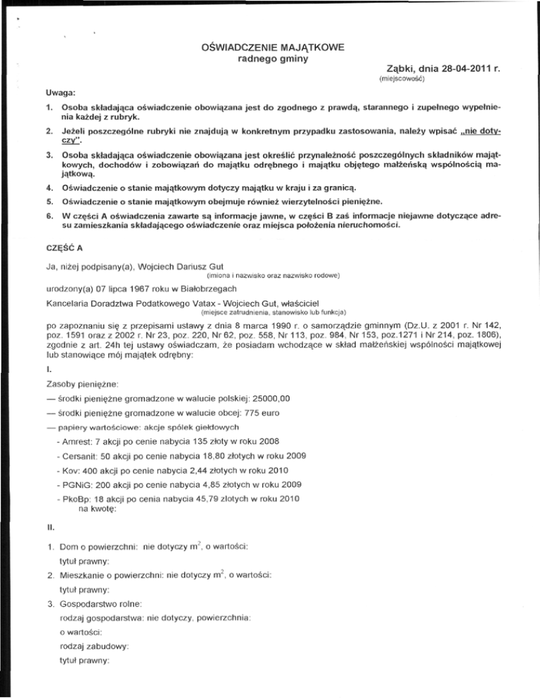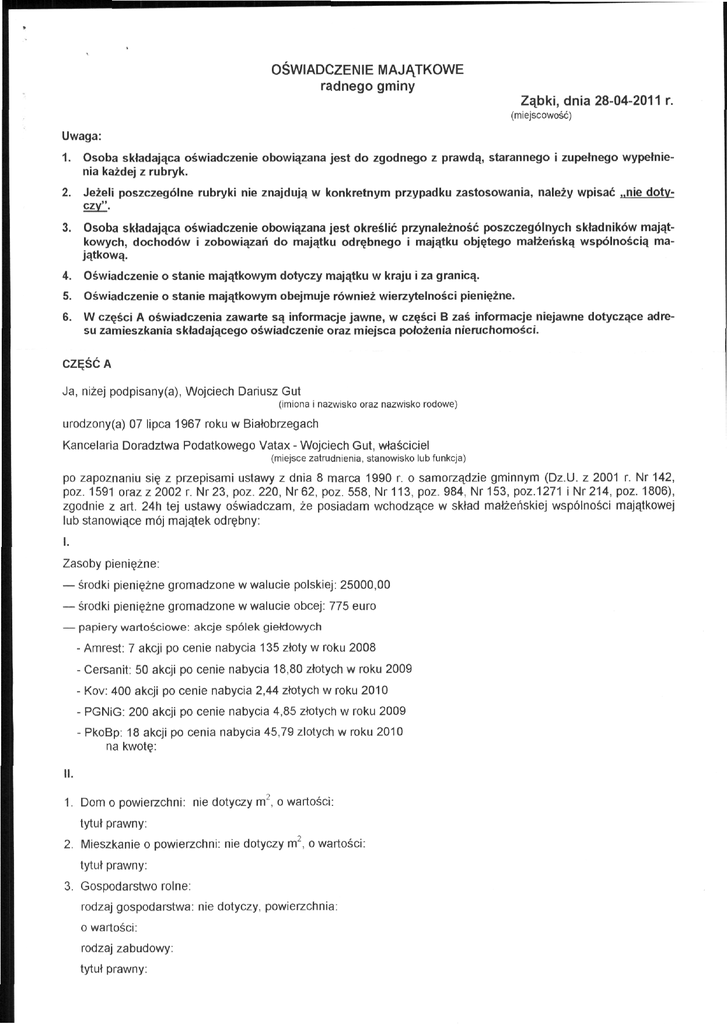 OŚWIADCZENIE MAJĄTKOWE radnego gminy Ząbki, dnia 28-04-2011 r. (miejscowość) Uwaga: 1. Osoba składająca oświadczenie obowiązana jest do zgodnego z prawdą, starannego i zupełnego wypełnienia każdej z rubryk. 2. Jeżeli poszczególne rubryki nie znajdują w konkretnym przypadku zastosowania, należy wpisać „nie dotyczy". 3. Osoba składająca oświadczenie obowiązana jest określić przynależność poszczególnych składników majątkowych, dochodów i zobowiązań do majątku odrębnego i majątku objętego małżeńską wspólnością majątkową. 4. Oświadczenie o stanie majątkowym dotyczy majątku w kraju i za granicą. 5. Oświadczenie o stanie majątkowym obejmuje również wierzytelności pieniężne. 6. W części A oświadczenia zawarte są informacje jawne, w części B zaś informacje niejawne dotyczące adresu zamieszkania składającego oświadczenie oraz miejsca położenia nieruchomości. CZĘŚĆ A Ja, niżej podpisany(a), Wojciech Dariusz Gut (imiona i nazwisko oraz nazwisko rodowe) urodzony(a) 07 lipca 1967 roku w Białobrzegach Kancelaria Doradztwa Podatkowego Vatax - Wojciech Gut, właściciel (miejsce zatrudnienia, stanowisko lub funkcja) po zapoznaniu się z przepisami ustawy z dnia 8 marca 1990 r. o samorządzie gminnym (Dz.U. z 2001 r. Nr 142, póz. 1591 oraz z 2002 r. Nr 23, póz. 220, Nr 62, póz. 558, Nr 113, póz. 984, Nr 153, poz.1271 i Nr 214, póz. 1806), zgodnie z art. 24h tej ustawy oświadczam, że posiadam wchodzące w skład małżeńskiej wspólności majątkowej lub stanowiące mój majątek odrębny: l. Zasoby pieniężne: — środki pieniężne gromadzone w walucie polskiej: 25000,00 — środki pieniężne gromadzone w walucie obcej: 775 euro — papiery wartościowe: akcje spółek giełdowych - Amrest: 7 akcji po cenie nabycia 135 złoty w roku 2008 - Cersanit: 50 akcji po cenie nabycia 18,80 złotych w roku 2009 - Kov: 400 akcji po cenie nabycia 2,44 złotych w roku 2010 - PGNiG: 200 akcji po cenie nabycia 4,85 złotych w roku 2009 - PkoBp: 18 akcji po cenią nabycia 45,79 złotych w roku 2010 na kwotę: 1. Dom o powierzchni: nie dotyczy m2, o wartości: tytuł prawny: 2. Mieszkanie o powierzchni: nie dotyczy m2, o wartości: tytuł prawny: 3. Gospodarstwo rolne: rodzaj gospodarstwa: nie dotyczy, powierzchnia: o wartości: rodzaj zabudowy: tytuł prawny: Z tego tytułu osiągnąłem(ęłam) w roku ubiegłym przychód i dochód w wysokości: 4. Inne nieruchomości: powierzchnia: 2 lokale biurowe o łącznej powierzchni 156m2 nabyte w roku 2008 i 2010 drogą zakupu o wartości: 900000 tytuł prawny: A 432/2010 i A 7307/2008 III. 1. Posiadam udziały w spółkach handlowych z udziałem gminnych osób prawnych lub przedsiębiorców, w których uczestniczą takie osoby — należy podać liczbę i emitenta udziałów: nie dotyczy udziały te stanowią pakiet większy niż 10% udziałów w spółce: nie dotyczy Z tego tytułu osiągnąłem(ęłam) w roku ubiegłym dochód w wysokości: nie dotyczy 2. Posiadam udziały w innych spółkach handlowych — należy podać liczbę i emitenta udziałów: nie dotyczy Z tego tytułu osiągnąłem(ęłam) w roku ubiegłym dochód w wysokości: nie dotyczy IV. 1. Posiadam akcje w spółkach handlowych z udziałem gminnych osób prawnych lub przedsiębiorców, w których uczestniczą takie osoby — należy podać liczbę i emitenta akcji: nie dotyczy akcje te stanowią pakiet większy niż 10% akcji w spółce: Z tego tytułu osiągnąłem(ęłam) w roku ubiegłym dochód w wysokości: 2. Posiadam akcje w innych spółkach handlowych — należy podać liczbę i emitenta akcji: Z tego tytułu osiągnąłem(ęłam) w roku ubiegłym dochód w wysokości: V. Nabyłem(am) (nabył mój małżonek, z wyłączeniem mienia przynależnego do jego majątku odrębnego) od Skarbu Państwa, innej państwowej osoby prawnej, jednostek samorządu terytorialnego, ich związków lub od komunalnej osoby prawnej następujące mienie, które podlegało zbyciu w drodze przetargu — należy podać opis mienia i datę nabycia, od kogo: nie dotyczy VI. 1. Prowadzę działalność gospodarczą (należy podać formę prawną i przedmiot działalności): — osobiście Kancelaria Doradztwa Podatkowego Vatax - Wojciech Gut (doradztwo podatkowe) - wspólnie z innymi osobami - Vatax s.c. Wojciech Gut, Jolanta Gut (wynajem). Z tego tytułu osiągnąłem(ęłam) w roku ubiegłym dochód w wysokości: 159400,00 2. Zarządzam działalnością gospodarczą lub jestem przedstawicielem pełnomocnikiem takiej działalności (należy podać formę prawną i przedmiot działalności): nie dotyczy - osobiście - wspólnie z innymi osobami Z tego tytułu osiągnąłem(ęłam) w roku ubiegłym dochód w wysokości: VII. W spółkach handlowych (nazwa, siedziba spółki): nie dotyczy — jestem członkiem zarządu (od kiedy): — jestem członkiem rady nadzorczej (od kiedy): — jestem członkiem komisji rewizyjnej (od kiedy): Z tego tytułu osiągnąłem(ęłam) w roku ubiegłym przychód i dochód w wysokości: VIII. Inne dochody osiągane z tytułu zatrudnienia lub innej działalności zarobkowej lub zajęć, z podaniem kwot uzyskiwanych z każdego tytułu: nie dotyczy IX. Składniki mienia ruchomego o wartości powyżej 10 000 złotych (w przypadku pojazdów mechanicznych należy podać markę, model i rok produkcji): Infiniti FX 35, 2005, Mercedes A- klasa, 2001 X. Zobowiązania pieniężne o wartości powyżej 10 000 złotych, w tym zaciągnięte kredyty i pożyczki oraz warunki, na jakich zostały udzielone (wobec kogo, w związku z jakim zdarzeniem, w jakiej wysokości): Pożyczka gotówkowa w kwocie 97000 w Citi Bank z 2008 roku, stan zadłużenia 58839,24 na zakup lokalu. Zobowiązanie w stosunku do Max Art.- A spółka z o.o. w wysokości 300000 na zakup lokalu. Powyższe oświadczenie składam świadomy(a), iż na podstawie art. 233 § 1 Kodeksu karnego za podanie nieprawdy lub zatajenie prawdy grozi kara pozbawienia wolno