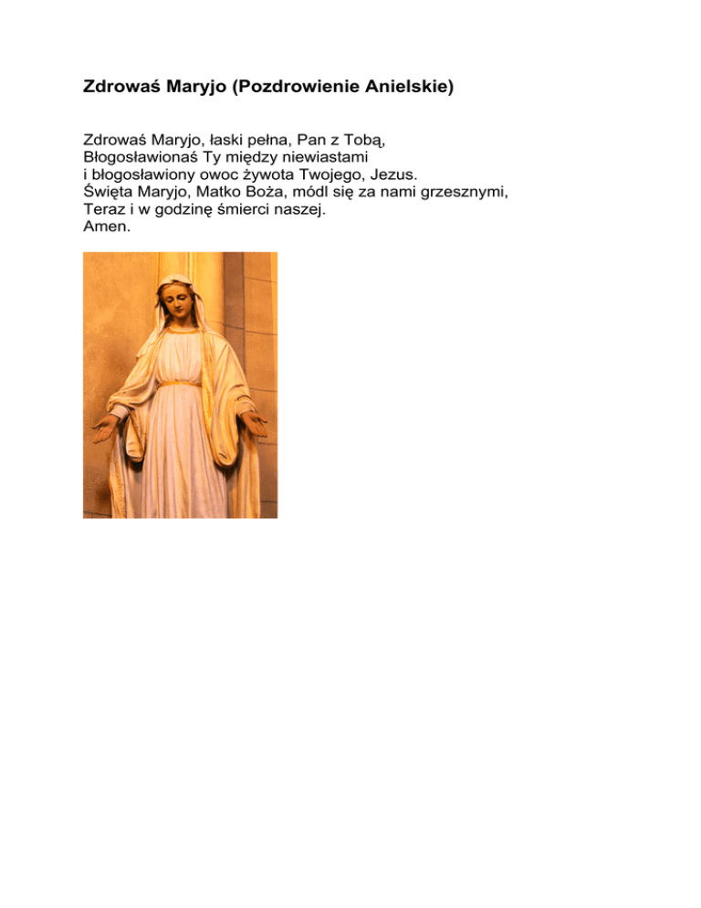 Zdrowaś Maryjo (Pozdrowienie Anielskie) Zdrowaś Maryjo, łaski pełna, Pan z Tobą, Błogosławionaś Ty między niewiastami i błogosławiony owoc żywota Twojego, Jezus. Święta Maryjo, Matko Boża, módl się za nami grzesznymi, Teraz i w godzinę śmierci naszej. Amen.