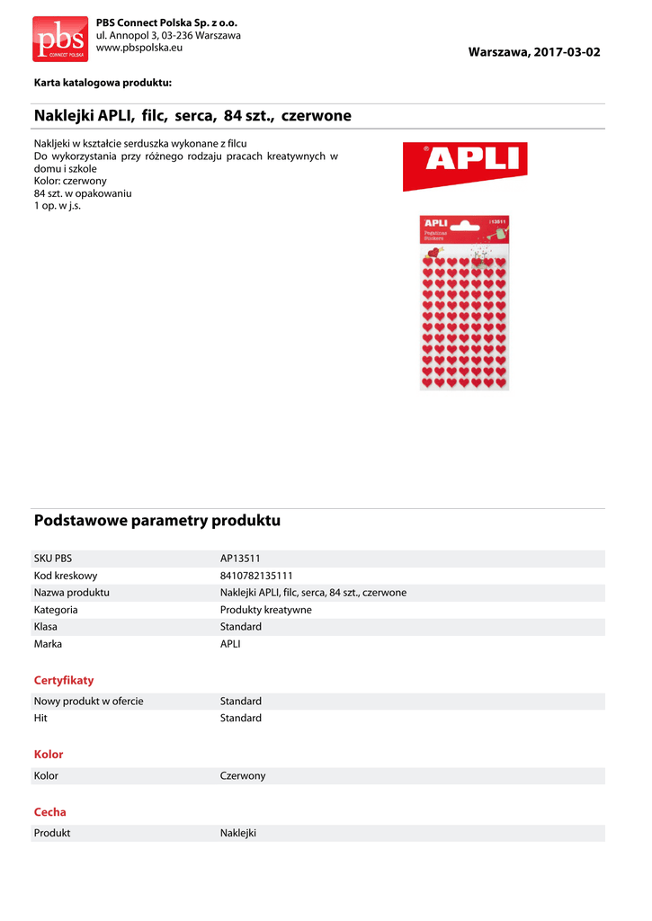 PBS Connect Polska Sp. z o.o. ul. Annopol 3, 03-236 Warszawa www.pbspolska.eu Karta katalogowa produktu: Naklejki APLI, filc, serca, 84 szt., czerwone Nakljeki w kształcie serduszka wykonane z filcu Do wykorzystania przy różnego rodzaju pracach kreatywnych w domu i szkole Kolor: czerwony 84 szt. w opakowaniu 1 op. w j.s. Podstawowe parametry produktu SKU PBS AP13511 Kod kreskowy 8410782135111 Nazwa produktu Naklejki APLI, filc, serca, 84 szt., czerwone Kategoria Produkty kreatywne Klasa Standard Marka APLI Certyfikaty Nowy produkt w ofercie Standard Hit Standard Kolor Kolor Czerwony Cecha Produkt Naklejki Warszawa, 2017-03-02 PBS Connect Polska Sp. z o.o. ul. Annopol 3, 03-236 Warszawa www.pbspolska.eu Karta katalogowa produktu cd. Naklejki APLI, filc, serca, 84 szt., czerwone Podstawowe parametry produktu Typ Serca Rodzaj Do prac kreatywnych Kształt Serca W ofercie od 2015-03 Jednostki logistyczne Opakowanie 1 5 op Warszawa, 2017-03-02