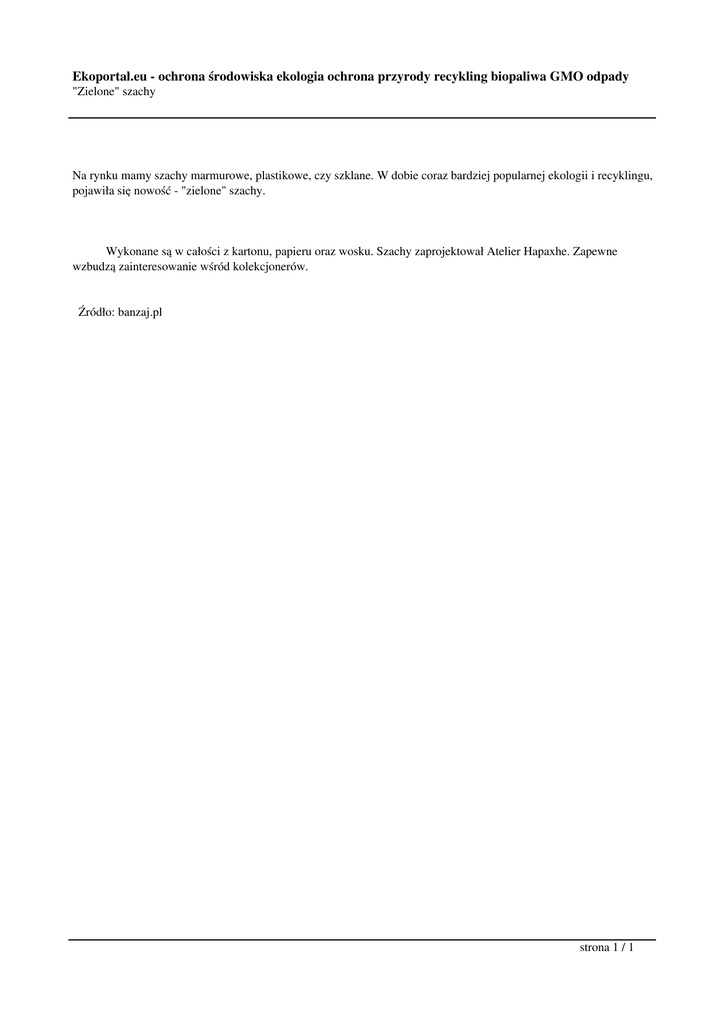 Ekoportal.eu - ochrona środowiska ekologia ochrona przyrody recykling biopaliwa GMO odpady "Zielone" szachy Na rynku mamy szachy marmurowe, plastikowe, czy szklane. W dobie coraz bardziej popularnej ekologii i recyklingu, pojawiła się nowość - "zielone" szachy. Wykonane są w całości z kartonu, papieru oraz wosku. Szachy zaprojektował Atelier Hapaxhe. Zapewne wzbudzą zainteresowanie wśród kolekcjonerów. Źródło: banzaj.pl strona 1 / 1