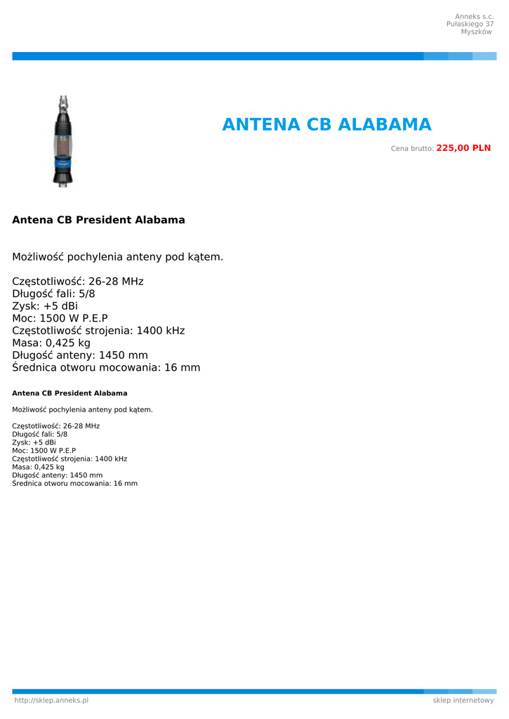 Anneks s.c. Pułaskiego 37 Myszków ANTENA CB ALABAMA Cena brutto: 225,00 PLN Antena CB President Alabama Możliwość pochylenia anteny pod kątem. Częstotliwość: 26-28 MHz Długość fali: 5/8 Zysk: +5 dBi Moc: 1500 W P.E.P Częstotliwość strojenia: 1400 kHz Masa: 0,425 kg Długość anteny: 1450 mm Średnica otworu mocowania: 16 mm Antena CB President Alabama Możliwość pochylenia anteny pod kątem. Częstotliwość: 26-28 MHz Długość fali: 5/8 Zysk: +5 dBi Moc: 1500 W P.E.P Częstotliwość strojenia: 1400 kHz Masa: 0,425 kg Długość anteny: 1450 mm Średnica otworu mocowania: 16 mm http://sklep.anneks.pl sklep internetowy