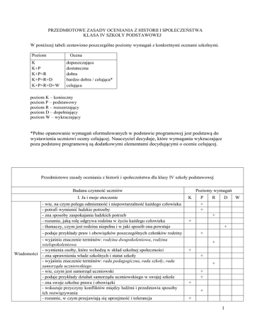 PRZEDMIOTOWE ZASADY OCENIANIA Z HISTORII I SPOŁECZEŃSTWA KLASA IV SZKOŁY PODSTAWOWEJ W poniższej tabeli zestawiono poszczególne poziomy wymagań z konkretnymi ocenami szkolnymi. Poziom K K+P K+P+R K+P+R+D K+P+R+D+W Ocena dopuszczająca dostateczna dobra bardzo dobra / celująca* celująca poziom K – konieczny poziom P – podstawowy poziom R – rozszerzający poziom D – dopełniający poziom W – wykraczający *Pełne opanowanie wymagań sformułowanych w podstawie programowej jest podstawą do wystawienia uczniowi oceny celującej. Nauczyciel decyduje, które wymagania wykraczające poza podstawę programową są dodatkowymi elementami decydującymi o ocenie celującej. Przedmiotowe zasady oceniania z historii i społeczeństwa dla klasy IV szkoły podstawowej Badana czynność uczniów I. Ja i moje otoczenie - wie, na czym polega odmienność i niepowtarzalność każdego człowieka - potrafi wymienić ludzkie potrzeby - zna sposoby zaspokajania ludzkich potrzeb - rozumie, jaką rolę odgrywa rodzina w życiu każdego człowieka - tłumaczy, czym jest rodzina niepełna i w jaki sposób ona powstaje - podaje przykłady praw i obowiązków poszczególnych członków rodziny - wyjaśnia znaczenie terminów: rodzina dwupokoleniowa, rodzina wielopokoleniowa - wymienia osoby, które wchodzą w skład szkolnej społeczności Wiadomości - zna uprawnienia władz szkolnych i statut szkoły - wyjaśnia znaczenie terminów: rada pedagogiczna, rada szkoły, rada samorządu uczniowskiego - wie, czym jest samorząd uczniowski - podaje przykłady działań samorządu uczniowskiego w swojej szkole - zna swoje szkolne prawa i obowiązki - wskazuje przyczyny konfliktów między ludźmi i przedstawia sposoby ich rozwiązywania - rozumie, w czym przejawiają się uprzejmość i tolerancja Poziomy wymagań K P + + R D + + + + + + + + + + + + + 1 W - wymienia korzyści, jakie można osiągnąć przez uprzejmość i tolerancję - wie, na czym polega sprawiedliwe postępowanie - tłumaczy znaczenie terminów: ojczyzna, mała ojczyzna, naród, patriotyzm, patriotyzm lokalny, herb - omawia sposoby okazywania patriotyzmu w czasie wojny i w okresie pokoju - zna sposoby zdobywania wiedzy o historii małej ojczyzny - wskazuje największe atuty swojej małej ojczyzny - tłumaczy pochodzenie nazwy Polska - wyjaśnia, co świadczy o tym, że Polacy należą do jednego narodu - rozumie znaczenie terminów: Rzeczpospolita Polska, mniejszość narodowa, mniejszość etniczna, Polonia - podaje przykłady dzieł sztuki i architektury, które należą do polskiego dziedzictwa narodowego - objaśnia, dlaczego wybrane dzieła sztuki i architektury są ważną częścią naszej kultury narodowej - zna daty najważniejszych polskich świąt państwowych - wymienia wydarzenia, na pamiątkę których ustanowiono święta państwowe - zna polskie symbole narodowe i najważniejsze miejsca pamięci narodowej - recytuje tekst „Mazurka Dąbrowskiego” - omawia okoliczności powstania tekstu „Mazurka Dąbrowskiego” - wie, jaka jest symbolika barw polskiej flagi narodowej - rozumie, dlaczego powinno się okazywać szacunek symbolom narodowym - wyjaśnia, kim był Józef Wybicki - wymienia regiony Polski - podaje nazwy mniejszości narodowych i etnicznych żyjących w Polsce - wylicza prawa przysługujące mniejszościom narodowym i etnicznym w Polsce - wie, gdzie znajdują się główne skupiska Polaków na świecie - wymienia mniejszości narodowe, które żyły w przedwojennej Polsce - potrafi określić sposoby zaspokajania różnych potrzeb człowieka - wyjaśnia znaczenie praw i obowiązków poszczególnych członków rodziny - porównuje prawa i obowiązki poszczególnych członków rodziny - omawia zalety i wady rodziny współczesnej oraz rodziny wielopokoleniowej - charakteryzuje społeczność szkolną z uwzględnieniem swoich praw Umiejętności i obowiązków - określa szkołę jako wspólnotę uczniów, nauczycieli i rodziców - ocenia, które prawa i obowiązki uczniów są najważniejsze - potrafi opisać sytuację konfliktową i znajduje dla niej rozwiązanie - omawia różnice między szkołą dawną a współczesną - proponuje sposoby rozwiązania problemów własnej miejscowości - odszukuje informacje o rozmaitych formach upamiętniania postaci i wydarzeń związanych z historią swojej małej ojczyzny - wskazuje na planie swojej miejscowości siedzibę władz lokalnych + + + + + + + + + + + + + + + + + + + + + + + + + + + + + + + + + + + + 2 - zbiera informacje o władzy lokalnej i jej zadaniach - prezentuje informacje związane z ważnymi postaciami i wydarzeniami z dziejów regionu - opisuje wygląd herbów wybranych miejscowości - analizuje tekst hymnu Polski i wyjaśnia znaczenie wybranych zwrotów - odnajduje na mapie główne regiony Polski - opisuje główne regiony Polski - analizuje, w jaki sposób mniejszości narodowe i etniczne mogą zachować swoją odrębność - przedstawia na wybranych przykładach mniejszości narodowe zamieszkujące współczesną Polskę - opisuje kulturę i tradycje wybranej mniejszości narodowej bądź etnicznej żyjącej w Polsce - wskazuje główne skupiska Polonii na mapie świata - porównuje strukturę narodowościową II Rzeczypospolitej i współczesnej Polski - omawia na przykładach pochodzenie nazwisk i przydomków II. Z historią na ty - wie, czym zajmuje się historia jako nauka - wymienia główne zadania historii - wyjaśnia, kim jest historyk - zna sposoby badania wydarzeń z przeszłości przez historyków - wymienia przykłady postaci historycznych oraz bohaterów baśniowych i legendarnych - zna podstawy myślenia przyczynowo-skutkowego dotyczącego wydarzeń historycznych - wskazuje przebieg, przyczyny i skutki wybranych wydarzeń historycznych - podaje przykłady efektów pracy historyków - wymienia filmy i książki o tematyce historycznej - objaśnia znaczenie powiedzenia: Historia jest nauczycielką życia - wie, czym są źródła h