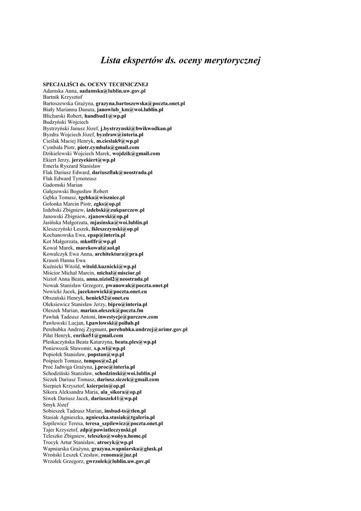 Lista ekspertów ds. oceny merytorycznej SPECJALIŚCI ds. OCENY TECHNICZNEJ Adamska Anna, [email protected] Bartnik Krzysztof Bartoszewska GraŜyna, [email protected] Biały Marianna Danuta, [email protected] Blicharski Robert, [email protected] Budzyński Wojciech Bystrzyński Janusz Józef, [email protected] Byzdra Wojciech Józef, [email protected] Cieślak Maciej Henryk, [email protected] Cymbała Piotr, [email protected] Dzikielewski Wojciech Marek, [email protected] Ekiert Jerzy, [email protected] Emerla Ryszard Stanisław Flak Dariusz Edward, [email protected] Flak Edward Tymoteusz Gadomski Marian Gałęzowski Bogusław Robert Gębka Tomasz, [email protected] Golonka Marcin Piotr, [email protected] Izdebski Zbigniew, [email protected] Janowski Zbigniew, [email protected] Jasińska Małgorzata, [email protected] Kleszczyński Leszek, [email protected] Kochanowska Ewa, [email protected] Kot Małgorzata, [email protected] Kowal Marek, [email protected] Kowalczyk Ewa Anna, [email protected] Krasoń Hanna Ewa Kuźnicki Witold, [email protected] Miścior Michał Marcin, [email protected] Nizioł Anna Beata, [email protected] Nowak Stanisław Grzegorz, [email protected] Nowicki Jacek, [email protected] Obszański Henryk, [email protected] Oleksiewicz Stanisław Jerzy, [email protected] Oleszek Marian, [email protected] Pawluk Tadeusz Antoni, [email protected] Pawłowski Lucjan, [email protected] Perehubka Andrzej Zygmunt, [email protected] Piłat Henryk, [email protected] Pleskaczyńska Beata Katarzyna, [email protected] Poniewozik Sławomir, [email protected] Popiołek Stanisław, [email protected] Pośpiech Tomasz, [email protected] Proć Jadwiga GraŜyna, [email protected] Schodziński Stanisław, [email protected] Siczek Dariusz Tomasz, [email protected] Sierpień Krzysztof, [email protected] Sikora Aleksandra Maria, [email protected] Siwek Dariusz Jacek, [email protected] Smyk Józef Sobieszek Tadeusz Marian, [email protected] Stasiak Agnieszka, [email protected] Szpilewicz Teresa, [email protected] Tajer Krzysztof, [email protected] Teleszko Zbigniew, [email protected] Trocyk Artur Stanisław, [email protected] Wapniarska GraŜyna, [email protected] Wroński Leszek Czesław, [email protected] Wrzołek Grzegorz, [email protected] Zezulińska Jolanta Alicja, [email protected] Ziętek Beata Maria, [email protected] SPECJALIŚCI ds. OCENY FINANSOWO – EKONOMICZNEJ Baran Urszula, [email protected] Buczyński Maciej, [email protected] Cap Andrzej, [email protected] Chmielewska Jolanta Stanisława, [email protected] Ciupa Zofia, [email protected] Czajka Zenon Tadeusz Dawidziuk Jolanta, [email protected] Głaz Adam, [email protected] Grzegorczyk BoŜena Katarzyna, [email protected] Guz Lucyna, [email protected] Henzel ElŜbieta Maria, [email protected] Janik Katarzyna Agnieszka, [email protected] Jegorow Dorota, [email protected] Juchnikowska Marta, [email protected] Kaczmarczyk Jerzy, [email protected] Kaczorowski Tadeusz Jacek, [email protected] Kraska BoŜena, [email protected] Krawiecka Małgorzata ElŜbieta, [email protected] Kusy Anna, [email protected] Kwiek Ewa Maria, [email protected] Łątka Anna Maria, [email protected] Łuka Czesława, [email protected] Makówka Anna Jolanta, [email protected] Makuch Renata ElŜbieta, [email protected] Michalik Danuta, [email protected] Miziuk Renata Beata, [email protected] Motelski Wojciech, [email protected] Pawłowski Grzegorz, [email protected] Płoszaj Anna, [email protected] Skainowska Agnieszka Małgorzata, [email protected] Socha Grzegorz Robert, [email protected] Stachura Marek, [email protected] Starek Krzysztof, [email protected] Szczepański Artur, [email protected] Szczygielski Grzegorz Adam, [email protected] Szot-Gabryś Teresa, [email protected] Szubert Jarosław Tadeusz, [email protected] Tarkowski Karol Stefan, [email protected] Trzcińska Jadwiga Teresa, [email protected] Zając Małgorzata, [email protected] Zbiciak Agnieszka Małgorzata, [email protected] SPECJALIŚCI ds. OCENY MERYTORYCZNEJ I. Infrastruktura techniczna, tereny inwestycyjne Bartnik Krzysztof Bielecki Jerzy Feliks, [email protected] Blicharski Robert, [email protected] Bystrzyński Janusz Józef, [email protected] Byzdra Wojciech Józef, [email protected] Cieślak Maciej Henryk, [email protected] Dul Jacek, [email protected] Flak Dariusz Edward, [email protected] Flak Edward Tymoteusz Gadomski Marian Gałęzowski Bogusław Robert Gębka Tomasz, [email protected] Izdebski Zbigniew, [email protected] IŜyńska Monika, [email protected] Karczmarczyk Tadeusz, [email protected] Kostrubiec Ryszard, [email protected] Kot Małgorzata, [email protected] Kowalczyk Ewa Anna, [email protected] Niczyporuk Jacek Jan, [email protected] Nowak Stanisław Grzegorz, [email protected] Nowicki Jacek, [email protected] Obszański Henryk, [email protected] Oleszek Marian, [email protected] Piłat Henryk, [email protected] Raczyńska Irena Maria, [email protected] Sagan Mariusz Adam, [email protected] Sikora Aleksandra Maria, [email protected] Stasiak Agnieszka, [email protected] Szpilewicz Teresa, [email protected] Wapniarska GraŜyna, [email protected] Wroński Leszek Czesław, [email protected] Zubrzycki Krzysztof, [email protected] II. Rewitalizacja miast i zdegradowanych obszarów zurbanizowanych Berłowski Marcin Bogdan, [email protected] Byzdra Wojciech Józef, [email protected] Cieślak Maciej Henryk, [email protected] Fornal ElŜbieta, [email protected] Gałęzowski Bogusław Robert Gębka Tomasz, [email protected] Jasiak Anna Małgorzata, [email protected] Kociuba Dagmara Agnieszka, [email protected] Kot Małgorzata, [email protected] Maluha Jarosław Bartłomiej, [email protected] Matuszak ElŜbieta, [email protected] Podkościelny ElŜbieta Ewa, [email protected] Sagan Mariusz Adam, [email protected] Stasiak Agnieszka, [email protected] Szokaluk Anna, [email protected] Wroński Leszek Czesław, [email protected] Zezulińska Jolanta Alicja, [email protected] III. Społ