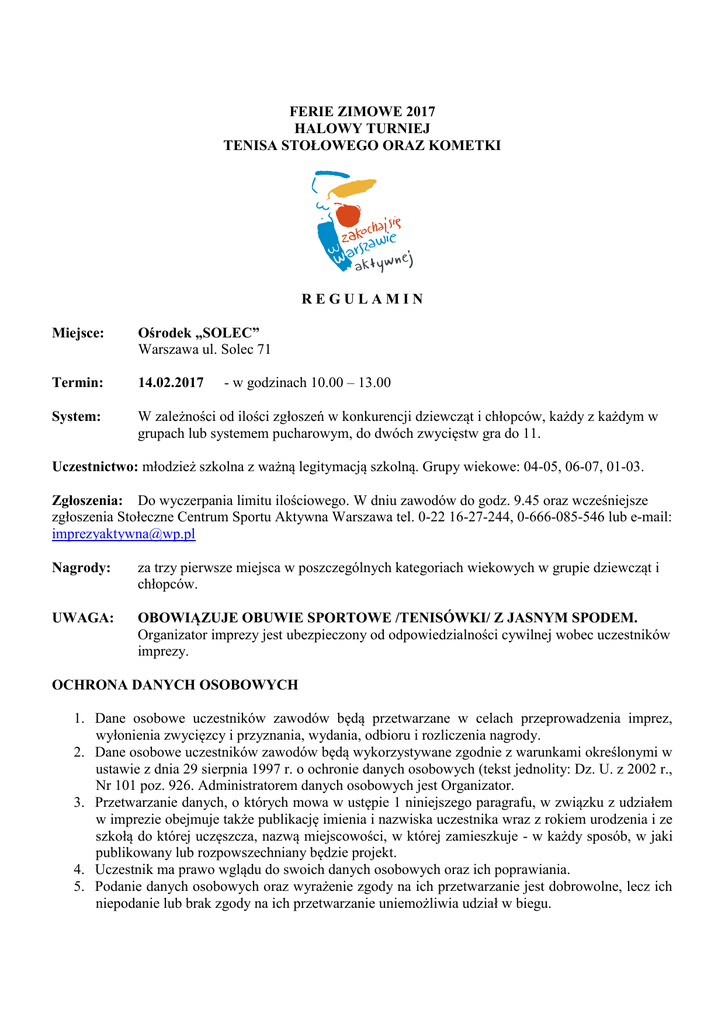 FERIE ZIMOWE 2017 HALOWY TURNIEJ TENISA STOŁOWEGO ORAZ KOMETKI REGULAMIN Miejsce: Ośrodek „SOLEC” Warszawa ul. Solec 71 Termin: 14.02.2017 System: W zależności od ilości zgłoszeń w konkurencji dziewcząt i chłopców, każdy z każdym w grupach lub systemem pucharowym, do dwóch zwycięstw gra do 11. - w godzinach 10.00 – 13.00 Uczestnictwo: młodzież szkolna z ważną legitymacją szkolną. Grupy wiekowe: 04-05, 06-07, 01-03. Zgłoszenia: Do wyczerpania limitu ilościowego. W dniu zawodów do godz. 9.45 oraz wcześniejsze zgłoszenia Stołeczne Centrum Sportu Aktywna Warszawa tel. 0-22 16-27-244, 0-666-085-546 lub e-mail: [email protected] Nagrody: za trzy pierwsze miejsca w poszczególnych kategoriach wiekowych w grupie dziewcząt i chłopców. UWAGA: OBOWIĄZUJE OBUWIE SPORTOWE /TENISÓWKI/ Z JASNYM SPODEM. Organizator imprezy jest ubezpieczony od odpowiedzialności cywilnej wobec uczestników imprezy. OCHRONA DANYCH OSOBOWYCH 1. Dane osobowe uczestników zawodów będą przetwarzane w celach przeprowadzenia imprez, wyłonienia zwycięzcy i przyznania, wydania, odbioru i rozliczenia nagrody. 2. Dane osobowe uczestników zawodów będą wykorzystywane zgodnie z warunkami określonymi w ustawie z dnia 29 sierpnia 1997 r. o ochronie danych osobowych (tekst jednolity: Dz. U. z 2002 r., Nr 101 poz. 926. Administratorem danych osobowych jest Organizator. 3. Przetwarzanie danych, o których mowa w ustępie 1 niniejszego paragrafu, w związku z udziałem w imprezie obejmuje także publikację imienia i nazwiska uczestnika wraz z rokiem urodzenia i ze szkołą do której uczęszcza, nazwą miejscowości, w której zamieszkuje - w każdy sposób, w jaki publikowany lub rozpowszechniany będzie projekt. 4. Uczestnik ma prawo wglądu do swoich danych osobowych oraz ich poprawiania. 5. Podanie danych osobowych oraz wyrażenie zgody na ich przetwarzanie jest dobrowolne, lecz ich niepodanie lub brak zgody na ich przetwarzanie uniemożliwia udział w biegu. Wykorzystanie wizerunku: Udział w imprezie jest jednoznaczny ze zgodą rodzica /prawnego opiekuna/ na wykorzystanie wizerunku podopiecznej/podopiecznego utrwalonego na zdjęciach, filmach w materiałach o charakterze promocyjnym, informacyjnym oraz na stronach internetowych:www.aktywnawarszawa.waw.pl, na portalu Facebook - profil AKTYWNA WARSZAWA.