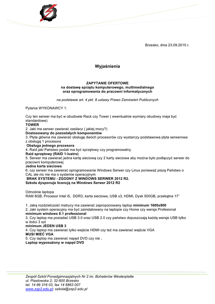 ! ! ! ! Brzesko,!dnia!23.09.2015!r.! ! ! ! ' Wyjaśnienia!! ! ! ! ZAPYTANIE!OFERTOWE! na!dostawę!sprzętu!komputerowego,!multimedialnego!! oraz!oprogramowania!do!pracowni!informatycznych! ! na'podstawie'art.'4'pkt.'8'ustawy'Prawo'Zamówień'Publicznych' ! Pytania!WYKONAWCY!1:! ! Czy!ten!serwer!ma!być!w!obudowie!Rack!czy!Tower!(!ewentualnie!wymiary!obudowy!maja!być! standardowe)!! TOWER! 2.!Jaki!ma!serwer!zawierać!zasilacz!(!jakiej!mocy?)!!! Dostosowany!do!pozostałych!komponentów! 3.!Płyta!główna!ma!zawierać!obsługę!dwóch!procesorów!czy!wystarczy!podstawowa!płyta!serwerowa! z!obsługą!1!procesora! !Obsługa!jednego!procesora! 4.!Raid!jaki!Państwo!podali!ma!być!sprzętowy!czy!programowalny! Raid!sprzętowy!(RAID!1Mlustro)! 5.!Serwer!ma!zawierać!jedna!kartę!sieciową!czy!2!karty!sieciowa!aby!można!było!podłączyć!serwer!do! pracowni!komputerowej!! Jedna!karta!sieciowa! 6.!czy!serwer!ma!zawierać!oprogramowanie!Windows!Serwer!czy!Linux!ponieważ!piszą!Państwo!o! CAL!ale!nic!nie!ma!o!systemie!operacyjnym! !BRAK!SYSTEMU!M!ZGODNY!Z!WINDOWS!SERWER!2012!R2.! Szkoła!dysponuje!licencją!na!Windows!Serwer!2012!R2! !! Odnośnie!laptopa! RAM!8GB,!Procesor!Intel!i5,!!DDR3,!karta!sieciowa,!USB!x3,!HDMI,!Dysk!500GB,!przekątna!17”! !! 1.!Jaką!rozdzielczość!matrycy!ma!zawierać!zaproponowany!laptop!minimum!1600x900! 2.!Jaki!system!operacyjny!ma!być!zainstalowany!na!laptopie!czy!Home!czy!wersja!Profesional! minimum!windows!8.1!professional! 3.!Czy!laptop!ma!posiadać!USB!3.0!oraz!USB!2.0!czy!państwo!dopuszczają!każdą!wersje!USB!tylko! w!ilości!3!szt!! minimum!JEDEN!USB!3! 4.!Czy!laptop!ma!zawierać!tylko!wejście!HDMI!czy!też!ma!zawierać!wejście!VGA!! MUSI!MIEĆ!VGA! 5.!Czy!laptop!ma!zawierać!napęd!DVD!czy!nie!.! Laptop!wyposażony!w!napęd!DVD! ! ! ! Zespół'Szkół'Ponadgimnazjalnych'Nr'2'im.'Bohaterów'Westerplatte' ul.'Piastowska'2A'32C800'Brzesko' tel.'14'66'316'03,'fax'14'6863'007' www.zsp2.edu.plA'[email protected] Odnośnie!komputerów!stacjonarnych! 1.! Czy!gwarancja!na!zaoferowane!komputery!ma!być!onhsite!i!realizowana!do!48!godzin!na! miejscu!u!klienta!czy!standardowa:!Gwarancja!standardowa! 2.! !Czy!producent!komputera!musi!posiadać!certyfikat!zarządzania!jakością!ISO!9001:2008,!ISO! 14001:2004!na!proces!projektowania,!produkcji,!sprzedaży!i!serwisu!sprzętu!komputerowego:! NIE!musi!posiadać! 3.! Czy!oferowany!sprzęt!ma!być!przetestowany!i!dołączony!certyfikatu!CE!na!złożony!! w!ofercie!model!komputera:!!Nie!! 4.! Czy!mają!być!oryginalne!plomby!producenta,!noszą!jego!znak!towarowy:!Nie! 5.! Czy!w!przypadku!gdy!serwis!sprzętu!komputerowego!będzie!świadczony!przez!inną!!firmę!niż! producenta!sprzętu!wymaga!się!aby!dołączyć!do!oferty!certyfikat!!zarządzania!jakością!ISO! 9001:2008,!ISO!14001:2004!dla!firmy!serwisującej!sprzęt!na!proces!serwisu!sprzętu! komputerowego!i!oświadczenie!producenta!o!autoryzacji!firmy!serwisującej!sprzęt:!NIE! !! Pytania!Wykonawcy!2:! ! 1.! W!punkcie!1.2!ma!być!zasilacz!modułowy!czy!modularny?! Zasilacz!modularny!(odłączane!linie)! 2.! Czy!potrzebna!jest!aż!tak!duża!moc!zasilacza?! TAK! 3.! Płyta!główna!ma!być!na!pewno!z!kontrolerem!SATAII?!(będzie!to!„wąskie!gardło”!dla!całego! zestawu)! SATA!II!jest!wymaganiem!minimalnym.! 4.! Dysk!twardy!podany!w!specyfikacji!to!dysk!talerzowy!nie!lepiej!byłoby!dołożyć!dysk!SSD!co! bardzo!przyspiesza!pracę!komputera!w!zamian!np!za!troszkę!słabszy!procesor?! SSD!może!być!ale!o!pojemności!minimum!500GB!–!kilka!systemów!na!jednym!dysku.! 5.! System!operacyjny!nie!lepiej!zamienić!na!windows!8.1!professional!64!bit?!(niższa!cena,! dłuższy!okres!wsparcia!aktualizacji!zabezpieczeń)! System!co!najmniej!Windows!7PRO,!!może!być!z!8.1!z!interfejsem!7!(menu!start)! 6.! W!specyfikacji!laptopów!też!zapisany!jest!zwykły!dysk!talerzowy.!Nie!lepiej!zainwestować!w! dysk!SSD?!(Znaczące!przyspieszenie!działania!laptopa)! W!specyfikacji!zawarto!wymagania!minimalne.! 7.! Serwer!ma!być!bez!systemu!operacyjnego?!! J.W.! 8.! Mam$jeszcze$jedno$pytanie.$Dotyczy$ono$karty$graficznej.! Specyfikacja$podana$w$ofercie$dotyczy$karty$GTX$550$Ti.$Jest$to$dość$stara$karta.$ W$zamian$można$by$zastosować$np.$GTX$750$lecz$ta$karta$ma$mniejszą$szerokość!interfejsu! pamięci!niż!wymagana!w!ofercie,!ale!ogóle!karta!jest!wydajniejsza.! Pytanie!więc!brzmi!czy!karta!ma!mieć!dokładnie!takie!parametry!jak!podane!w!specyfikacji?! ! Zamawiający!dopuszcza!kartę!graficzną!z!szerokością!interfejsu!pamięci!! minimum:!128!bit! ! 2|Strona