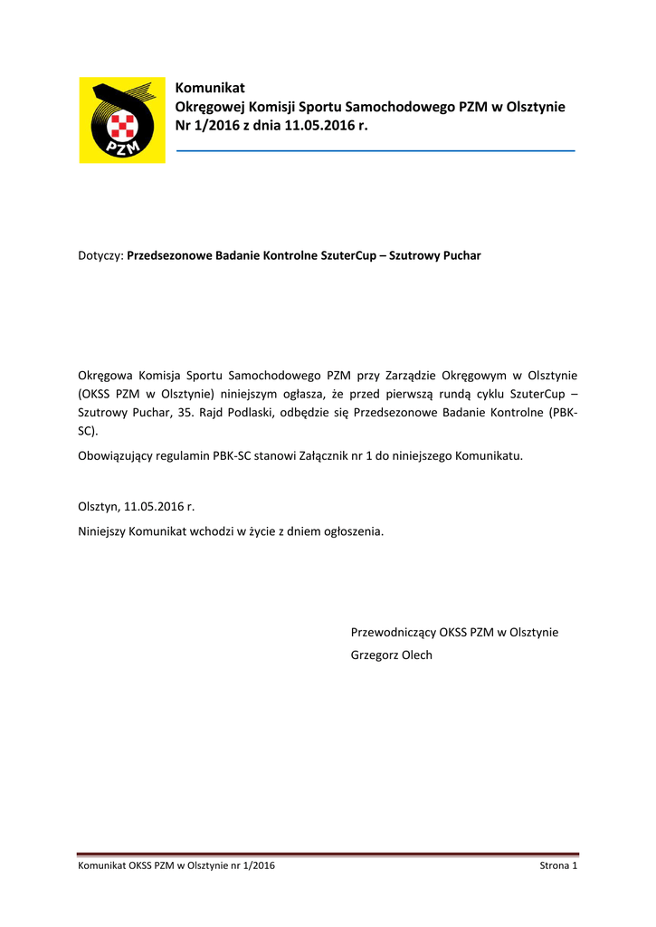 Komunikat Okręgowej Komisji Sportu Samochodowego PZM w Olsztynie Nr 1/2016 z dnia 11.05.2016 r. Dotyczy: Przedsezonowe Badanie Kontrolne SzuterCup – Szutrowy Puchar Okręgowa Komisja Sportu Samochodowego PZM przy Zarządzie Okręgowym w Olsztynie (OKSS PZM w Olsztynie) niniejszym ogłasza, że przed pierwszą rundą cyklu SzuterCup – Szutrowy Puchar, 35. Rajd Podlaski, odbędzie się Przedsezonowe Badanie Kontrolne (PBKSC). Obowiązujący regulamin PBK-SC stanowi Załącznik nr 1 do niniejszego Komunikatu. Olsztyn, 11.05.2016 r. Niniejszy Komunikat wchodzi w życie z dniem ogłoszenia. Przewodniczący OKSS PZM w Olsztynie Grzegorz Olech Komunikat OKSS PZM w Olsztynie nr 1/2016 Strona 1 Załącznik nr 1 Regulamin Przedsezonowego Badania Kontrolnego SzuterCup (PBK-SC) 1. Wprowadzenie. W sezonie 2016 będzie możliwość przeprowadzenia Przedsezonowego Badania Kontrolnego, zwanego dalej PBK-SC dla samochodów uczestniczących w SzuterCup – Szutrowy Puchar. Pozytywny wynik PBK po spełnieniu wymagań niniejszego, pozwoli na uczestnictwo w rundach SzuterCup – Szutrowy Puchar bez konieczności udziału samochodu w Badaniu Kontrolnym przed rajdem (BK 1). 2. Dopuszczone samochody. 2.1. Samochód przedstawiony do PBK musi być kompletny oraz musi być zarejestrowany na terytorium RP i posiadać KSS wydaną przez PZM. 2.2. Samochód i jego wyposażenie muszą być zgodne z regulaminem SzuterCup – Szutrowy Puchar oraz pozostałymi regulaminami. 2.3. Samochód należy przedstawić w wyznaczonym miejscu i czasie do oględzin Sędziów Technicznych. 2.4. Samochód do badania może przedstawić jego właściciel lub osoba pisemnie przez niego upoważniona. 3. Ważność PBK. 3.1. Pozytywny wynik PBK-SC powoduje uzyskanie wizy PBK-SC 2016. 3.2. Domyślnie wiza PBK-SC przyznawana jest na wszystkie rundy SzuterCup – Szutrowy Puchar w sezonie 2016. 3.3. Każda wprowadzona zmiana w wyposażeniu lub danych samochodu, skutkująca koniecznością uaktualnienia danych w PBK-SC musi zostać zgłoszona pisemnie podczas OA na najbliższym rajdzie, do którego został zgłoszony samochód. 3.4. W przypadku nieukończenia rundy SzuterCup (wycofanie się z imprezy z powodu rezygnacji, awarii, wypadku), należy w trakcie jej trwania przedstawić samochód do oględzin Delegatowi Technicznemu lub wskazanemu przez niego Sędziemu Technicznemu. 3.5. Wiza PBK-SC może zostać unieważniona przez Delegata Technicznego, w uzgodnieniu z OKSS PZM w Olsztynie w następujących sytuacjach: 3.3.1 Utrata homologacji (wygaśnięcie terminu ważności, unieważnienie homologacji przez FIA) lub uszkodzenie jednego z elementów wyposażenia bezpieczeństwa (klatka, fotel, mocowanie fotela, pasy, itp.), 3.3.2 Nie poinformowanie Delegata Technicznego w trakcie sezonu, o zmianie wyposażenia, które zostało przedstawione i zadeklarowane na PBK-SC, 3.3.3 Brak przedstawienia Karty Wyposażenia Osobistego na OA, 3.3.4 Uszkodzenie oznakowania informującego o pozytywnym wyniku PBK-SC, 3.3.5 Nie przedstawienie samochodu do oględzin Delegatowi Technicznemu na rundzie, która z jakiejkolwiek przyczyny nie została ukończona. 3.3.6 Decyzja Delegata Technicznego spowodowana innymi czynnikami. Komunikat OKSS PZM w Olsztynie 1/2016 Strona 2 Załącznik nr 1 4. Procedura PBK. PBK odbędzie się bezpośrednio przed 35. Rajdem Podlaskim*. Harmonogram PBK-SC będzie opublikowany na stronie internetowej rajdu. Udział w PBK-SC nie wymaga dodatkowego zgłoszenia. 5. Przebieg zawodów 5.1. Zawodnik zgłoszony do rajdu samochodem posiadającym Wizę PBK-SC podczas OA podpisuje deklarację, że samochód, którym zamierza wziąć udział w rajdzie jest w pełni zgodny z tym, który był przedstawiony podczas PBK-SC oraz przedstawia stosowne dokumenty w Biurze Rajdu: ● wizę PBK-SC ● kartę wyposażenia bezpieczeństwa osobistego. 5.2. Skrócona kontrola wyposażenia samochodu oraz bezpieczeństwa osobistego załogi odbędzie się w dniu startu do rajdu, w miejscu i czasie podanym w regulaminie uzupełniającym rajdu. Niezgodność samochodu podczas ww. kontroli z regulaminem SzuterCup – Szutrowy Puchar lub z Kartą PBK-SC, na wniosek Sędziego Technicznego skutkuje natychmiastowym niedopuszczeniem do rajdu przez ZSS. * W sezonie 2016 istnieje możliwość przeprowadzenia indywidualnego PBK w innym terminie i miejscu, na warunkach uzgodnionych z Delegatem Technicznym i OKSS PZM w Olsztynie. Komunikat OKSS PZM w Olsztynie 1/2016 Strona 3