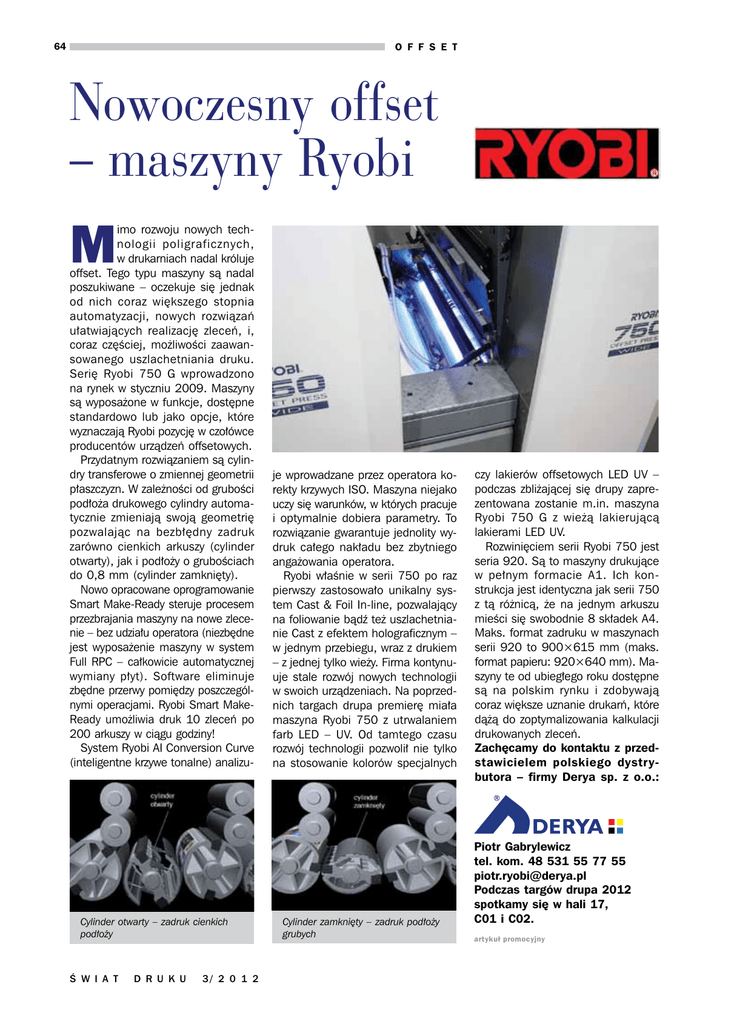 O F F S E T 64 Nowoczesny offset – maszyny Ryobi M imo rozwoju nowych technologii poligraficznych, w drukarniach nadal króluje offset. Tego typu maszyny są nadal poszukiwane – oczekuje się jednak od nich coraz większego stopnia automatyzacji, nowych rozwiązań ułatwiających realizację zleceń, i, coraz częściej, możliwości zaawansowanego uszlachetniania druku. Serię Ryobi 750 G wprowadzono na rynek w styczniu 2009. Maszyny są wyposażone w funkcje, dostępne standardowo lub jako opcje, które wyznaczają Ryobi pozycję w czołówce producentów urządzeń offsetowych. Przydatnym rozwiązaniem są cylindry transferowe o zmiennej geometrii płaszczyzn. W zależności od grubości podłoża drukowego cylindry automatycznie zmieniają swoją geometrię pozwalając na bezbłędny zadruk zarówno cienkich arkuszy (cylinder otwarty), jak i podłoży o grubościach do 0,8 mm (cylinder zamknięty). Nowo opracowane oprogramowanie Smart Make-Ready steruje procesem przezbrajania maszyny na nowe zlecenie – bez udziału operatora (niezbędne jest wyposażenie maszyny w system Full RPC – całkowicie automatycznej wymiany płyt). Software eliminuje zbędne przerwy pomiędzy poszczególnymi operacjami. Ryobi Smart MakeReady umożliwia druk 10 zleceń po 200 arkuszy w ciągu godziny! System Ryobi AI Conversion Curve (inteligentne krzywe tonalne) analizu- Cylinder otwarty – zadruk cienkich podłoży ś W I A T D R U K U 3/ 2 0 1 2 je wprowadzane przez operatora korekty krzywych ISO. Maszyna niejako uczy się warunków, w których pracuje i optymalnie dobiera parametry. To rozwiązanie gwarantuje jednolity wydruk całego nakładu bez zbytniego angażowania operatora. Ryobi właśnie w serii 750 po raz pierwszy zastosowało unikalny system Cast & Foil In-line, pozwalający na foliowanie bądź też uszlachetnianie Cast z efektem holograficznym – w jednym przebiegu, wraz z drukiem – z jednej tylko wieży. Firma kontynuuje stale rozwój nowych technologii w swoich urządzeniach. Na poprzednich targach drupa premierę miała maszyna Ryobi 750 z utrwalaniem farb LED – UV. Od tamtego czasu rozwój technologii pozwolił nie tylko na stosowanie kolorów specjalnych Cylinder zamknięty – zadruk podłoży grubych czy lakierów offsetowych LED UV – podczas zbliżającej się drupy zaprezentowana zostanie m.in. maszyna Ryobi 750 G z wieżą lakierującą lakierami LED UV. Rozwinięciem serii Ryobi 750 jest seria 920. Są to maszyny drukujące w pełnym formacie A1. Ich konstrukcja jest identyczna jak serii 750 z tą różnicą, że na jednym arkuszu mieści się swobodnie 8 składek A4. Maks. format zadruku w maszynach serii 920 to 900×615 mm (maks. format papieru: 920×640 mm). Maszyny te od ubiegłego roku dostępne są na polskim rynku i zdobywają coraz większe uznanie drukarń, które dążą do zoptymalizowania kalkulacji drukowanych zleceń. Zachęcamy do kontaktu z przedstawicielem polskiego dystrybutora – firmy Derya sp. z o.o.: Piotr Gabrylewicz tel. kom. 48 531 55 77 55 [email protected] Podczas targów drupa 2012 spotkamy się w hali 17, C01 i C02. artykuł promocyjny