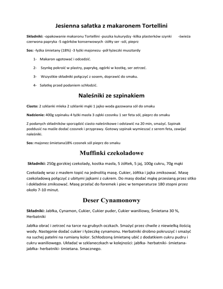 Jesienna sałatka z makaronem Tortellini Składniki: -opakowanie makaronu Tortellini -puszka kukurydzy -kilka plasterków szynki czerwona papryka -5 ogórków konserwowych -żółty ser -sól, pieprz -świeża Sos: -łyżka śmietany (18%) -3 łyżki majonezu -pół łyżeczki musztardy 1- Makaron ugotować i odcedzić. 2- Szynkę pokroić w plastry, paprykę, ogórki w kostkę, ser zetrzeć. 3- Wszystkie składniki połączyć z sosem, doprawić do smaku. 4- Sałatkę przed podaniem schłodzić. Naleśniki ze szpinakiem Ciasto: 2 szklanki mleka 2 szklanki mąki 1 jajko woda gazowana sól do smaku Nadzienie: 400g szpinaku 4 łyżki masła 3 ząbki czosnku 1 ser feta sól, pieprz do smaku Z podanych składników sporządzić ciasto naleśnikowe i odstawić na 20 min, smażyć. Szpinak poddusić na maśle dodać czosnek i przyprawy. Gotowy szpinak wymieszać z serem feta, zawijać naleśniki. Sos: majonez śmietana18% czosnek sól pieprz do smaku Muffinki czekoladowe Składniki: 250g gorzkiej czekolady, kostka masła, 5 żółtek, 5 jaj, 100g cukru, 70g mąki Czekoladę wraz z masłem topić na jednolitą masę. Cukier, żółtka i jajka zmiksować. Masę czekoladową połączyć z ubitymi jajkami z cukrem. Do masy dodać mąkę przesianą przez sitko i dokładnie zmiksować. Masę przelać do foremek i piec w temperaturze 180 stopni przez około 7-10 minut. Deser Cynamonowy Składniki: Jabłka, Cynamon, Cukier, Cukier puder, Cukier waniliowy, Śmietana 30 %, Herbatniki Jabłka obrać i zetrzeć na tarce na grubych oczkach. Smażyć przez chwile z niewielką ilością wody. Następnie dodać cukier i łyżeczkę cynamonu. Herbatniki drobno pokruszyć i smażyć na suchej patelni na rumiany kolor. Schłodzoną śmietanę ubić z dodatkiem cukru pudru i cukru waniliowego. Układać w szklaneczkach w kolejności: jabłka- herbatniki- śmietanajabłka- herbatniki- śmietana. Smacznego. Jabłka po Królewsku – Wilczy Przepis Składniki:- 5 jabłek – bakalie - dżem/konfitura brzoskwiniowa [lub inna] koniecznie nisko słodzona - płynny miód – cynamon - bita śmietana Piekarnik nagrzewamy do 180 stopni. Mieszamy konfiturę z bakaliami. Ścinamy wierzchołki jabłek. Za pomocą łyżeczki do wykrawania usuwamy gniazda nasienne. Wypełniamy jabłka konfiturą, a następnie układamy je na blasze. Pieczemy około 30 minut (bardzo duże jabłka około 40-50 minut). Następnie wyjmujemy je, polewamy każde łyżką płynnego miodu i ponownie wkładamy do piekarnika na 5 minut. Upieczone jabłka odstawiamy i czekamy chwilę, aż nieco przestygną. Następnie dekorujemy bitą śmietaną. Smacznego!