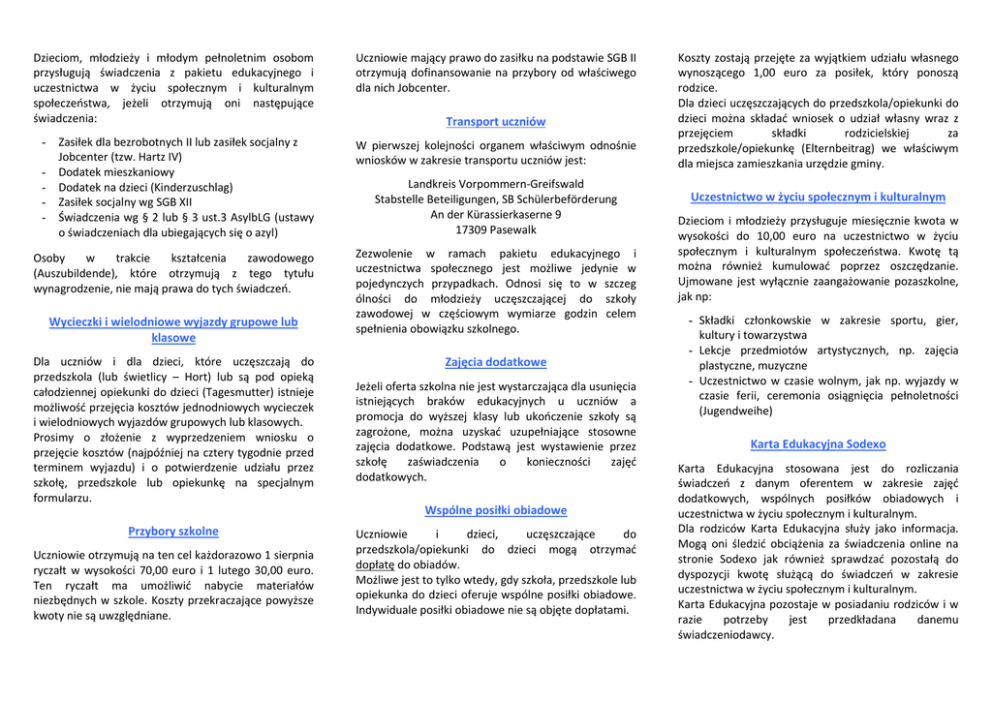 Dzieciom, młodzieży i młodym pełnoletnim osobom przysługują świadczenia z pakietu edukacyjnego i uczestnictwa w życiu społecznym i kulturalnym społeczeństwa, jeżeli otrzymują oni następujące świadczenia: Uczniowie mający prawo do zasiłku na podstawie SGB II otrzymują dofinansowanie na przybory od właściwego dla nich Jobcenter. Zasiłek dla bezrobotnych II lub zasiłek socjalny z Jobcenter (tzw. Hartz IV) Dodatek mieszkaniowy Dodatek na dzieci (Kinderzuschlag) Zasiłek socjalny wg SGB XII Świadczenia wg § 2 lub § 3 ust.3 AsylbLG (ustawy o świadczeniach dla ubiegających się o azyl) W pierwszej kolejności organem właściwym odnośnie wniosków w zakresie transportu uczniów jest: Osoby w trakcie kształcenia zawodowego (Auszubildende), które otrzymują z tego tytułu wynagrodzenie, nie mają prawa do tych świadczeń. Zezwolenie w ramach pakietu edukacyjnego i uczestnictwa społecznego jest możliwe jedynie w pojedynczych przypadkach. Odnosi się to w szczeg ólności do młodzieży uczęszczającej do szkoły zawodowej w częściowym wymiarze godzin celem spełnienia obowiązku szkolnego. - Wycieczki i wielodniowe wyjazdy grupowe lub klasowe Dla uczniów i dla dzieci, które uczęszczają do przedszkola (lub świetlicy – Hort) lub są pod opieką całodziennej opiekunki do dzieci (Tagesmutter) istnieje możliwość przejęcia kosztów jednodniowych wycieczek i wielodniowych wyjazdów grupowych lub klasowych. Prosimy o złożenie z wyprzedzeniem wniosku o przejęcie kosztów (najpóźniej na cztery tygodnie przed terminem wyjazdu) i o potwierdzenie udziału przez szkołę, przedszkole lub opiekunkę na specjalnym formularzu. Przybory szkolne Uczniowie otrzymują na ten cel każdorazowo 1 sierpnia ryczałt w wysokości 70,00 euro i 1 lutego 30,00 euro. Ten ryczałt ma umożliwić nabycie materiałów niezbędnych w szkole. Koszty przekraczające powyższe kwoty nie są uwzględniane. Transport uczniów Landkreis Vorpommern-Greifswald Stabstelle Beteiligungen, SB Schülerbeförderung An der Kürassierkaserne 9 17309 Pasewalk Zajęcia dodatkowe Jeżeli oferta szkolna nie jest wystarczająca dla usunięcia istniejących braków edukacyjnych u uczniów a promocja do wyższej klasy lub ukończenie szkoły są zagrożone, można uzyskać uzupełniające stosowne zajęcia dodatkowe. Podstawą jest wystawienie przez szkołę zaświadczenia o konieczności zajęć dodatkowych. Wspólne posiłki obiadowe Uczniowie i dzieci, uczęszczające do przedszkola/opiekunki do dzieci mogą otrzymać dopłatę do obiadów. Możliwe jest to tylko wtedy, gdy szkoła, przedszkole lub opiekunka do dzieci oferuje wspólne posiłki obiadowe. Indywiduale posiłki obiadowe nie są objęte dopłatami. Koszty zostają przejęte za wyjątkiem udziału własnego wynoszącego 1,00 euro za posiłek, który ponoszą rodzice. Dla dzieci uczęszczających do przedszkola/opiekunki do dzieci można składać wniosek o udział własny wraz z przejęciem składki rodzicielskiej za przedszkole/opiekunkę (Elternbeitrag) we właściwym dla miejsca zamieszkania urzędzie gminy. Uczestnictwo w życiu społecznym i kulturalnym Dzieciom i młodzieży przysługuje miesięcznie kwota w wysokości do 10,00 euro na uczestnictwo w życiu społecznym i kulturalnym społeczeństwa. Kwotę tą można również kumulować poprzez oszczędzanie. Ujmowane jest wyłącznie zaangażowanie pozaszkolne, jak np: - Składki członkowskie w zakresie sportu, gier, kultury i towarzystwa - Lekcje przedmiotów artystycznych, np. zajęcia plastyczne, muzyczne - Uczestnictwo w czasie wolnym, jak np. wyjazdy w czasie ferii, ceremonia osiągnięcia pełnoletności (Jugendweihe) Karta Edukacyjna Sodexo Karta Edukacyjna stosowana jest do rozliczania świadczeń z danym oferentem w zakresie zajęć dodatkowych, wspólnych posiłków obiadowych i uczestnictwa w życiu społecznym i kulturalnym. Dla rodziców Karta Edukacyjna służy jako informacja. Mogą oni śledzić obciążenia za świadczenia online na stronie Sodexo jak również sprawdzać pozostałą do dyspozycji kwotę służącą do świadczeń w zakresie uczestnictwa w życiu społecznym i kulturalnym. Karta Edukacyjna pozostaje w posiadaniu rodziców i w razie potrzeby jest przedkładana danemu świadczeniodawcy. Składanie wniosków Właściwe siedziby Wnioski o świadczenia należy składać odpowiednio wcześnie aby umożliwić ich terminowe opracowanie. W szczególności dla odbiorców świadczeń z SGB II, SGB XII i AsylbLG z reguły nie jest możliwe składanie wniosków z mocą wsteczną! Formularze wniosków otrzymają Państwo u naszych pracowników w naszych siedzibach i w Jobcenter. Formularze wniosków znajdują się również w internecie na stronie Powiatu Vorpommern-Greifswald www.kreis-vg.de. Istnieje możliwość uzyskania osobiście porady w godzinach urzędowania: Wtorek 9:00 do 12:00 i 14:00 do 18:00 Czwartek 9:00 do 12:00 i 14:00 do 16:00 Odbiorcy dodatku mieszkaniowego, dodatku na dzieci i świadczeń z Jobcenter z SGB II składają wnioski w wydziale ds. Społecznych (Sozialamt / SG Bildung und Teilhabe) w następujących lokalizacjach: Feldstraße 85a, 17489 Greifswald Pakiet edukacyjny i uczestnictwa społecznego (dla Greifswald, Greifswalder Umland, Amt Jarmen-Tutow i Amt Peenetal-Loitz) Podstawowe informacje Powiatu Vorpommern-Greifswald Pestalozzistraße 45, 17438 Wolgast (dla Anklam, Wolgast i Wyspa Uznam) An der Kürrassierkaserne 9, 17309 Pasewalk (dla Uecker-Randow) Odbiorcy świadczeń z SGB XII składają wnioski u właściwego dla świadczeń podstawowych pracownika. Loefflerstraße 8, 17489 Greifswald (UniversitätsPeenetal/Loitz) Termin poza godzinami urzędowania należy uzgodnić wcześniej z danym pracownikiem. und Hansestadt Greifswald, Amt Leipziger Allee 26, 17389 Anklam (obszar byłe Ostvorpommern, Amt Jarmen/Tutow) An der Kürrassierkaserne 9, 17309 Pasewalk Numery telefonów poszczególnych pracowników znajdują się na stronie