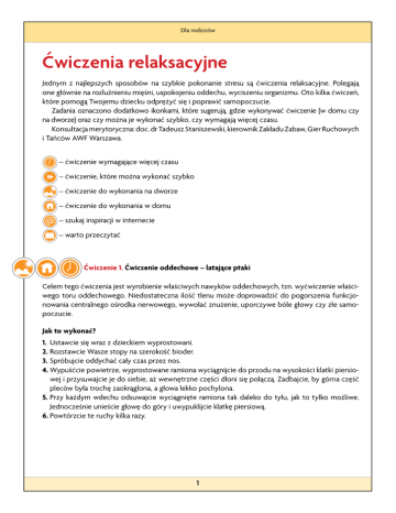 Dla rodziców Ćwiczenia relaksacyjne Jednym z najlepszych sposobów na szybkie pokonanie stresu są ćwiczenia relaksacyjne. Polegają one głównie na rozluźnieniu mięśni, uspokojeniu oddechu, wyciszeniu organizmu. Oto kilka ćwiczeń, które pomogą Twojemu dziecku odprężyć się i poprawić samopoczucie. Zadania oznaczono dodatkowo ikonkami, które sugerują, gdzie wykonywać ćwiczenie (w domu czy na dworze) oraz czy można je wykonać szybko, czy wymagają więcej czasu. Konsultacja merytoryczna: doc. dr Tadeusz Staniszewski, kierownik Zakładu Zabaw, Gier Ruchowych i Tańców AWF Warszawa. – ćwiczenie wymagające więcej czasu – ćwiczenie, które można wykonać szybko – ćwiczenie do wykonania na dworze – ćwiczenie do wykonania w domu – szukaj inspiracji w internecie – warto przeczytać Ćwiczenie 1. Ćwiczenie oddechowe – latające ptaki Celem tego ćwiczenia jest wyrobienie właściwych nawyków oddechowych, tzn. wyćwiczenie właściwego toru oddechowego. Niedostateczna ilość tlenu może doprowadzić do pogorszenia funkcjonowania centralnego ośrodka nerwowego, wywołać znużenie, uporczywe bóle głowy czy złe samopoczucie. Jak to wykonać? 1. Ustawcie się wraz z dzieckiem wyprostowani. 2.Rozstawcie Wasze stopy na szerokość bioder. 3.Spróbujcie oddychać cały czas przez nos. 4.Wypuśćcie powietrze, wyprostowane ramiona wyciągnijcie do przodu na wysokości klatki piersiowej i przysuwajcie je do siebie, aż wewnętrzne części dłoni się połączą. Zadbajcie, by górna część pleców była trochę zaokrąglona, a głowa lekko pochylona. 5.Przy każdym wdechu odsuwajcie wyciągnięte ramiona tak daleko do tyłu, jak to tylko możliwe. Jednocześnie unieście głowę do góry i uwypuklijcie klatkę piersiową. 6.Powtórzcie te ruchy kilka razy. 1 Dla rodziców • Ćwiczenia relaksacyjne Ćwiczenie 2. Relaks na kocu Jak to wykonać? 1. Poproś, by dziecko ułożyło się wygodnie na kocu lub dywanie (nogi wyciągnięte swobodnie, głowa oparta na małej poduszce, ramiona wzdłuż tułowia). 2.Teraz wydawaj dziecku kolejne polecenia: • zegnij lewe ramię, tak by naprężyć mięsień (biceps) – jesteś silny, bardzo silny, naprężaj mięsień mocno (przez kilka sekund); a teraz jesteś słaby, rozluźnij napięte mięśnie, połóż z powrotem rękę na kocu; • to samo wykonaj prawą ręką; • naciśnij, jak możesz najmocniej, pięścią lewej ręki na klocek (z tworzywa sztucznego) położony po Twojej lewej stronie – jesteś silny, twoje mięśnie są napięte; a teraz rozluźnij mięśnie, jesteś znowu słaby, nie naciskaj już, czujesz ulgę – mięśnie rozluźniły się; • zrób to samo, tylko pięścią prawej ręki; • teraz odpocznij chwilę, leż spokojnie i oddychaj spokojnie, twoje ręce odpoczywają; • włóż klocek pod kolano zgiętej lewej nogi i mocno ściśnij nogę w kolanie, a teraz noga słabnie, rozluźniasz mięśnie, wypuszczasz klocek; • to samo ćwiczenie wykonaj prawą nogą; • teraz napełnij powietrzem brzuch – wciągnij mocno powietrze w płuca i napnij brzuch jak balon, mocno, a teraz wypuść powietrze, rozluźnij mięśnie; • naciśnij mocno głową na poduszkę, na której leżysz, głowa jest bardzo silna, naciskasz mocno, a teraz rozluźnij mięśnie, głowa już nie naciska na poduszkę, odpoczywa; • teraz marszczysz mocno czoło, jakbyś był niezadowolony, a teraz rozluźnij mięśnie, niech odpoczną, czoło jest gładkie; • spróbuj teraz zacisnąć mocno powieki, jeszcze mocniej, a teraz rozluźnij je, odpocznij; • zaciśnij mocno szczęki, zęby dotykają zębów; górna i dolna szczęka są silne, zęby mocno naciskają na siebie; a teraz rozluźnij szczęki; • ułóż wargi w mały „ryjek świnki” i napnij mocno mięśnie ust, a teraz rozluźnij je. Ćwiczenie 3. Odprężenie oczu To ćwiczenie powinien wykonywać każdy, kto przez dłuższy czas wytęża wzrok, np. podczas pracy przy komputerze, w trakcie czytania, pisania. Ćwiczenie wykonujemy ok. 1 minuty. Jak to wykonać? 1. Poleć swemu dziecku, by: • roztarło dłonie jedna o drugą, aż poczuje przyjemne ciepło; • następnie niech przyłoży dłonie do oczu tak, aby odciąć dopływ światła; • teraz niech otworzy oczy pod dłońmi i wpatruje się w ciemny obraz. 2.Następnie poproś dziecko, by zaobserwowało, jak oczy i głowa odprężają się i pojawiają się wyciszenie oraz całkowity spokój. 2 Dla rodziców • Ćwiczenia relaksacyjne Ćwiczenie 4. Masaż nóg Jak to wykonać? 1. Poproś dziecko, aby położyło się na plecach z nogami zgiętymi w kolanach. 2.Masuj powoli łydkę od pięty do kolana. 3.Po krótkiej przerwie powoli ściskaj palcami piętę, potem łydkę. Skończ przy kolanie. 4.Następnie szybko poklepuj łydkę od pięty do kolana luźno rozstawionymi palcami. 5.Zrób pauzę i znów powoli ściskaj łydkę od pięty do kolana. 6.Teraz głaszcz łydkę od pięty do kolana. 7.Wykonaj masaż drugiej nogi. 8.Teraz możecie zamienić się rolami: wydawaj dziecku polecenia jak w punktach od 1 do 7. Ćwiczenie 5. Odpoczynek dla pleców Jak to wykonać? 1. Usiądźcie na podłodze. Poproś dziecko, by zajęło miejsce przed Tobą. 2.Wykonaj czynności zgodnie ze słowami wierszyka: Pisała pani na maszynie A, B, C…, – naśladuj pisanie na maszynie Przyszło stado słoni, – naśladuj krok słoni zamkniętymi pięściami Potem stado koni, – naśladuj tętent kopyt otwartymi dłońmi Przyszła pani na szpileczkach, – delikatnie uderzaj w plecy palcami Z gryzącymi psami, – lekko szczyp plecy Świeciło jasne słonko, – zatocz na plecach koło Padał deszczyk,– lekko stukaj plecy opuszkami Czujesz dreszczyk? – połaskocz dziecko w kark Autor nieznany 3.A teraz zmiana – dziecko masuje plecy mamy lub taty. 3