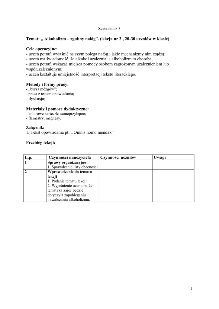 1 Scenariusz 3 Temat: „ Alkoholizm – zgubny nałóg