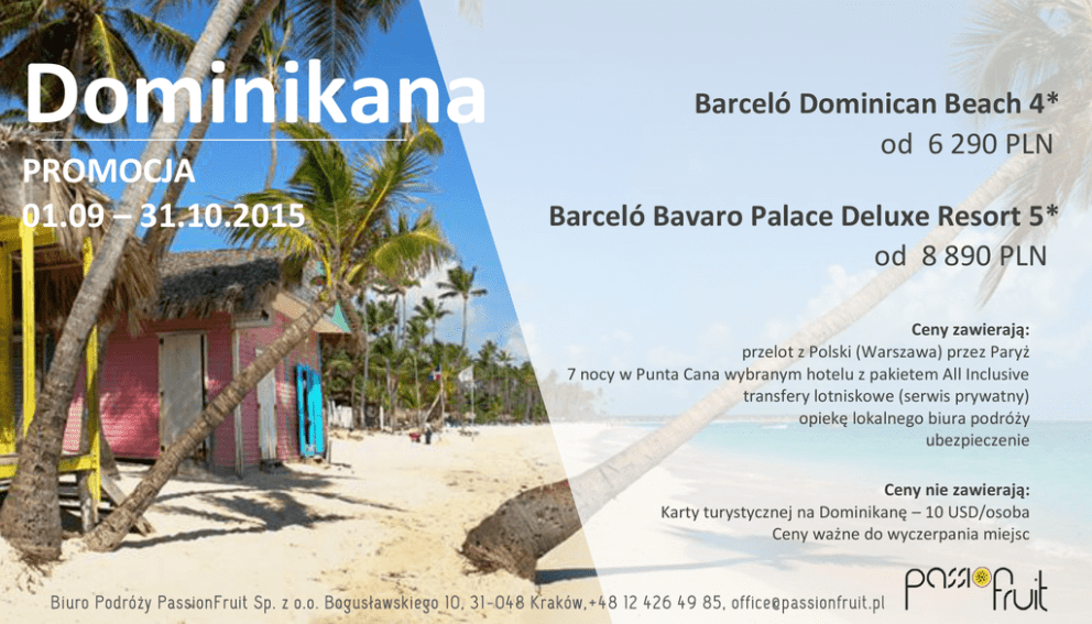 Dominikana PROMOCJA 01.09 – 31.10.2015 Barceló Dominican Beach 4* od 6 290 PLN Barceló Bavaro Palace Deluxe Resort 5* od 8 890 PLN Ceny zawierają: przelot z Polski (Warszawa) przez Paryż 7 nocy w Punta Cana wybranym hotelu z pakietem All Inclusive transfery lotniskowe (serwis prywatny) opiekę lokalnego biura podróży ubezpieczenie Ceny nie zawierają: Karty turystycznej na Dominikanę – 10 USD/osoba Ceny ważne do wyczerpania miejsc Biuro Podróży PassionFruit Sp. z o.o. Bogusławskiego 10, 31 -048 Kraków,+4 8 12 426 49 85, [email protected]
