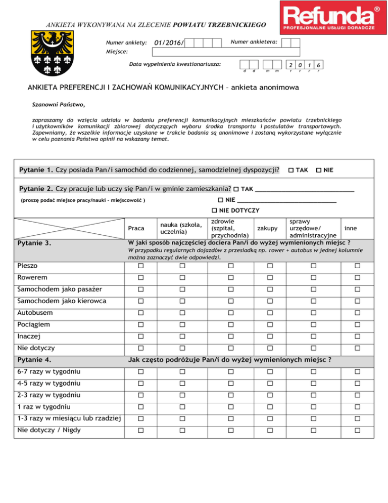 ANKIETA WYKONYWANA NA ZLECENIE POWIATU TRZEBNICKIEGO Numer ankiety: Numer ankietera: 01/2016/ Miejsce: Data wypełnienia kwestionariusza: d d m m 2 0 1 6 r r r r ANKIETA PREFERENCJI I ZACHOWAŃ KOMUNIKACYJNYCH – ankieta anonimowa Szanowni Państwo, zapraszamy do wzięcia udziału w badaniu preferencji komunikacyjnych mieszkańców powiatu trzebnickiego i użytkowników komunikacji zbiorowej dotyczących wyboru środka transportu i postulatów transportowych. Zapewniamy, że wszelkie informacje uzyskane w trakcie badania są anonimowe i zostaną wykorzystane wyłącznie w celu poznania Państwa opinii na wskazany temat. Pytanie 1. Czy posiada Pan/i samochód do codziennej, samodzielnej dyspozycji? TAK NIE Pytanie 2. Czy pracuje lub uczy się Pan/i w gminie zamieszkania? TAK __________________________ NIE __________________________ (proszę podać miejsce pracy/nauki – miejscowość ) NIE DOTYCZY zdrowie sprawy (szpital, zakupy urzędowe/ inne przychodnia) administracyjne W jaki sposób najczęściej dociera Pan/i do wyżej wymienionych miejsc ? Praca Pytanie 3. nauka (szkoła, uczelnia) W przypadku regularnych dojazdów z przesiadką np. rower + autobus w jednej kolumnie można zaznaczyć dwie odpowiedzi. Pieszo Rowerem Samochodem jako pasażer Samochodem jako kierowca Autobusem Pociągiem Inaczej Nie dotyczy Pytanie 4. Jak często podróżuje Pan/i do wyżej wymienionych miejsc ? 6-7 razy w tygodniu 4-5 razy w tygodniu 2-3 razy w tygodniu 1 raz w tygodniu 1-3 razy w miesiącu lub rzadziej Nie dotyczy / Nigdy ANKIETA WYKONYWANA NA ZLECENIE POWIATU TRZEBNICKIEGO Pytanie 5. Proszę wskazać w tabeli poniżej cechy (postulaty), które Pana/i zdaniem są istotne dla prawidłowego funkcjonowania komunikacji zbiorowej, w skali od 1 do 5, gdzie: 1 – nieistotny a 5 bardzo istotny. ODPOWIEDZI PROSZĘ UDZIELIĆ W TABELI PONIŻEJ Pytanie 6. Proszę dokonać oceny jak w Pana/i odczuciu cechy (postulaty) z pytania 7 są realizowane w komunikacji funkcjonującej na obszarze powiatu trzebnickiego? ODPOWIEDZI PROSZĘ UDZIELIĆ W TABELI PONIŻEJ Pytanie 7. Które postulaty powinny zostać poprawione w celu zachęcenia do korzystania z transportu zbiorowego? – proszę podać max 3 cechy (postulaty) ODPOWIEDZI PROSZĘ UDZIELIĆ W TABELI PONIŻEJ Tabela do pytania 5, 6 i 7 proszę udzielić odpowiedzi do każdej cechy Pytanie 5. Istotność postulatów Postulaty transportowe wraz z krótkim opisem 1- nieistotny 5 - bardzo istotny Pytanie 6. Ocena postulatów 1 – bardzo słabo 2 – słabo 3 – dostatecznie 4 – dobrze 5 – bardzo dobrze Pytanie 7. MAX 3 odpowiedzi Bezpośredniość - możliwość przejazdu do celu bez przesiadania się 1 2 3 4 5 1 2 3 4 5 Częstotliwość - odstępy czasu między odjazdami 1 2 3 4 5 1 2 3 4 5 Dostępność - odległość z/do przystanku 1 2 3 4 5 1 2 3 4 5 Koszt - wysokość opłaty taryfowej 1 2 3 4 5 1 2 3 4 5 Niezawodność - pewność dojechania do celu 1 2 3 4 5 1 2 3 4 5 Punktualność - zgodność odjazdów z rozkładem jazdy 1 2 3 4 5 1 2 3 4 5 Rytmiczność - równomierny odstęp między odjazdami w tym samym kierunku 1 2 3 4 5 1 2 3 4 5 Czas podróży- całkowity czas przemieszczenia się do celu 1 2 3 4 5 1 2 3 4 5 Wygoda - komfort przebywania w pojeździe i oczekiwania na przystanku 1 2 3 4 5 1 2 3 4 5 Informacja - dostęp do informacji o transporcie publicznym w Internecie, w pojeździe, na przystankach 1 2 3 4 5 1 2 3 4 5 Bezpieczeństwo – zarówno oczekiwania na przystanku 1 2 3 4 5 1 2 3 4 5 1 2 3 4 5 1 2 3 4 5 w pojeździe, jak i podczas Dostosowanie pojazdów do przewozu osób niepełnosprawnych Płeć kobieta mężczyzna Aktywność zawodowa Wiek do 19 lat 20 – 27 lat prowadzi własną działalność gospodarczą pracuje i uczy się/studiuje pracuje i jest na rencie/emeryturze pracuje nie pracuje uczeń / student emeryt /rencista GMINA ZAMIESZKANIA Trzebnica Żmigród Wisznia Mała Inna Oborniki Śl. Prusice Zawonia 28 – 49 lat 50 – 64 lat powyżej 64 lat Wykształcenie wyższe policealne oraz średnie zawodowe średnie ogólnokształcące zasadnicze zawodowe gimnazjalne, podstawowe i niższe UWAGI :