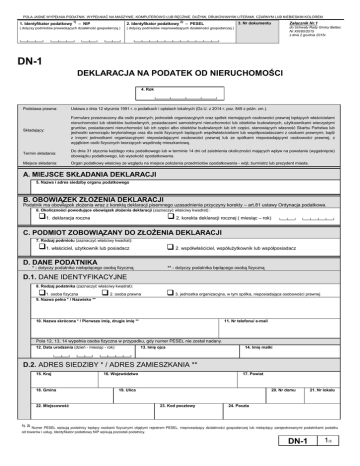 POLA JASNE WYPEŁNIA PODATNIK. WYPEŁNIAĆ NA MASZYNIE, KOMPUTEROWO LUB RĘCZNIE, DUŻYMI, DRUKOWANYMI LITERAMI, CZARNYM LUB NIEBIESKIM KOLOREM. 1. Identyfikator podatkowy 1) – NIP 2. Identyfikator podatkowy ( dotyczy podmiotów prowadzących działalność gospodarczą ) 2) – PESEL Załącznik Nr.1 3. Nr dokumentu do Uchwały Rady Gminy Bełżec Nr XIII/80/2015 z dnia 2 grudnia 2015r. ( dotyczy podmiotów nieprowadzących działalności gospodarczej ) _ _ DN-1 DEKLARACJA NA PODATEK OD NIERUCHOMOŚCI 4. Rok Podstawa prawna: Ustawa z dnia 12 stycznia 1991 r. o podatkach i opłatach lokalnych (Dz.U. z 2014 r. poz. 849 z późn. zm.). Składający: Formularz przeznaczony dla osób prawnych, jednostek organizacyjnych oraz spółek niemających osobowości prawnej będących właścicielami nieruchomości lub obiektów budowlanych, posiadaczami samoistnymi nieruchomości lub obiektów budowlanych, użytkownikami wieczystymi gruntów, posiadaczami nieruchomości lub ich części albo obiektów budowlanych lub ich części, stanowiących własność Skarbu Państwa lub jednostki samorządu terytorialnego oraz dla osób fizycznych będących współwłaścicielami lub współposiadaczami z osobami prawnymi, bądź z innymi jednostkami organizacyjnymi nieposiadającymi osobowości prawnej lub ze spółkami nieposiadającymi osobowości prawnej, z wyjątkiem osób fizycznych tworzących wspólnotę mieszkaniową. Termin składania: Do dnia 31 stycznia każdego roku podatkowego lub w terminie 14 dni od zaistnienia okoliczności mających wpływ na powstanie (wygaśnięcie) obowiązku podatkowego, lub wysokość opodatkowania. Miejsce składania: Organ podatkowy właściwy ze względu na miejsce położenia przedmiotów opodatkowania - wójt, burmistrz lub prezydent miasta. A. MIEJSCE SKŁADANIA DEKLARACJI 5. Nazwa i adres siedziby organu podatkowego B. OBOWIĄZEK ZŁOŻENIA DEKLARACJI Podatnik ma obowiązek złożenia wraz z korektą deklaracji pisemnego uzasadnienia przyczyny korekty – art.81 ustawy Ordynacja podatkowa. 6. Okoliczności powodujące obowiązek złożenia deklaracji (zaznaczyć właściwy kwadrat) : 1. deklaracja roczna 2. korekta deklaracji rocznej ( miesiąc – rok) C. PODMIOT ZOBOWIĄZANY DO ZŁOŻENIA DEKLARACJI 7. Rodzaj podmiotu (zaznaczyć właściwy kwadrat): 1. właściciel, użytkownik lub posiadacz 2. współwłaściciel, współużytkownik lub współposiadacz D. DANE PODATNIKA * - dotyczy podatnika niebędącego osobą fizyczną ** - dotyczy podatnika będącego osobą fizyczną D.1. DANE IDENTYFIKACYJNE 8. Rodzaj podatnika (zaznaczyć właściwy kwadrat): 1. osoba fizyczna 9. Nazwa pełna * / Nazwisko ** 2. osoba prawna 3. jednostka organizacyjna, w tym spółka, nieposiadająca osobowości prawnej 10. Nazwa skrócona * / Pierwsze imię, drugie imię ** 11. Nr telefonu/ e-mail Pola 12, 13, 14 wypełnia osoba fizyczna w przypadku, gdy numer PESEL nie został nadany. 13. Imię ojca 12. Data urodzenia (dzień - miesiąc - rok) 14. Imię matki D.2. ADRES SIEDZIBY * / ADRES ZAMIESZKANIA ** 15. Kraj 18. Gmina 22. Miejscowość 16. Województwo 17. Powiat 19. Ulica 20. Nr domu 23. Kod pocztowy 21. Nr lokalu 24. Poczta 1), 2) Numer PESEL wpisują podatnicy będący osobami fizycznymi objętymi rejestrem PESEL, nieprowadzący działalności gospodarczej lub niebędący zarejestrowanymi podatnikami podatku od towarów i usług. Identyfikator podatkowy NIP wpisują pozostali podatnicy. DN-1 1/3 POLA JASNE WYPEŁNIA PODATNIK. WYPEŁNIAĆ NA MASZYNIE, KOMPUTEROWO LUB RĘCZNIE, DUŻYMI, DRUKOWANYMI LITERAMI, CZARNYM LUB NIEBIESKIM KOLOREM. E. DANE DOTYCZĄCE PRZEDMIOTÓW OPODATKOWANIA NIEPODLEGAJĄCYCH ZWOLNIENIU E.1. POWIERZCHNIA GRUNTÓW Stawka podatku zł, Podstawa opodatkowania w m2 (ha) 1. Związane z prowadzeniem działalności gospodarczej, bez względu na sposób zakwalifikowania w ewidencji gruntów i budynków 2. Pod wodami powierzchniowymi stojącymi lub wodami powierzchniowymi płynącymi jezior 3) i zbiorników sztucznych 3. Pozostałe, w tym zajęte na prowadzenie odpłatnej statutowej działalności pożytku publicznego przez organizacje pożytku publicznego 4. Niezabudowane objęte obszarem rewitalizacji o którym mowa w ustawie z dnia Kwota podatku 26. 25. , , 29. , 30. , ha , 32. 31. m2 34. gr 27. m2 28. zł, gr 33. , , ,35. ,36. , , 9 października 2015 r. o rewitalizacji ( Dz.U. 2015 poz.1777 ) i położone na terenach, dla których miejscowy plan zagospodarowania przestrzennego przewiduje przeznaczenie pod zabudowę mieszkaniową, usługową albo zabudowę o przeznaczeniu mieszanym obejmującym wyłącznie te rodzaje zabudowy, jeżeli od dnia wejścia w życie tego planu w odniesieniu do tych gruntów upłynął okres 4 lat, a w tym czasie nie zakończono budowy zgodnie z przepisami prawa budowlanego m2 , , E.2. POWIERZCHNIA BUDYNKÓW LUB ICH CZĘŚCI Stawka podatku Podstawa opodatkowania Kwota podatku 2 wm 1. Budynki mieszkalne - ogółem zł, 37. m2 w tym kondygnacji o wysokości: - od 1,40 do 2,20 m (zaliczyć 50% powierzchni) - powyżej 2,20 m 2. Związane z prowadzeniem działalności gospodarczej oraz budynki mieszkalne lub ich części zajęte na prowadzenie działalności gospodarczej - ogółem w tym kondygnacji o wysokości: - od 1,40 do 2,20 m (zaliczyć 50% powierzchni) - powyżej 2,20 m 3. Zajęte na prowadzenie działalności gospodarczej w zakresie obrotu kwalifikowanym materiałem siewnym - ogółem w tym kondygnacji o wysokości: - od 1,40 do 2,20 m (zaliczyć 50% powierzchni) - powyżej 2,20 m 4. Związane z udzielaniem świadczeń zdrowotnych w rozumieniu przepisów o działalności leczniczej, zajęte przez podmioty udzielające tych świadczeń - ogółem w tym kondygnacji o wysokości: zł, gr 38. 39. , , 40. m2 41. m2 42. 43. 44. m2 45. m2 , , , , 48. 49. m2 46. m2 47. , m2 , 50. m2 51. m2 52. 53. m2 - od 1,40 do 2,20 m (zaliczyć 50% powierzchni) 55. m2 - powyżej 2,20 m 56. 54. , , , , 58. 59. m2 m2 5. Pozostałe, w tym zajęte na