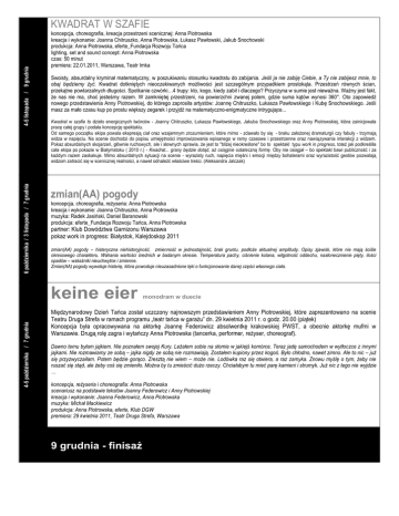 6 października / 3 listopada / 7 grudnia 4-5 listopada / 9 grudnia KWADRAT W SZAFIE koncepcja, choreografia, kreacja przestrzeni scenicznej: Anna Piotrowska kreacja i wykonanie: Joanna Chitruszko, Anna Piotrowska, Łukasz Pawłowski, Jakub Snochowski produkcja: Anna Piotrowska, eferte_Fundacja Rozwoju Tańca lighting, set and sound concept: Anna Piotrowska czas: 50 minut premiera: 22.01.2011, Warszawa, Teatr Imka Swoisty, absurdalny kryminał matematyczny, w poszukiwaniu stosunku kwadratu do zabijania. Jeśli ja nie zabiję Ciebie, a Ty nie zabijesz mnie, to obaj będziemy żyć. Kwadrat dotkniętych nieoczekiwanych możliwości jest szczególnym przypadkiem prostokąta. Przestrzeń równych ścian, przekątne powtarzalnych długości. Spotkanie czwórki…4 trupy: kto, kogo, kiedy zabił i dlaczego? Przyczyna w sumie jest nieważna. Ważny jest fakt, że nas nie ma, choć jesteśmy razem. W zamkniętej przestrzeni, na powierzchni zwanej polem, gdzie suma kątów wynosi 360°. Oto zapowiedź nowego przedstawienia Anny Piotrowskiej, do którego zaprosiła artystów: Joannę Chitruszko, Łukasza Pawłowskiego i Kubę Snochowskiego. Jeśli masz za mało czasu kup po prostu większy zegarek i przyjdź na matematyczno-enigmatyczne intrygujące... Kwadrat w szafie to dzieło energicznych twórców - Joanny Chitruszko, Łukasza Pawłowskiego, Jakuba Snochowskiego oraz Anny Piotrowskiej, która zainicjowała pracę całej grupy i podała koncepcję spektaklu. Od samego początku ekipa powala ekspresją ciał oraz wzajemnym zrozumieniem, które mimo - zdawało by się - braku założonej dramaturgii czy fabuły - trzymają widza w napięciu. Na scenie dochodzi do popisu umiejętności improwizowania wpisanego w ramy czasowe i przestrzenne oraz nawiązywania interakcji z widzem. Pokaz absurdalnych skojarzeń, głównie ruchowych, ale i słownych sprawia, że jest to "bliżej nieokreślone" bo to spektakl typu work in progress, toteż jak podkreśliła cała ekipa po pokazie w Białymstoku ( 2010 r.) - Kwadrat... grany będzie dotąd, aż osiągnie ostateczną formę. Oby nie osiągał – bo spektakl bawi publiczność i za każdym razem zaskakuje. Mimo absurdalnych sytuacji na scenie - wyrazisty ruch, napięcia mięśni i emocji między bohaterami oraz wyrazistość gestów pozwalają widzom zatracić się w scenicznej realności, a nawet odnaleźć właściwe treści. (Aleksandra Jatczak) zmian(AA) pogody koncepcja, choreografia, reżyseria: Anna Piotrowska kreacja i wykonanie: Joanna Chitruszko, Anna Piotrowska muzyka: Radek Jasiński, Daniel Baranowski produkcja: eferte_Fundacja Rozwoju Tańca, Anna Piotrowska partner: Klub Dowództwa Garnizonu Warszawa pokaz work in progress: Białystok, Kalejdoskop 2011 zmian(AA) pogody – histeryczna niehistoryjność, zmienność w jednostajność, brak gruntu, podłoże aktualnej amplitudy. Opisy zjawisk, które nie mają ściśle okresowego charakteru. Wahania wartości średnich w badanym okresie. Temperatura pachy, ciśnienie kolana, wilgotność oddechu, nasłonecznienie pięty, ilości opadów – wskaźniki nieuchwytne i zmienne. Zmian(AA) pogody wywołuje histerię, która powoduje nieuzasadnione lęki o funkcjonowanie danej części własnego ciała. 4-5 października / 7 grudnia keine eier monodram w duecie Międzynarodowy Dzień Tańca został uczczony najnowszym przedstawieniem Anny Piotrowskiej, które zaprezentowano na scenie Teatru Druga Strefa w ramach programu „teatr tańca w garażu” dn. 29 kwietnia 2011 r. o godz. 20.00 (piątek) Koncepcja była opracowywana na aktorkę Joannę Federowicz absolwentkę krakowskiej PWST, a obecnie aktorkę mufmi w Warszawie. Drugą rolę zagra i wytańczy Anna Piotrowska (tancerka, performer, reżyser, choreograf). Dawno temu byłam jajkiem. Nie poznałem swojej Kury. Leżałem sobie na słomie w jakiejś komórce. Teraz jadę samochodem w wytłoczce z innymi jajkami. Nie rozmawiamy ze sobą – jajka nigdy ze sobą nie rozmawiają. Zostałem kupiony przez kogoś. Było chłodno, nawet zimno. Ale to nic – już się przyzwyczaiłam. Potem będzie gorąco. Zresztą nie wiem – może nie. Lodówka raz się otwiera, a raz zamyka. Znowu myślę o tym, żeby nie ruszać się stąd, ale żeby coś się zmieniło. Można by tu zmieścić dużo rzeczy. Chciałabym tu mieć parę kamieni i strumyk. Już nic z tego nie wyjdzie … koncepcja, reżyseria i choreografia: Anna Piotrowska scenariusz na podstawie tekstów Joanny Federowicz i Anny Piotrowskiej kreacja i wykonanie: Joanna Federowicz, Anna Piotrowska muzyka: Michał Mackiewicz produkcja: Anna Piotrowska, eferte, Klub DGW premiera: 29 kwietnia 2011, Teatr Druga Strefa, Warszawa 9 grudnia - finisaż