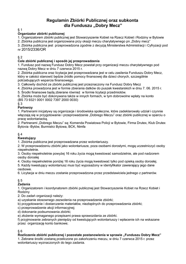 Regulamin Zbiórki Publicznej oraz subkonta dla Funduszu „Dobry Mecz” §1 Organizator zbiórki publicznej 1. Organizatorem zbiórki publicznej jest Stowarzyszenie Kobiet na Rzecz Kobiet i Rodziny w Bytowie 2. Zbiórka publiczna jest organizowana przy okazji meczu charytatywnego pn „Dobry mecz” 3. Zbiórka publiczna jest przeprowadzona zgodnie z decyzją Ministerstwa Administracji i Cyfryzacji pod nr 2015/2336/OR §2 Cele zbiórki publicznej i sposób jej przeprowadzenia 1. Fundusz pod nazwą Fundusz Dobry Mecz powstał przy organizacji meczu charytatywnego pod nazwą Dobry Mecz w dniu 7 czerwca 2015 r. 2. Zbiórka publiczna oraz licytacja jest przeprowadzana jest w celu zasilenia Funduszu Dobry Mecz, który w całości stanowić będzie źródło pomocy finansowej dla dzieci chorych, szczególnie potrzebujących wsparcia finansowego. 3. Całkowity dochód ze zbiórki publicznej jest przeznaczony na Fundusz Dobry Mecz 4. Zbiórka prowadzona jest w formie zbierania datków do puszek kwestarskich w dniu 7. 06. 2015 r. 5. Środki finansowe będą zbierane również w formie licytacji przedmiotów. 6. Zbiórka może być dokonywana także w innych formach, w tym dobrowolne wpłaty na konto (BS 73 9321 0001 0002 7397 2000 0030) §3 Partnerzy 1. Partnerami inicjatywy są organizacje i środowiska społeczne, które zadeklarowały udział i czynnie włączają się w przygotowanie i przeprowadzenie „Dobrego Meczu” oraz zbiórki publicznej w oparciu o pracę wolontariacką. 2. Partnerami „Dobrego Meczu” są: Komenda Powiatowa Policji w Bytowie, Firma Drutex, Klub Drutex Bytovia -Bytów, Burmistrz Bytowa, BCK, Nimfa §4 Kwestujący 1. Zbiórka publiczna jest przeprowadzana przez wolontariuszy. 2. W przeprowadzeniu zbiórki jako wolontariusze, poza osobami dorosłymi, mogą uczestniczyć osoby niepełnoletnie. 3. Osoby niepełnoletnie powyżej 16 roku życia mogą kwestować samodzielnie, ale pod nadzorem osoby dorosłej 4. Osoby niepełnoletnie poniżej 16 roku życia mogą kwestować tylko pod opieką osoby dorosłej. 5. Każdy kwestujący wolontariusz musi być wyposażony w identyfikator zawierający jego dane osobowe. 6. Licytacja w dniu meczu zostanie przeprowadzona przez przedstawiciela jednego z partnerów. §5 Zadania 1. Organizatorem i koordynatorem zbiórki publicznej jest Stowarzyszenie Kobiet na Rzecz Kobiet i Rodziny 2. Do zadań organizacji należy: a) uzyskanie stosownego zezwolenia na przeprowadzenie zbiórki; b) przygotowanie i dostarczenie materiałów, niezbędnych do przeprowadzenia zbiórki; c) przeprowadzenie akcji informacyjnej; d) dokonanie podsumowania zbiórki; e) złożenie wymaganego przepisami prawa sprawozdania ze zbiórki. f) przyjmowanie zebranych pieniędzy od kwestujących wolontariuszy i wpłacenie ich na wskazane przez organizację konto bankowe; §6 Rozliczenie zbiórki publicznej i pozostałe postanowienia w sprawie „Funduszu Dobry Mecz” 1. Zebrane środki zostaną przeliczone po zakończeniu meczu, w dniu 7 czerwca 2015 r. przez wolontariuszy wyznaczonych do tego zadania. 2. Całość pieniędzy złożona zostanie na subkoncie Stowarzyszenia Kobiet na Rzecz Kobiet i Rodziny. 3. Środki, które zostaną złożone na koncie organizacji oraz będą zasilać je w późniejszym czasie czasowym, w całości przeznaczone zostaną na pomoc finansową dzieci chorych, szczególnie chorych przewlekle, potrzebujących wsparcia finansowego; 4. Jako dziecko uznaje się osobę do 18 roku życia. 5. Pomoc finansowa skierowana będzie do dzieci chorych na podstawie dokumentacji medycznej, zaświadczeń potwierdzających chorobę oraz udokumentowania trudnej sytuacji materialnej rodziny dziecka. 6. Po pomoc finansową mogą zgłaszać się tylko mieszkańcy Gminy Bytów. 7. Pomoc finansowa nastąpi na podstawie przedłożonych rachunków/ faktur oraz innych dokumentów potwierdzających niezbędne wydatki. 8. Pomoc finansowa jest ograniczona możliwościami organizacji. 9. O pomocy finansowej decydować będzie Komisja powołana przy organizacji, w skład której wejdą trzy członkinie organizacji oraz przedstawiciele partnerów. 10. Komisja zbierać się będzie według potrzeb, jednak co najmniej niż raz w miesiącu. 11. Pisma z prośbą o pomoc finansową kierować należy na adres: Stowarzyszenie Kobiet na Rzecz Kobiet i Rodziny, ul. Miła 26, 77-100 Bytów. Tel. kontaktowy: 691 400 761 §7 Zapisy końcowe 1. Organizacja zastrzega sobie prawo do zmian regulaminu. 2. Regulamin został zatwierdzony Uchwałą Zarządu organizacji z dn. 03.06.2015r.