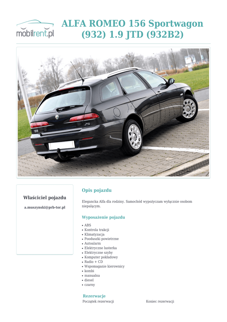 ALFA ROMEO 156 Sportwagon (932) 1.9 JTD (932B2) Opis pojazdu Właściciel pojazdu [email protected] Elegancka Alfa dla rodziny. Samochód wypożyczam wyłącznie osobom niepalącym. Wyposażenie pojazdu ● ● ● ● ● ● ● ● ● ● ● ● ● ● ABS Kontrola trakcji Klimatyzacja Pooduszki powietrzne Autoalarm Elektryczne lusterka Elektryczne szyby Komputer pokładowy Radio + CD Wspomaganie kierownicy kombi manualna diesel czarny Rezerwacje Początek rezerwacji Koniec rezerwacji