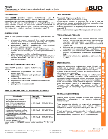 PC-MW Warstwa sczepna, hydrofobowa, o właściwościach antykorozyjnych karta technologiczna 2016 OPIS PRODUKTU DANE PRODUKTU Masa PC-MW (warstwa sczepna, hydrofobowa) jest 1komponentową mieszanką cementu, drobnych kruszyw kwarcowych oraz polimerów proszkowych zwiększających przyczepność. Masa PC-MW jest wysokoelastyczna i wysokoplastyczna oraz tworzy mostek sczepny dla większości podłoży stosowanych w budownictwie. Wiąże hydraulicznie i mostkuje naprężenia między starym betonem i świeżymi warstwami naprawczymi typu PC. Wydajność: 2 kg/m2 przy grubości 1mm Opakowania: worek dwuwarstwowy 25 kg Wygląd: suchy proszek o granulacji od 0 do 3 mm (w zależności od rodzaju uziarnienia), jednolicie zabarwiony, bez zbryleń i zanieczyszczeń mechanicznych. Warunki składowania: w oryginalnych opakowaniach, w temp. powyżej 5°C. Okres przydatności do użycia: 12 miesięcy od daty produkcji. ZASTOSOWANIE MASA PC-MW (warstwa sczepna, hydrofobowa) przeznaczona jest do: wykonywania warstwy sczepnej (tzw mostka sczepnego) łączącej nową cienkowarstwową posadzkę lub zaprawy naprawcze np. Masy PC z istniejącym podłożem. wykonywania warstwy wodoodpornej, uszczelniającej przeciwko wodzie gruntowej i naporowej do uszczelniania stropów garaży podziemnych, ścian budowli, zbiorników wodnych, budowli hydrotermicznych i innych jako wodoodporny podkład pod płytki ceramiczne Masa PC-MW jest przeznaczona do robót budowlanych w zakresie temperatur od 0°C do +25°C, wewnątrz i na zewnątrz budynków. PRZYGOTOWANIE PODŁOŻA Podłoże łączone z nową warstwą musi być czyste, nośne i stabilne oraz nie zmrożone. Niezbędne jest usunięcie zanieczyszczeń powstałych w ruchu kołowym: plam oleju i paliw, śladów hamowania i farb znakujących. Zalecane jest ześrutowanie lub frezowanie podłoża oraz wypełnienie wszelkich ubytków i uszkodzeń. Niezbędne jest zlikwidowanie chłonności podłoża poprzez zagruntowanie powierzchni preparatem RG . Minimalna wytrzymałość podłoża na odrywanie to 1,5 MPa. SPOSÓB UŻYCIA WŁAŚCIWOŚCI WARSTWY SCZEPNEJ Najbardziej efektywnym rozkładaniem Masy PC-MW na podłożu jest z użyciem ostrej szczotki. Można również rozprowadzać Masę pacą, pędzlem lub metodą natrysku. Warstwa sczepna w ciągu 10 minut od rozłożenia musi być zabudowana nową posadzką. Uwaga! Prace z Masą PC-MW muszą być wykonywane zgodnie z powyższą instrukcją. Brak staranności w wykonaniu i nieprzestrzeganie zaleceń producenta skutkują osłabieniem mostka sczepnego i rozwarstwieniem posadzki. Prace posadzkarskie należy prowadzić zgodnie z zasadami sztuki budowlanej, normami i zaleceniami producenta. Producent nie odpowiada za szkody wynikłe z nieumiejętnego lub niezgodnego z przeznaczeniem użycia wyrobu. Masa PC-MW (warstwa sczepna, hydrofobowa) posiada: zwiększoną przyczepność do betonu zapraw oraz stali odporność na działanie wody gruntowej i naporowej podwyższoną elastyczność właściwości antykorozyjne (zawiera inhibitory korozji) mały skurcz, podwyższoną mrozoodporność, DANE TECHNICZNE MASY PC-MW WRSTWY SCZEPNEJ INFORMACJE DODATKOWE Właściwości Przyczepność do podłoża betonowego kondycjonowanego 28 dni, chropowatość uzyskana przez szlifowanie siatką ścierną gradacji „80” Przyczepność międzywarstwowa do podłoża betonowego jak wyżej oraz do zaprawy PC-MW z włóknem Przyczepność międzywarstwowa do podłoża betonowego jak wyżej oraz do kleju do płytek C2TE tabela badań nr 167/2008 metoda 2000 Wartość wymagana Oznaczono ≥ 0,5 [Mpa] 0.96±0,01[Mpa] ≥ 0,5 [Mpa] 0.94±0,01[Mpa] ≥ 0,5 [Mpa] 0.87±0,01[Mpa] Preparat Masa PC-MW Warstwa Sczepna jest przyjazny środowisku, ekologiczny i nie zawiera substancji niebezpiecznych. Prace na zewnątrz obiektów nie powinny być prowadzone przy dużym nasłonecznieniu oraz silnym wietrze. Temperatura podłoża nie powinna być wyższa niż +25°C. W celu zwiększenia wodoszczelności i wydłużenia czasu żywotności produktu zalecane jest zabezpieczenie wierzchniej warstwy Preparatem RG-DC (hydrofobowym) badań zgodnie z PN-EN 1542 : Strona 1 z 2 ITBUD Zakład Nowych Materiałów Budowlanych Sp. z o.o. ul. Ksawerów 21,02-656 Warszawa tel. (022) 843-37-81 tel. (022) 566 42 65 mail:[email protected] www.itbud.com.pl PC-MW Warstwa sczepna, hydrofobowa, o właściwościach antykorozyjnych karta technologiczna 2016 ŚRODKI OSTROŻNOŚCI PODCZAS PRAC Z MASĄ PC-MW WARSTWA SCZEPNA Należy pamiętać o zapewnieniu dobrej wentylacji w pomieszczeniach gdzie wykonywane są prace. Należy zaopatrzyć pracowników w odpowiednie środki ochrony osobistej tj: odpowiednie nie nasiąkliwe obuwie, nie nasiąkliwe kombinezony, okulary ochronne, maseczki na usta z pochłaniaczami oraz nakrycie głowy i rękawice ochronne. Komponenty stosować z dala od ognia i źródeł ciepła. Przechowywać poza zasięgiem dzieci. W przypadku kontaktu preparatów ze skórą lub oczami natychmiast przemyć dużą ilością wody z mydłem a skórę natłuścić kremem. DOKUMENTY ODNIESIENIA DEKLARACJA WŁASCIWOŚCI UŻYTKOWYCH NR 01/PC-MW/2016/sczepna Strona 2 z 2 ITBUD Zakład Nowych Materiałów Budowlanych Sp. z o.o. ul. Ksawerów 21,02-656 Warszawa tel. (022) 843-37-81 tel. (022) 566 42 65 mail:[email protected] www.itbud.com.pl