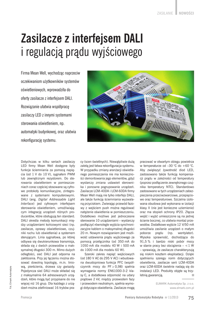 ZASILANIE NOWOŚCI Zasilacze z interfejsem DALI i regulacją prądu wyjściowego Firma Mean Well, wychodząc naprzeciw oczekiwaniom użytkowników systemów oświetleniowych, wprowadziła do oferty zasilacze z interfejsem DALI. Rozwiązanie ułatwia współpracę zasilaczy LED z innymi systemami sterowania oświetleniem, np. automatyki budynkowej, oraz ułatwia Fot. Elmark Automatyka rekonfigurację systemu. Dotychczas w kilku seriach zasilaczy LED firmy Mean Well dostępne były funkcje ściemniania za pomocą napięcia (od 1 V do 10 V), sygnałem PWM lub zewnętrznym rezystorem. Do sterowania oświetleniem w pomieszczeniach coraz częściej stosowane są cyfrowe protokoły komunikacyjne, zintegrowane z systemami komputerowymi. DALI (ang. Digital Addressable Light Interface) jest cyfrowym interfejsem sterowania oświetleniem, umożliwiającym integrację urządzeń różnych producentów, które obsługują ten standard. DALI określa metody komunikacji między urządzeniami końcowymi sieci (np. zasilacze, oprawy oświetleniowe, czujniki ruchu lub oświetlenia) a systemem sterującym. Linia sygnałowa, po której odbywa się dwukierunkowa transmisja, składa się z dwóch przewodów o maksymalnej długości 300 m. Mimo dużych odległości, sieć DALI jest odporna na zakłócenia. Przy jej łączeniu można stosować dowolną topologię, m.in. liniową, pierścienia, drzewa czy gwiazdy. Pojedyncza sieć DALI może składać się z maksymalnie 64 adresowanych urządzeń, które mogą być przypisane do nie więcej niż 16 grup. Dla każdego z urządzeń można zdefiniować 16 trybów praPromocja cy (scen świetlnych). Niewątpliwie dużą zaletą jest łatwa rekonfiguracja systemu. W przypadku zmiany aranżacji oświetlanego pomieszczenia nie ma konieczności demontowania jego elementów, gdyż wystarczy zmiana ustawień sterownika i ponowne pogrupowanie urządzeń. Zasilacze LCM-40DA i LCM-60DA firmy Mean Well mają nie tylko interfejs DALI, ale także funkcję ściemniania wyzwalaną przyciskiem. Zwierając przewód fazowy z wejściem push można regulować natężenie oświetlenia w pomieszczeniu. Dodatkowo możliwe jest jednoczesne sterowanie 10 urządzeniami – wystarczy podłączyć równolegle wyjścia synchronizacyjne kablem o maksymalnej długości 20 m. Nowym rozwiązaniem jest możliwość ustawienia prądu wyjściowego za pomocą przełącznika (od 350 mA do 1050 mA dla modelu 40 W i 500 mA do 1000 mA dla modelu 60 W). Szeroki zakres napięć wejściowych (od 180 V AC do 295 V AC) i wbudowana dwustopniowa funkcja PFC (współczynnik mocy do PF ≥ 0,98) spełnia wymagania normy EN61000-3-2 klasy C, a dodatkowa odporność na udary prądowe 2 kV, między przewodem fazy i przewodem neutralnym, spełnia wymogi dotyczące oświetlenia. Zasilacze mogą pracować w otwartym obiegu powietrza w temperaturze od –30 °C do +60 °C. Aby zwiększyć żywotność diod LED, zastosowano także funkcję kompensacji prądu w zależności od temperatury (poprzez podłączenie zewnętrznego czujnika temperatury NTC). Standardowo zastosowano w tych urządzeniach zabezpieczenia przeciwzwarciowe, przepięciowe oraz temperaturowe. Szczelna izolowana obudowa jest wykonana w izolacji klasy II (nie jest konieczne uziemienie) oraz ma stopień ochrony IP20. Złącza wejść i wyjść umieszczone są na jednej ścianie bocznej, co ułatwia montaż przewodów. Dodatkowe wyjście 12 V/50 mA umożliwia zasilanie urządzeń o małym poborze prądu (np. wentylator). Wysoka sprawność, dochodząca do 91,5 % i bardzo niski pobór mocy w stanie pracy bez obciążenia – < 1 W – sprawiają, że zasilacze charakteryzują się niskim kosztem eksploatacji. Dzięki spełnieniu szeregu norm dotyczących oświetlenia, zasilacze serii LCM-40DA oraz LCM-60DA świetnie nadają się do instalacji LED. Produkty objęte są trzyletnią gwarancją. ELMARK Automatyka Sp. z o.o. www.elmark.com.pl Pomiary Automatyka Robotyka nr 11/2013 75