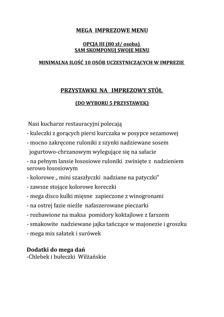 MEGA IMPREZOWE MENU OPCJA III (80 zł/ osoba) SAM SKOMPONUJ SWOJE MENU MINIMALNA ILOŚĆ 10 OSÓB UCZESTNICZĄCYCH W IMPREZIE PRZYSTAWKI NA IMPREZOWY STÓŁ (DO WYBORU 5 PRZYSTAWEK) Nasi kucharze restauracyjni polecają - kuleczki z gorących piersi kurczaka w posypce sezamowej - mocno zakręcone ruloniki z szynki nadziewane sosem jogurtowo-chrzanowym wylegujące się na sałacie - na pełnym lansie łososiowe ruloniki zwinięte z nadzieniem serowo łososiowym - kolorowe „ mini szaszłyczki nadziane na patyczki” - zawsze stojące kolorowe koreczki - mega disco kulki mięsne zapieczone z winogronami - na ostrej fazie nieźle nafaszerowane pieczarki - rozbawione na maksa pomidory koktajlowe z farszem - smakowite nadziewane jajka tańczące w majonezie i groszku - mega mix sałatek i surówek Dodatki do mega dań -Chlebek i bułeczki Wilżańskie NIEŹLE ZAKRĘCONE SOSY (DO WYBORU 1 SOS) - jogurtowo koperkowy - majonezowo tatarski - pomidorowo ziołowy PŁONĄCE KORYTO MIĘS STAROPOLSKICH ( oprócz wymienionych poniżej mięs w korycie mogą znajdować się również w/w wybrane pozycje z dań z drobiu, wieprzowiny itp.) Najwyższej jakości swojskie mięsa ze specjalnych marynat oraz wyroby wiejskie według staropolskich przepisów: Paleta mięs do wyboru: WYBIERZ 4 POZYCJE -schab pieczony -karkówka z pieca -kotlet schabowy -kotlet de volaille -szaszłyk drobiowy -szaszłyk wieprzowy -pierś z kurczaka -golonka z pieca -kiełbasy swojskie oplatane plastrami boczku -kaszanki oplatane plastrami boczku -żeberka pieczone DODATKI DO KORYTA - ziemniaki opiekane z sosem Tzatziki LUB Płonąca Deska rybaka RYBY Z NASZYCH STAWÓW ( do wyboru) Wilżańskie świeżutkie rybki z własnej hodowli, które serwujemy prosto z patelni, pieca, grilla oraz z naszej wędzarni. talarki, ziemniaki opiekane oraz cała zielenina wszystkie sosy. - Sandacz filet - Okoń filet - Miętus królewski RYBY MORSKIE - Halibut - Dorsz DODATKI DO DESKI - frytki DESKE I KORYTO MOŻNA SERWOWAĆ PÓŁ NA PÓŁ KĄCIK ŁASUCHA (DO WYBORU 2 POZYCJE) - stunigowane kolorowe całkiem niezłe babki z owocami - rurki dziurki z nadzieniem coctailowym - kolorowe galaretki z ubitą śmietaną - całkiem pijane ciasto dozwolone od lat 18 Tematyczne erotyczne torty w różnych kształtach dozwolone od 18 lat. Koszt: 50zł/kg Klub Muzyczny Mega Music Wilga ul. Stawowa 9, 08-470 Wilga Informacja tel. +48 512 464 846 (kontakt w godzinach od 08:00 do 18:00) mail. [email protected]