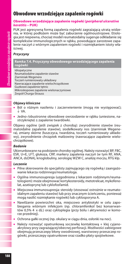 Obwodowe wrzodziejące zapalenie rogówki Obwodowe wrzodziejące zapalenie rogówki Obwodowe wrzodziejące zapalenie rogówki (peripheral ulcerative keratitis – PUK) PUK jest agresywną formą zapalenia rogówki zagrażającą utratą widzenia, w której podłożem może być zaburzenie ogólnoustrojowe. Etiologia jest niepewna, chociaż model reumatoidalny sugeruje odkładanie się kompleksów immunologicznych w rąbku, powodujące zarostowe zapalenie naczyń z wtórnym zapaleniem rogówki i rozmiękaniem istoty właściwej. Przyczyny Ramka 7.4. Przyczyny obwodowego wrzodziejącego zapalenia rogówki Idiopatyczne Reumatiodalne zapalenie stawów Ziarniniak Wegenera Toczeń rumieniowaty układowy Nawracające zapalenie wielochrząstkowe Guzkowe zapalenie tętnic Mikroskopowe zapalenie wielonaczyniowe Zespół Churga-Strauss Objawy kliniczne • Ból o różnym nasileniu i zaczerwienienie (mogą nie występować); ↓ VA. • Jedno-/obustronne obwodowe owrzodzenie w rąbku (uniesione, nastrzyknięte) ± zapalenie twardówki. Objawy ogólne (jeśli związek z chorobą): zwyrodnienie stawów (reumatoidalne zapalenie stawów), siodełkowaty nos (ziarniniak Wegenera), zmiany skórne (łuszczyca, twardzina, toczeń rumieniowaty układowy), zwyrodnienie chrząstek małżowiny (nawracające zapalenie wielochrząstkowe). Badanie Ukierunkowane na podstawie choroby ogólnej. Należy rozważyć BP, FBC, ESR, U+E, LFT, glukoza, CRP, markery zapalenia naczyń (w tym RF, ANA, ANCA, dsDNA), krioglobuliny, serologię WZW C, analizę moczu, RTG klp. Leczenie • Pilne skierowanie do specjalisty zajmującego się rogówką i zaangażowanie lekarza rodzinnego/reumatologa. • Ogólna immunosupresja (uzgodniona z lekarzem rodzinnym/reumatologiem): może obejmować kortykosteroidy, metotreksat, mykofenolat, azatioprynę lub cyklofosfamid. • Miejscowa immunosupresja: steroidy (stosować ostrożnie w reumatoidalnym zapaleniu stawów) lub przy znacznym ścieńczeniu, ponieważ mogą nasilić rozmiękanie rogówki) lub cyklosporyna A. • Nawilżanie powierzchni oka, miejscowo antybiotyki w celu zapobiegania wtórnym infekcjom (np. chloramfenikol bez konserwantów 0,5% 4 x dz.) oraz cykloplegia (przy bólu i aktywności w komorze przedniej). • Ochrona gałki ocznej (np. okulary w ciągu dnia, osłonki na noc). • Należy rozważyć opatrunkową soczewkę kontaktową + klej cyjanoakrylowy przy zagrażającej/obecnej perforacji. Możliwości zabiegowe obejmują przeszczepy błony owodniowej, warstwowy przeszczep rogówki, przeszczepy opatrunkowe oraz rzadko płaty spojówkowe. 188 Obwodowe ścieńczenie Obwodowe ścieńczenie bez zapalenia lub utraty nabłonka; typu „soczewki kontaktowej”; nie ulega perforacji Obwodowe wrzodziejące zapalenie rogówki Obwodowe zapalenie; utrata nabłonka, nacieki i utrata istoty właściwej; może ulec perforacji Ostre zapalenie istoty właściwej Zapalenie o nagłym początku z naciekami w istocie właściwej, jednak często zachowany nabłonek Zapalenie rogówki twardniejące Stopniowe przyrąbkowe zmętnienie istoty właściwej rogówki graniczące z obszarem zapalenia twardówki Rozmiękanie rogówki Ścieńczenie istoty właściwej („rozpływ rogówki”) ± powiązane z zapaleniem Wrzód Moorena Jest rzadką postacią obwodowego wrzodziejącego zapalenia rogówki prawdopodobnie o etiologii autoimmunologicznej. Czasem jest związany z zapaleniem wątroby typu C. Występuje w dwóch postaciach: ograniczona jest typowa dla osób w średnim/starszym wieku rasy białej i objawia się jednostronnymi zmianami dobrze odpowiadającymi na leczenie; bardziej agresywna postać zwykle jest obserwowana u młodych Afrykanów, jest obustronna i może postępować pomimo leczenia. 7. Rogówka Tabela 7.12. Powikłania rogówkowe zapalenia reumatiodalnego stawów Objawy kliniczne • Ból, światłowstręt, ↓ VA. • Jedno-/obustronne postępujące obwodowe owrzodzenie; brzeg wiodący podminowuje nabłonek; szare nacieki na brzegu; owrzodzenie postępuje centralnie i wokół brzegu rogówki; istota właściwa pod owrzodzeniem rozmięka. Uwaga: nie ma przyrąbkowej przezroczystej strefy i nie współwystępuje zapalenie twardówki (jedynie zapalenie spojówki i nadtwardówki). Powikłania: perforacja; zapalenie błony naczyniowej; zaćma; w końcowym stadium rogówka jest ścieńczała i ulega zespojówkowieniu. Badania Badania ogólne wykluczające zapalenie wątroby C lub inną związaną z PUK (peripheral ulcerative keratitis) chorobę układową (jak wyżej). Leczenie • Miejscowo steroidy (np. deksametazon 0,1% bez konserwantów co godzinę). • Ogólna immunosupresja: steroidoterapia, cyklofosfamid lub cyklosporyna A (w porozumieniu z lekarzem rodzinnym/reumatologiem); interferon, jeśli współistnieje zapalenie wątroby typu C (według wskazówek lekarza hepatologa). • Także miejscowo antybiotyki, cykloplegia, ochrona gałki ocznej, opatrunkowa soczewka kontaktowa ± klej tkankowy oraz zabiegi chirurgiczne, takie jak w obwodowym wrzodziejącym zapaleniu rogówki związanym z chorobą ogólnoustrojową. 189