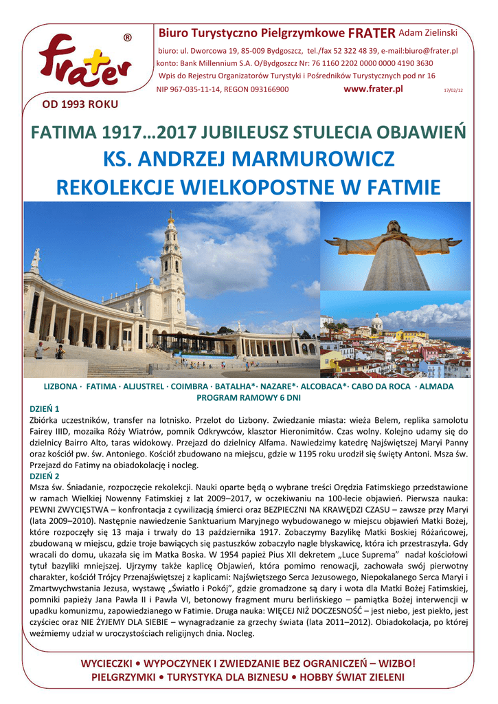 Biuro Turystyczno Pielgrzymkowe FRATER Adam Zielinski biuro: ul. Dworcowa 19, 85-009 Bydgoszcz, tel./fax 52 322 48 39, e-mail:[email protected] konto: Bank Millennium S.A. O/Bydgoszcz Nr: 76 1160 2202 0000 0000 4190 3630 Wpis do Rejestru Organizatorów Turystyki i Pośredników Turystycznych pod nr 16 NIP 967-035-11-14, REGON 093166900 www.frater.pl 17/02/12 FATIMA 1917…2017 JUBILEUSZ STULECIA OBJAWIEŃ KS. ANDRZEJ MARMUROWICZ REKOLEKCJE WIELKOPOSTNE W FATMIE LIZBONA · FATIMA · ALJUSTREL · COIMBRA · BATALHA*· NAZARE*· ALCOBACA*· CABO DA ROCA · ALMADA PROGRAM RAMOWY 6 DNI DZIEŃ 1 Zbiórka uczestników, transfer na lotnisko. Przelot do Lizbony. Zwiedzanie miasta: wieża Belem, replika samolotu Fairey IIID, mozaika Róży Wiatrów, pomnik Odkrywców, klasztor Hieronimitów. Czas wolny. Kolejno udamy się do dzielnicy Bairro Alto, taras widokowy. Przejazd do dzielnicy Alfama. Nawiedzimy katedrę Najświętszej Maryi Panny oraz kościół pw. św. Antoniego. Kościół zbudowano na miejscu, gdzie w 1195 roku urodził się święty Antoni. Msza św. Przejazd do Fatimy na obiadokolację i nocleg. DZIEŃ 2 Msza św. Śniadanie, rozpoczęcie rekolekcji. Nauki oparte będą o wybrane treści Orędzia Fatimskiego przedstawione w ramach Wielkiej Nowenny Fatimskiej z lat 2009–2017, w oczekiwaniu na 100-lecie objawień. Pierwsza nauka: PEWNI ZWYCIĘSTWA – konfrontacja z cywilizacją śmierci oraz BEZPIECZNI NA KRAWĘDZI CZASU – zawsze przy Maryi (lata 2009–2010). Następnie nawiedzenie Sanktuarium Maryjnego wybudowanego w miejscu objawień Matki Bożej, które rozpoczęły się 13 maja i trwały do 13 października 1917. Zobaczymy Bazylikę Matki Boskiej Różańcowej, zbudowaną w miejscu, gdzie troje bawiących się pastuszków zobaczyło nagle błyskawicę, która ich przestraszyła. Gdy wracali do domu, ukazała się im Matka Boska. W 1954 papież Pius XII dekretem „Luce Suprema” nadał kościołowi tytuł bazyliki mniejszej. Ujrzymy także kaplicę Objawień, która pomimo renowacji, zachowała swój pierwotny charakter, kościół Trójcy Przenajświętszej z kaplicami: Najświętszego Serca Jezusowego, Niepokalanego Serca Maryi i Zmartwychwstania Jezusa, wystawę „Światło i Pokój”, gdzie gromadzone są dary i wota dla Matki Bożej Fatimskiej, pomniki papieży Jana Pawła II i Pawła VI, betonowy fragment muru berlińskiego – pamiątka Bożej interwencji w upadku komunizmu, zapowiedzianego w Fatimie. Druga nauka: WIĘCEJ NIŻ DOCZESNOŚĆ – jest niebo, jest piekło, jest czyściec oraz NIE ŻYJEMY DLA SIEBIE – wynagradzanie za grzechy świata (lata 2011–2012). Obiadokolacja, po której weźmiemy udział w uroczystościach religijnych dnia. Nocleg. Biuro Turystyczno Pielgrzymkowe FRATER Adam Zielinski biuro: ul. Dworcowa 19, 85-009 Bydgoszcz, tel./fax 52 322 48 39, e-mail:[email protected] konto: Bank Millennium S.A. O/Bydgoszcz Nr: 76 1160 2202 0000 0000 4190 3630 Wpis do Rejestru Organizatorów Turystyki i Pośredników Turystycznych pod nr 16 NIP 967-035-11-14, REGON 093166900 www.frater.pl 17/02/12 DZIEŃ 3 Msza św. Śniadanie. Nauka rekolekcyjna: EUCHARYSTYCZNY KLUCZ – cud na cudami, który zmienia wszystko oraz ZAPRASZANI DO NIEBA – jednak różaniec, szkaplerz, sznur pokutny (2013–2014). Przejazd do wioski Aljustrel. Zwiedzanie miejsc związanych z życiem Hiacynty i Franciszka oraz Łucji. Powrót do Sanktuarium. Nauka rekolekcyjna: POTĘGA RODZINY – domowy Kościół, którego nie przemogą bramy piekła oraz BÓG JEST MIŁOSIERNY – ostatnie słowo należy do Boga, który jest Miłością (2015–2016). Obiadokolacja. Udział w uroczystościach religijnych, nocleg. DZIEŃ 4 Msza św. Śniadanie. Przejazd do Coimbry – dawnej stolicy Portugalii. Tu przez 57 lat żyła w karmelitańskim klasztorze św. Teresy siostra Łucja. Coimbra słynna jest także z najstarszego w Portugalii, bo założonego w 1290 r., uniwersytetu. Zobaczymy również: starówkę, wieżę zegarową Torre, arkadowe budynki Sala Grande dos Actos, w których odbywają się uroczystości akademickie oraz memoriał siostry Łucji. Powrót do Fatimy. Nauka rekolekcyjna: DROGA PRZEZ SERCE – przymierze serc Jezusa, Maryi, naszych (rok 2017). Obiadokolacja. Udział w uroczystościach religijnych dnia. Nocleg. DZIEŃ 5 Msza św. Śniadanie. Pobyt na terenie sanktuarium. Czas na indywidualną adorację. Fakultatywnie wyjazd na wycieczkę do Batalha – Nazare – Alcobaca*(25€): Batalha – zwiedzanie klasztoru Matki Bożej Zwycięskiej - arcydzieła stylu gotyckiego. Podziwiać będziemy kaplicę fundatorów, krużganki królewskie, kapitularz, Niedokończone Kaplice, Grób Nieznanego Żołnierza i refektarz. Nazare – wizyta w pięknym kurorcie położonym na wybrzeżu Atlantyku, między skalistym Cabo Carvoeiro i Cabo Mondego. Według legendy nazwa miejscowości pochodzi od figury Matki Boskiej, którą do miasta w IV wieku przywiózł z Nazaretu pewien mnich. Krótkie zwiedzanie: barokowy kościół Nossa Senhora da Nazaré, mała kaplica Ermida da Memória. Wypoczynek na plaży Praia da Nazaré - szerokim pasie złocistego piasku. Alcobaça - nawiedzimy klasztor Santa Maria de Alcobaça. Zobaczymy także komnaty królewskie z licznymi posągami królów portugalskich i cennymi polichromiami. Obiadokolacja. Udział w wieczornej procesji ze świecami. Nocleg. DZIEŃ 6 Śniadanie. Pożegnanie sanktuarium. Przejazd na Cabo da Roca – najdalej na zachód wysunięty punkt kontynentu europejskiego – położony na urwisku skalnym o wysokości ok. 140 m. Czas wolny. Przejazd inżynieryjnym arcydziełem – mostem 25 Kwietnia przez rzekę Tag do Almady. Msza św. w Sanktuarium Chrystusa Króla. Z podstawy postumentu podziwiać będziemy wspaniałą panoramę Lizbony. Przejazd na lotnisko najdłuższym mostem w Portugali - Vasco Da Gama. Odprawa biletowo - bagażowa. Przelot powrotny. Transfer do miejsca zbiórki. TERMIN: 21-26.03.2017 CENA: 2680 zł ZAPEWNIAMY: • komfortowy