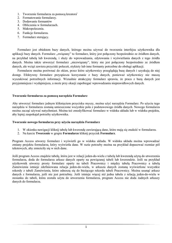 1. 2. 3. 4. 5. 6. 7. Tworzenie formularza za pomocą kreatorai Formatowanie formularzy. Dodawanie formantów Obliczenia w formularzach. Makropolecenia. Funkcje formularza. Formularz sterujący. Formularz jest obiektem bazy danych, którego można używać do tworzenia interfejsu użytkownika dla aplikacji bazy danych. Formularz „związany” to formularz, który jest połączony bezpośrednio ze źródłem danych, na przykład tabelą lub kwerendą, i służy do wprowadzania, edytowania i wyświetlania danych z tego źródła danych. Można także utworzyć formularz „niezwiązany”, który nie jest połączony bezpośrednio ze źródłem danych, ale wciąż zawiera przyciski poleceń, etykiety lub inne formanty potrzebne do obsługi aplikacji. Formularze można porównać do okien, przez które użytkownicy przeglądają bazę danych i uzyskują do niej dostęp. Efektywny formularz przyspiesza korzystanie z bazy danych, ponieważ użytkownicy nie muszą wyszukiwać potrzebnych informacji. Wizualnie atrakcyjny formularz sprawia, że praca z bazą danych jest przyjemniejsza i wydajniejsza, a może przy okazji zapobiegać wprowadzaniu nieprawidłowych danych. Tworzenie formularza za pomocą narzędzia Formularz Aby utworzyć formularz jednym kliknięciem przycisku myszy, można użyć narzędzia Formularz. Po użyciu tego narzędzia w formularzu zostaną umieszczone wszystkie pola z podstawowego źródła danych. Nowego formularza można zacząć używać natychmiast. Można też zmodyfikować formularz w widoku układu lub w widoku projektu, aby lepiej zaspokajał potrzeby użytkownika. Tworzenie nowego formularza przy użyciu narzędzia Formularz 1. W okienku nawigacji kliknij tabelę lub kwerendę zawierającą dane, które mają się znaleźć w formularzu. 2. Na karcie Tworzenie w grupie Formularze kliknij przycisk Formularz. Program Access utworzy formularz i wyświetli go w widoku układu. W widoku układu można wprowadzać zmiany projektu formularza, który wyświetla dane. W razie potrzeby można na przykład dopasować rozmiar pól tekstowych, aby zmieściły się w nich dane. Jeśli program Access znajdzie tabelę, która jest w relacji jeden-do-wielu z tabelą lub kwerendą użytą do utworzenia formularza, doda do formularza arkusz danych oparty na powiązanej tabeli lub kwerendzie. Jeśli na przykład użytkownik utworzy prosty formularz oparty na tabeli Pracownicy i między tabelą Pracownicy a tabelą Zamówienia istnieje zdefiniowana relacja jeden-do-wielu, w arkuszu danych zostaną wyświetlone wszystkie rekordy z tabeli Zamówienia, które odnoszą się do bieżącego rekordu tabeli Pracownicy. Można usunąć arkusz danych z formularza, jeśli nie jest potrzebny. Jeśli istnieje więcej niż jedna tabela z relacją jeden-do-wielu w stosunku do tabeli, która została użyta do utworzenia formularza, program Access nie doda żadnych arkuszy danych do formularza. 1 Rysunek 1. Formularz przy użyciu narzędzia Formularz Tworzenie formularza dzielonego za pomocą narzędzia Formularz dzielony Formularz dzielony udostępnia jednocześnie dwa widoki danych — widok formularza i widok arkusza danych. Formularz dzielony różni się od kombinacji formularz/podformularz tym, że te dwa widoki są połączone z tym samym źródłem danych i zawsze są ze sobą zsynchronizowane. Zaznaczenie pola w jednej części formularza powoduje zaznaczenie tego samego pola w drugiej części formularza. Dane można dodawać, edytować lub usuwać w dowolnej części (pod warunkiem, że można aktualizować źródło rekordów, a użytkownik nie skonfigurował formularza w sposób uniemożliwiający wykonywanie tych akcji). Praca z formularzami dzielonymi daje korzyści wynikające z korzystania z obu rodzajów formularzy w jednym formularzu. Można na przykład użyć części arkusza danych, aby szybko zlokalizować rekord, a następnie użyć części formularza w celu wyświetlenia lub edytowania rekordu. Tworzenie formularza dzielonego za pomocą narzędzia Formularz dzielony: 1. W okienku nawigacji kliknij tabelę lub kwerendę zawierającą dane, które mają się znaleźć w formularzu. Ewentualnie otwórz tabelę lub kwerendę w widoku arkusza danych. 2. Na karcie Tworzenie w grupie Formularze kliknij przycisk Formularz dzielony. Program Access utworzy formularz i wyświetli go w widoku Układ. W widoku Układ można wprowadzać zmiany projektu formularza przy jednoczesnym wyświetlaniu danych. W razie potrzeby można na przykład dopasować rozmiar pól tekstowych, aby zmieściły się w nich dane. 2 Rysunek 2. Formularz dzielony Tworzenie formularza z wieloma rekordami za pomocą narzędzia Wiele elementów Po utworzeniu formularza za pomocą narzędzia Formularz jest w nim w danej chwili wyświetlany jeden rekord. Aby uzyskać formularz wyświetlający wiele rekordów, który można dostosować bardziej niż arkusz danych, można użyć narzędzia Wiele elementów. 1. W okienku nawigacji kliknij tabelę lub kwerendę zawierającą dane, które mają się znaleźć w formularzu. 2. Na karcie Tworzenie w grupie Formularze kliknij przycisk Więcej formularzy, a następnie kliknij pozycję Wiele elementów. Program Access utworzy formularz i wyświetli go w widoku Układ. W widoku Układ można wprowadzać zmiany projektu formularza przy jednoczesnym wyświetlaniu danych. W razie potrzeby można na przykład dopasować rozmiar pól tekstowych, aby zmieściły się w nich dane Po użyciu narzędzia Wiele elementów program Access utworzy formularz przypominający arkusz danych. Dane zostaną rozmieszczone w wierszach i kolumnach i będzie widać więcej niż jeden rekord. Formularz typu Wiele elementów udostępnia więcej opcji dostosowywania niż arkusz danych, w tym możliwość dodawania elementów graficznych, przycisków i innych formantów. 3 Rysunek 3. Formularz - wiele elementów Tworzenie formularza za pomocą Kreatora formularzy Aby mieć więcej możliwości wybierani