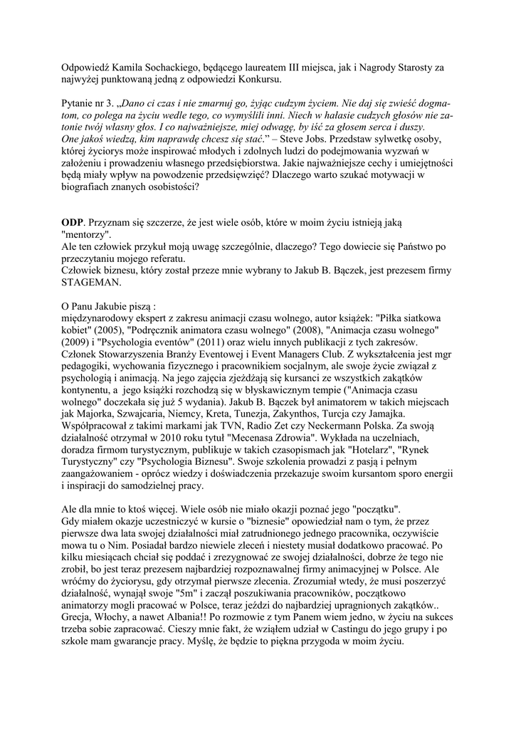Odpowiedź Kamila Sochackiego, będącego laureatem III miejsca, jak i Nagrody Starosty za