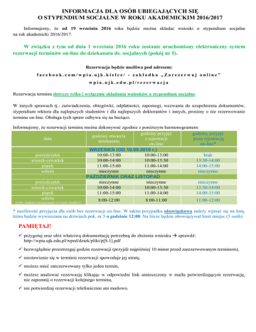 INFORMACJA DLA OSÓB UBIEGAJĄCYCH SIĘ O STYPENDIUM SOCJALNE W ROKU AKADEMICKIM 2016/2017 Informujemy, że od 19 września 2016 roku będzie można składać wnioski o stypendium socjalne na rok akademicki 2016/2017. W związku z tym od dnia 1 września 2016 roku zostanie uruchomiony elektroniczny system rezerwacji terminów on-line do dziekanatu ds. socjalnych (pokój nr 5). Rezerwacja będzie możliwa pod adresem: facebook.com/wpia.ujk.kielce/ - zakładka „Zarezerwuj online” wpia.ujk.edu.pl/rezerwacja Rezerwacja terminu dotyczy tylko i wyłącznie składania wniosków o stypendium socjalne. W innych sprawach tj.: zaświadczenia, obiegówki, odpłatności, zapomogi, wezwania do uzupełnienia dokumentów, stypendium rektora dla najlepszych studentów i dla najlepszych doktorantów i innych, prosimy o nie rezerwowanie terminu on-line. Obsługa tych spraw odbywa się na bieżąco. Informujemy, że rezerwacji terminu można dokonywać zgodnie z poniższym harmonogramem: godziny przyjęć godziny przyjęć godziny otwarcia data z rejestracji poza rejestracją dziekanatu on-line on-line* WRZESIEŃ (OD 19.09.2016 r.) poniedziałek 10:00-13:00 10:00-13:00 brak wtorek-czwartek 10:00-14:00 10:00-13:30 13:30-14:00 piątek 11:00-15:00 11:00-14:00 14:00-15:00 sobota nieczynne nieczynne nieczynne PAŹDZIERNIK ORAZ LISTOPAD poniedziałek nieczynne nieczynne nieczynne wtorek-czwartek 10:00-14:00 10:00-13:30 13:30-14:00 piątek 11:00-15:00 11:00-14:00 14:00-15:00 sobota 8:00-12:00 8:00-11:00 11:00-12:00 (tylko studenci niestacjonarni w czasie zjazdów) * możliwość przyjęcia dla osób bez rezerwacji on-line. W takim przypadku obowiązkowo należy wpisać się na listę, która będzie wywieszana na drzwiach pok. nr 5 o godzinie 12:00. Na liście będzie obowiązywał limit miejsc (5 osób). PAMIĘTAJ! przygotuj oraz ułóż właściwą dokumentację potrzebną do złożenia wniosku sprawdź: http://wpia.ujk.edu.pl/wped/dziek/pliki/p[8.1].pdf bezwzględnie przestrzegaj godzin rezerwacji (przyjdź najpóźniej 10 minut przed zarezerwowanym terminem), niestawienie się w terminie rezerwacji spowoduje jej utratę, możesz mieć zarezerwowany tylko jeden termin, możesz anulować rezerwację klikając w odpowiedni link umieszczony w mailu potwierdzającym rezerwację, nie zapomnij o rezerwacji kolejnego terminu, nie potwierdzaj rezerwacji telefonicznie ani mailowo.