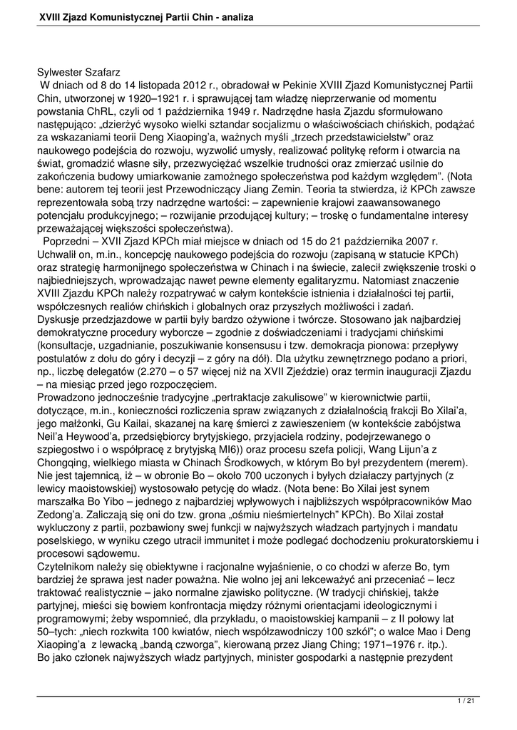 XVIII Zjazd Komunistycznej Partii Chin - analiza Sylwester Szafarz W dniach od 8 do 14 listopada 2012 r., obradował w Pekinie XVIII Zjazd Komunistycznej Partii Chin, utworzonej w 1920–1921 r. i sprawującej tam władzę nieprzerwanie od momentu powstania ChRL, czyli od 1 października 1949 r. Nadrzędne hasła Zjazdu sformułowano następująco: „dzierżyć wysoko wielki sztandar socjalizmu o właściwościach chińskich, podążać za wskazaniami teorii Deng Xiaoping’a, ważnych myśli „trzech przedstawicielstw” oraz naukowego podejścia do rozwoju, wyzwolić umysły, realizować politykę reform i otwarcia na świat, gromadzić własne siły, przezwyciężać wszelkie trudności oraz zmierzać usilnie do zakończenia budowy umiarkowanie zamożnego społeczeństwa pod każdym względem”. (Nota bene: autorem tej teorii jest Przewodniczący Jiang Zemin. Teoria ta stwierdza, iż KPCh zawsze reprezentowała sobą trzy nadrzędne wartości: – zapewnienie krajowi zaawansowanego potencjału produkcyjnego; – rozwijanie przodującej kultury; – troskę o fundamentalne interesy przeważającej większości społeczeństwa). Poprzedni – XVII Zjazd KPCh miał miejsce w dniach od 15 do 21 października 2007 r. Uchwalił on, m.in., koncepcję naukowego podejścia do rozwoju (zapisaną w statucie KPCh) oraz strategię harmonijnego społeczeństwa w Chinach i na świecie, zalecił zwiększenie troski o najbiedniejszych, wprowadzając nawet pewne elementy egalitaryzmu. Natomiast znaczenie XVIII Zjazdu KPCh należy rozpatrywać w całym kontekście istnienia i działalności tej partii, współczesnych realiów chińskich i globalnych oraz przyszłych możliwości i zadań. Dyskusje przedzjazdowe w partii były bardzo ożywione i twórcze. Stosowano jak najbardziej demokratyczne procedury wyborcze – zgodnie z doświadczeniami i tradycjami chińskimi (konsultacje, uzgadnianie, poszukiwanie konsensusu i tzw. demokracja pionowa: przepływy postulatów z dołu do góry i decyzji – z góry na dół). Dla użytku zewnętrznego podano a priori, np., liczbę delegatów (2.270 – o 57 więcej niż na XVII Zjeździe) oraz termin inauguracji Zjazdu – na miesiąc przed jego rozpoczęciem. Prowadzono jednocześnie tradycyjne „pertraktacje zakulisowe” w kierownictwie partii, dotyczące, m.in., konieczności rozliczenia spraw związanych z działalnością frakcji Bo Xilai’a, jego małżonki, Gu Kailai, skazanej na karę śmierci z zawieszeniem (w kontekście zabójstwa Neil’a Heywood’a, przedsiębiorcy brytyjskiego, przyjaciela rodziny, podejrzewanego o szpiegostwo i o współpracę z brytyjską MI6)) oraz procesu szefa policji, Wang Lijun’a z Chongqing, wielkiego miasta w Chinach Środkowych, w którym Bo był prezydentem (merem). Nie jest tajemnicą, iż – w obronie Bo – około 700 uczonych i byłych działaczy partyjnych (z lewicy maoistowskiej) wystosowało petycję do władz. (Nota bene: Bo Xilai jest synem marszałka Bo Yibo – jednego z najbardziej wpływowych i najbliższych współpracowników Mao Zedong’a. Zaliczają się oni do tzw. grona „ośmiu nieśmiertelnych” KPCh). Bo Xilai został wykluczony z partii, pozbawiony swej funkcji w najwyższych władzach partyjnych i mandatu poselskiego, w wyniku czego utracił immunitet i może podlegać dochodzeniu prokuratorskiemu i procesowi sądowemu. Czytelnikom należy się obiektywne i racjonalne wyjaśnienie, o co chodzi w aferze Bo, tym bardziej że sprawa jest nader poważna. Nie wolno jej ani lekceważyć ani przeceniać – lecz traktować realistycznie – jako normalne zjawisko polityczne. (W tradycji chińskiej, także partyjnej, mieści się bowiem konfrontacja między różnymi orientacjami ideologicznymi i programowymi; żeby wspomnieć, dla przykładu, o maoistowskiej kampanii – z II połowy lat 50–tych: „niech rozkwita 100 kwiatów, niech współzawodniczy 100 szkół”; o walce Mao i Deng Xiaoping’a z lewacką „bandą czworga”, kierowaną przez Jiang Ching; 1971–1976 r. itp.). Bo jako członek najwyższych władz partyjnych, minister gospodarki a następnie prezydent 1 / 21 XVIII Zjazd Komunistycznej Partii Chin - analiza (mer) miasta Chongqing, pracował niezwykle aktywnie i stawał się coraz bardziej popularny w partii i w kraju. Był „pupilkiem” mediów chińskich i zagranicznych – szczególnie z uwagi na swe przekonania ideologiczno – programowe i na zdecydowane działania praktyczne. Jego postawa odbiegała dość jaskrawo od oficjalnej linii partyjnej. Nie ukrywał on swego niezadowolenia z wyników polityki reform. Postawę tę można określić jako lewicowo–maoistowską i populistyczną (z domieszką koncepcji socjaldemokratycznych). Bo był prekursorem i promotorem tzw. „nowej lewicy chińskiej” oraz „modelu z Chongqing”. Model ten zakładał, m.in., prowadzenie robót publicznych na wielką skalę (walka z bezrobociem), budowanie tanich mieszkań dla najuboższych, ułatwianie ludności wiejskiej osiedlania się w miastach, kultywowanie tradycji maoistowskiej w kulturze i w sztuce oraz prowadzenie nieubłaganej walki z przestępczością i z korupcją (tzw. Dahei – mocne uderzenie). Swoistą ironią losu Bo jest jednak fakt, że – obecnie – on sam jest oskarżony również o korupcję. Przeciwko niemu wysunięto zarzuty wielkiego kalibru. Świadczy to najdobitniej o tym, iż konkurenci polityczni uznali, że Bo Xilai stanowił dla nich poważne zagrożenie – choć raczej nie pretendował do najwyższych stanowisk w partii i w państwie chińskim. „Afera Bo” nie powinna jednak wywrzeć większego negatywnego wpływu na ewolucję pozjazdową KPCh i ChRL. Obrady XVIII Zjazdu przebiegały w bardzo interesującym i trudnym okresie rozwoju Chin i całej naszej cywilizacji. Po pierwsze, uwidoczniły się dość istotne problemy w polityce wewnętrznej i w rozwoju społeczno–gospodarczym tego supermocarstwa oraz w sytuacji globalnej (wzrost napięcia 